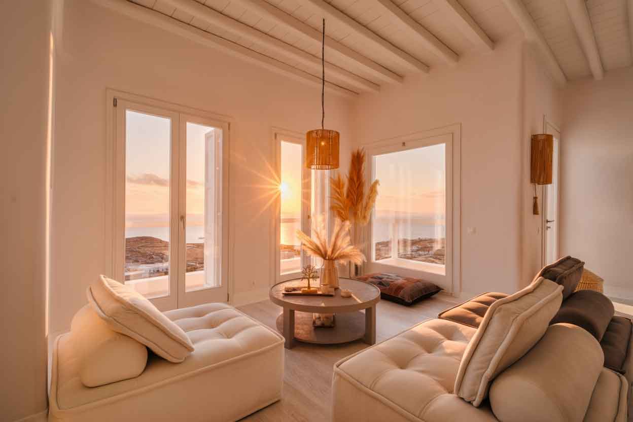 Villa Agatha is a luxurious 500 sqm Myconian villa located in the Kastro area, offering breathtaking Mediterranean sea and sunset views.
