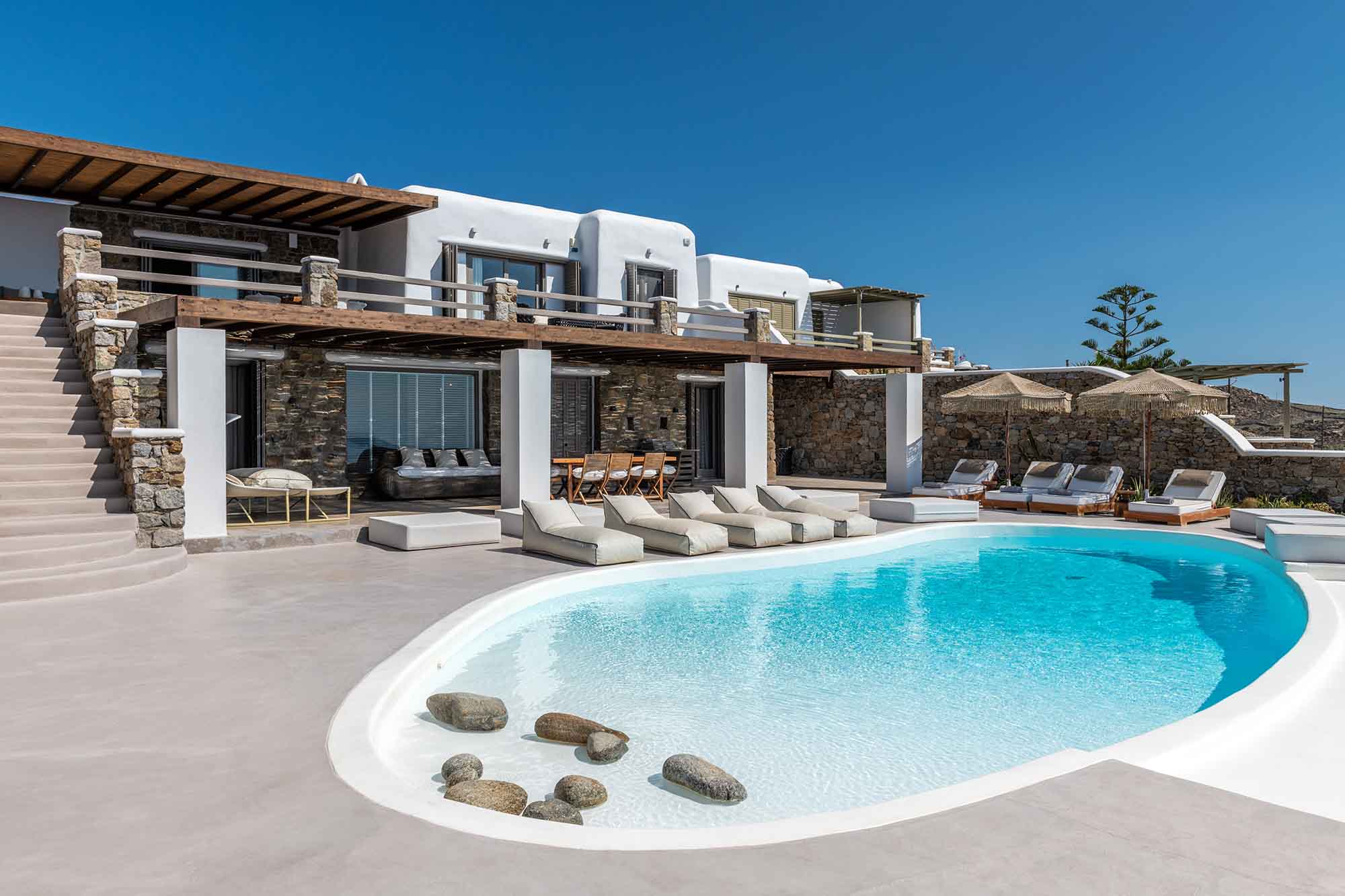 The living areas are all spacious, airy and full of light looking directly to the sea level. The sleeping quarters are all luxurious, and spacious offering privacy and all modern comforts for its guests. The outdoor areas offer two exceptional pool areas, and various corners and amenities for entertainment and much needed relaxation. The large gardens surroundings offer a great ambience for outdoor living and al fresco dining. The sandy beach, just in front of the house, invites guests to celebrate easy summer, while been protected by the winds and the crowds.