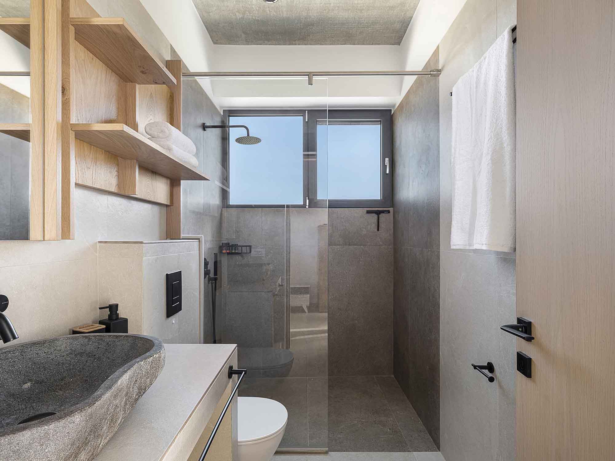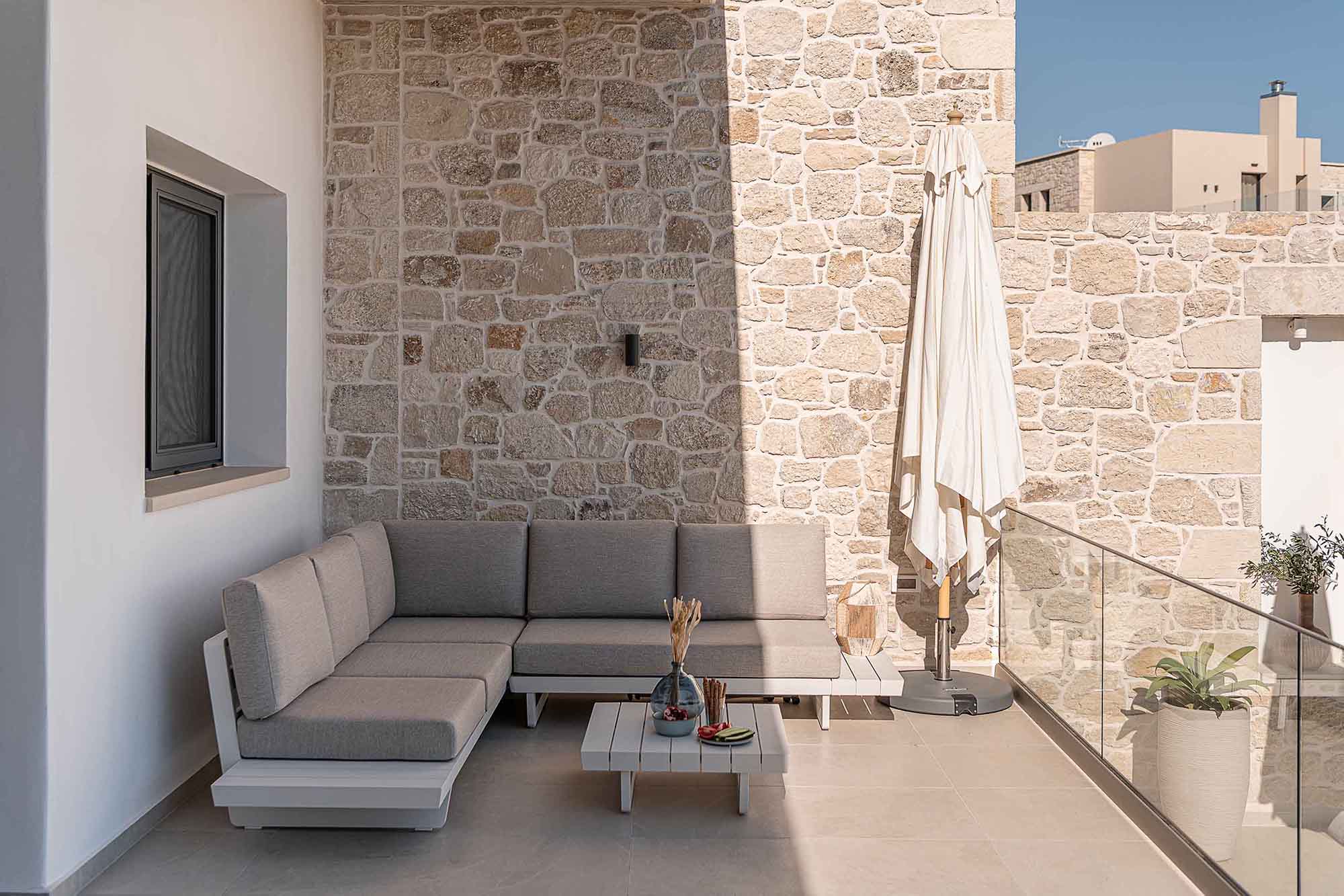 The outdoor area per villas features a private swimming pool with sun loungers and umbrellas, offering a relaxing space to enjoy the Cretan sun. A gas BBQ and an outdoor dining area for six guests provide the perfect setting for outdoor meals with panoramic sea and sunset views. Private parking is also available.