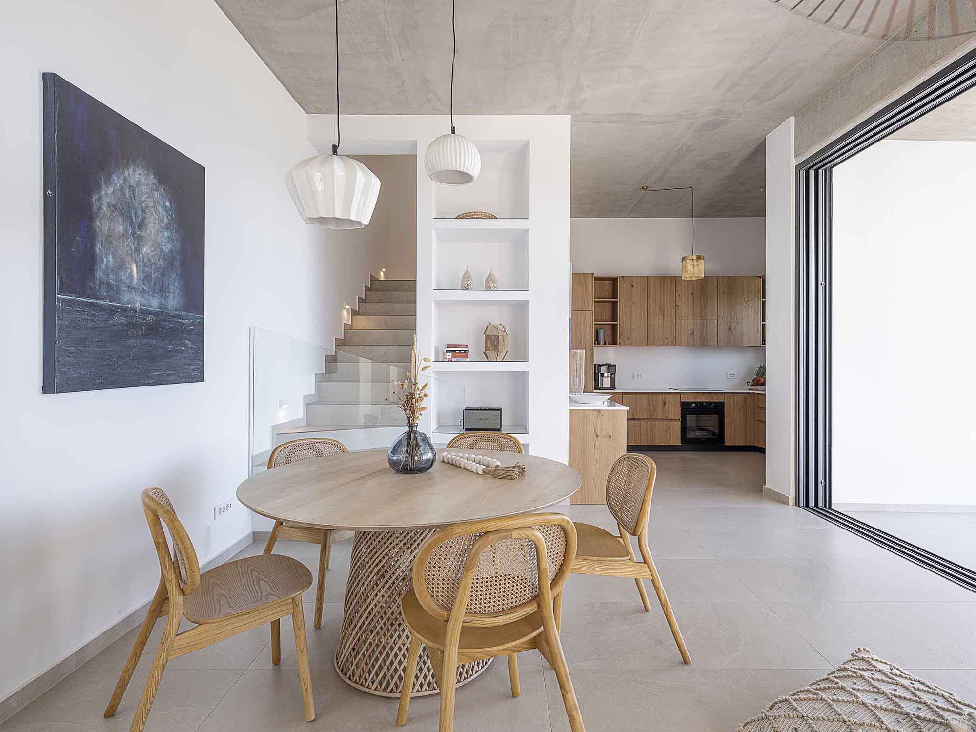 Villa II features two bedrooms on the upper floor, each with a queen-size bed, air conditioning, and direct access to a private balcony with sea views. A shared bathroom with a shower is also located on this level. On the ground floor, guests can enjoy a bright open-plan living area with a comfortable sofa, Smart Satellite TV, and direct access to the pool terrace. The fully equipped modern kitchen includes all essential appliances, and the dining area completes the interior space. A second shared bathroom with a shower is available on this fl oor for added convenience.