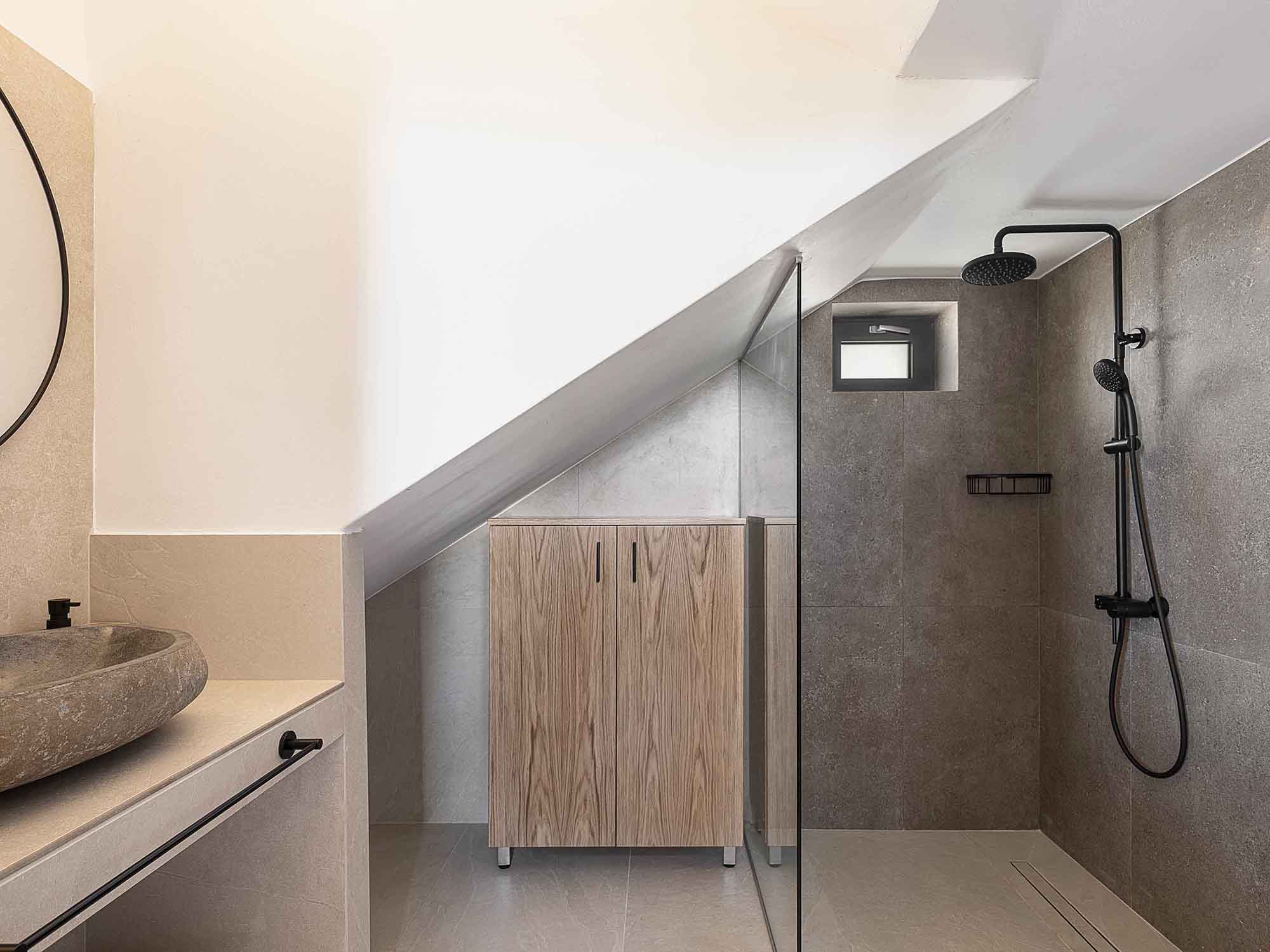 Villa I is spread over two levels and features two bedrooms on the upper fl oor. Each bedroom has a queen-size bed, air conditioning, and direct access to a private balcony with sea views. A shared modern bathroom with a shower serves this floor. On the ground floor, guests will find a bright open-plan living area with a comfortable sofa, Smart Satellite TV, and direct access to the pool area. The fully equipped kitchen includes all essential appliances, and the dining area is suitable for family meals. A second shared bathroom with a shower is also available on this level.