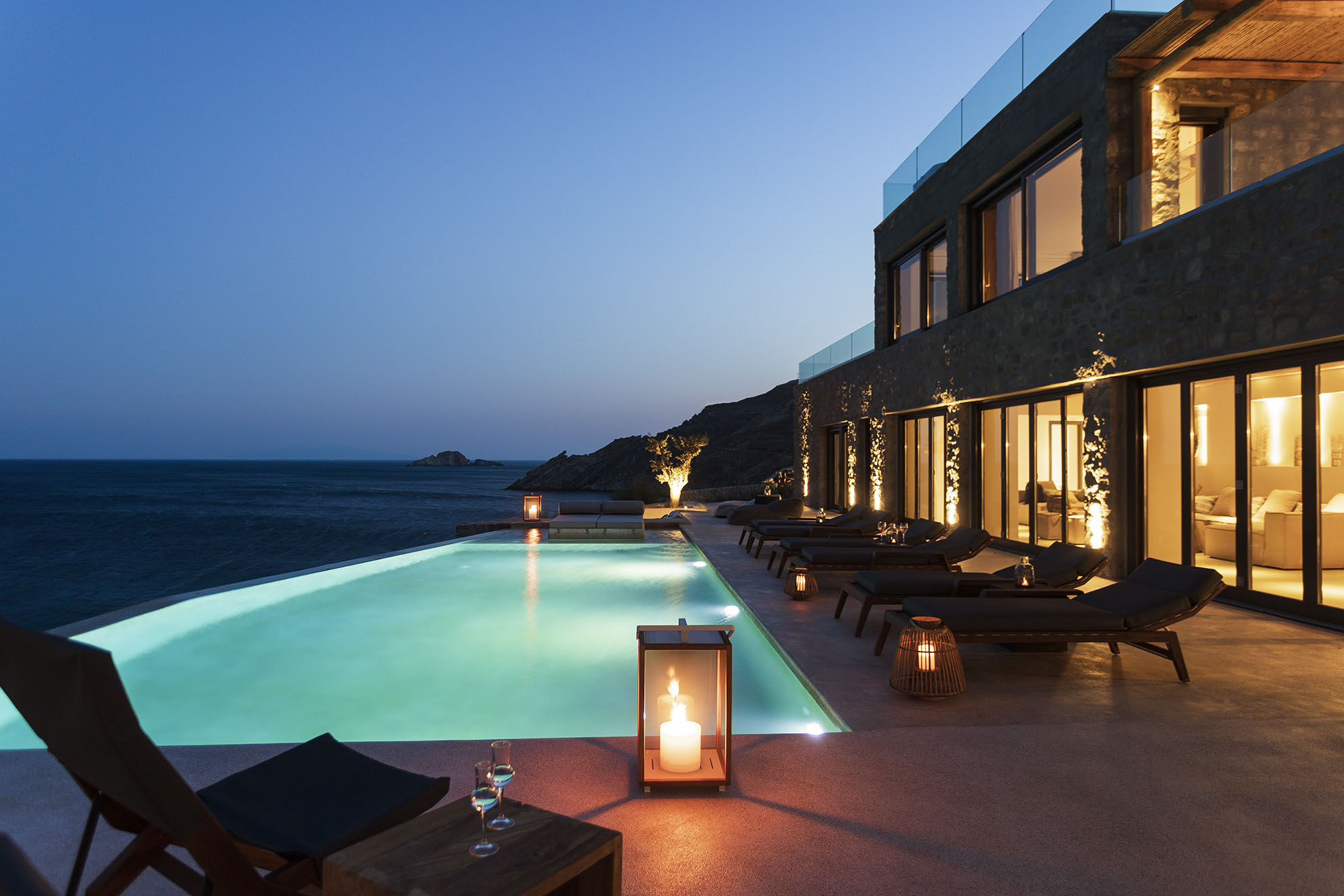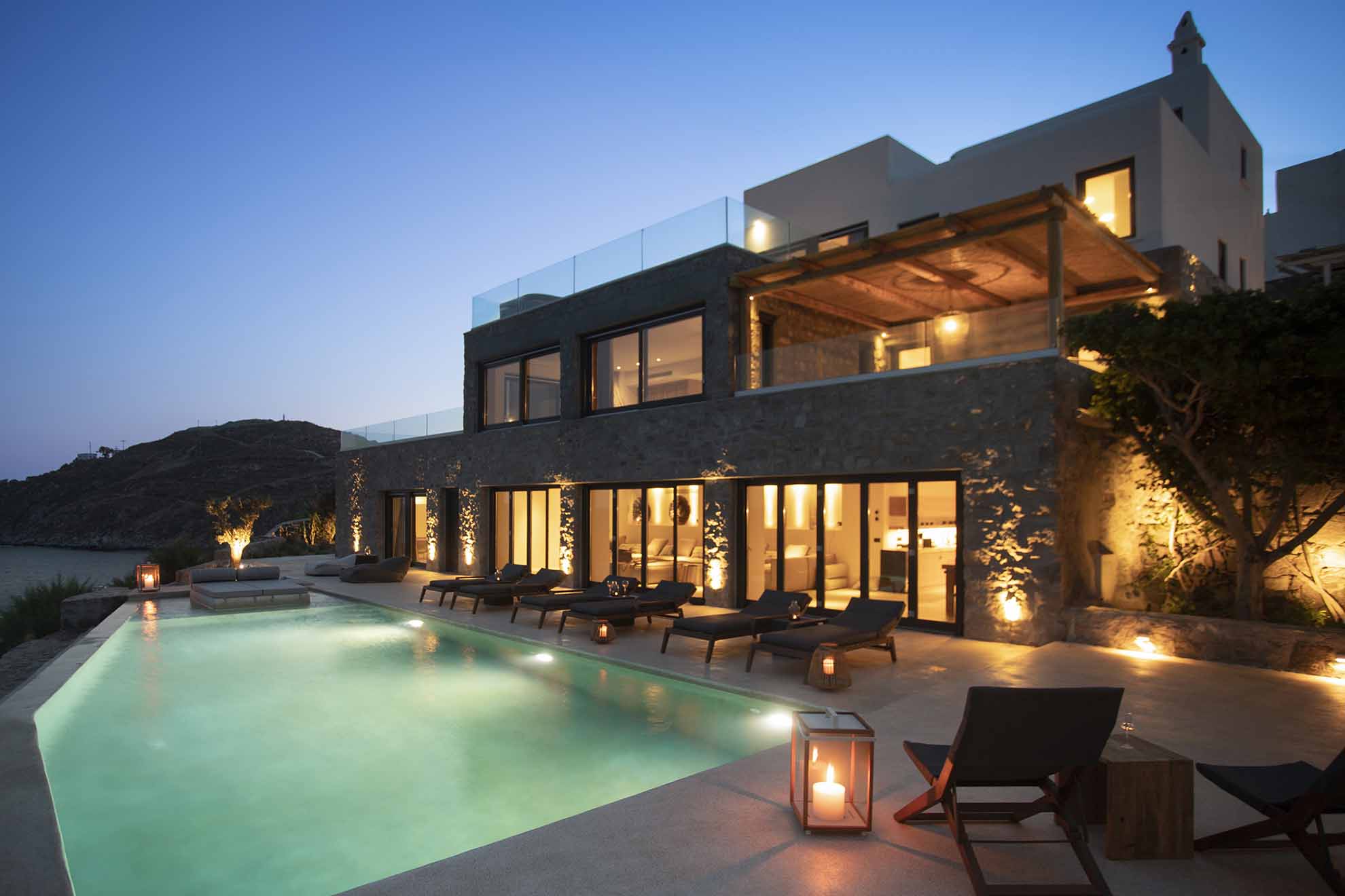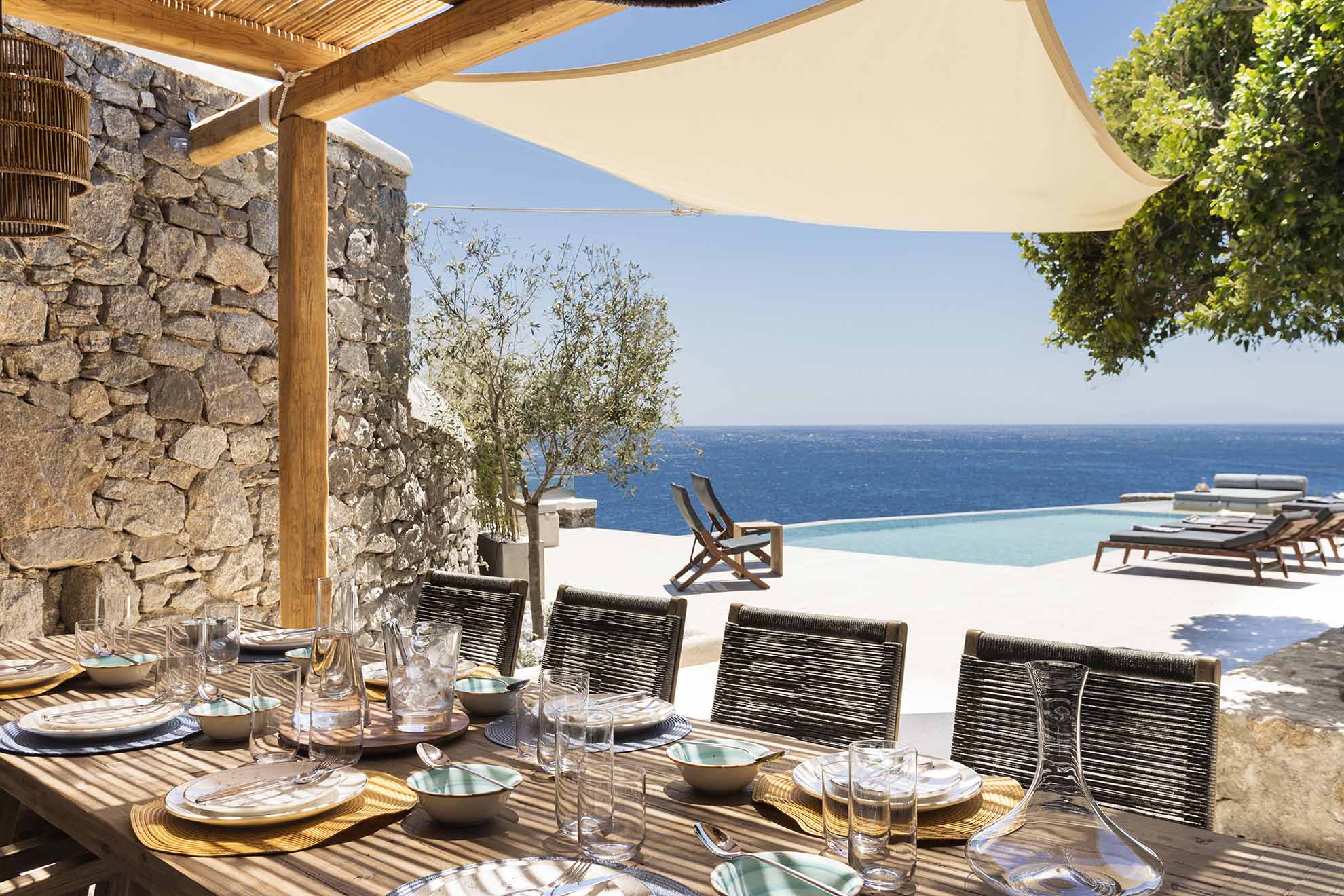 Villa Bovary is brand new seafront property in the area of Aleomandra, with amazing unobstructed sea views, built at the edge of a rocky shore in a wind protected spot right above the Aegean blue waters. Its meticulous landscape and modern design highlight the island’s lifestyle and is ideal for a families and group of friends.