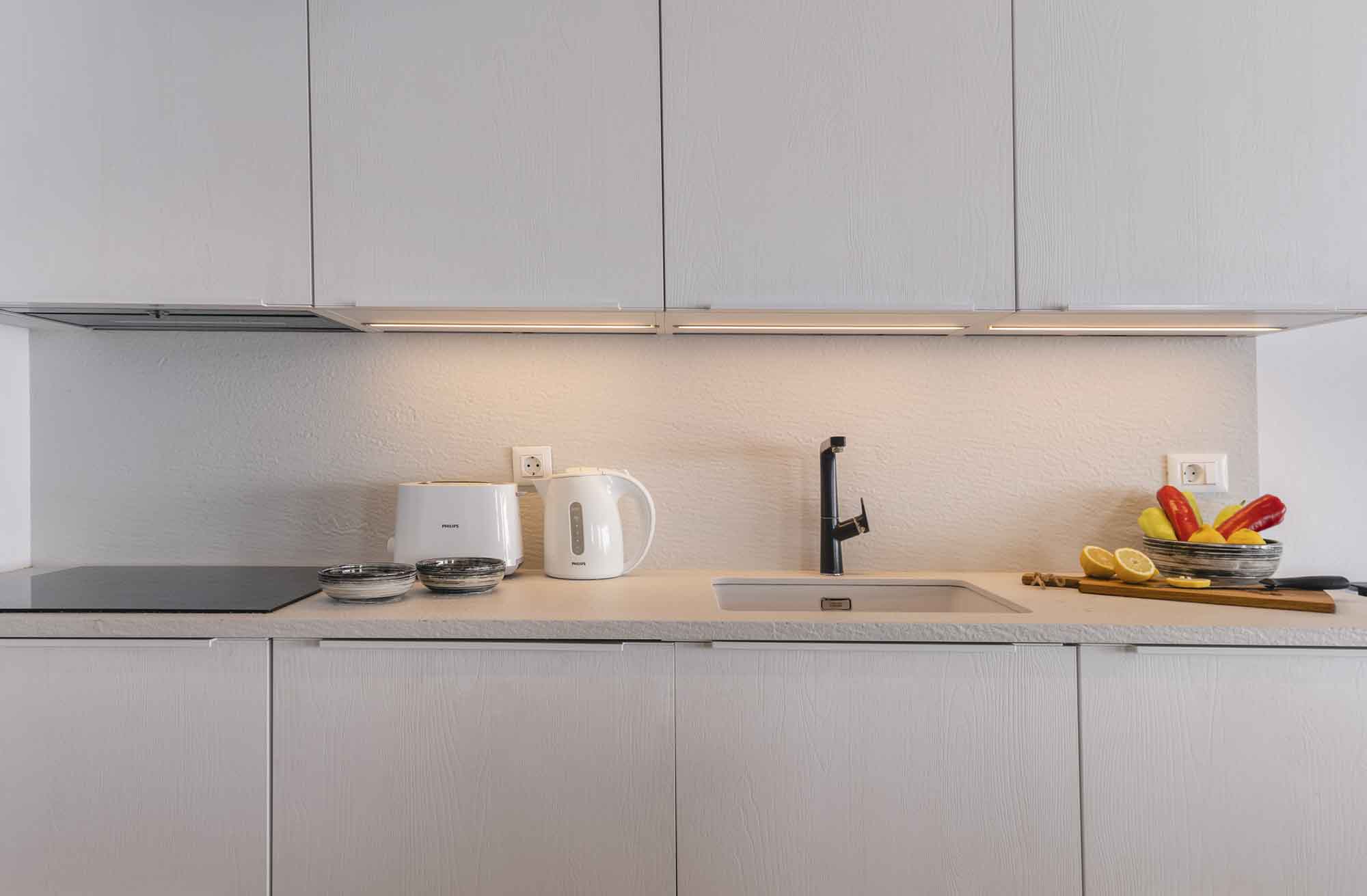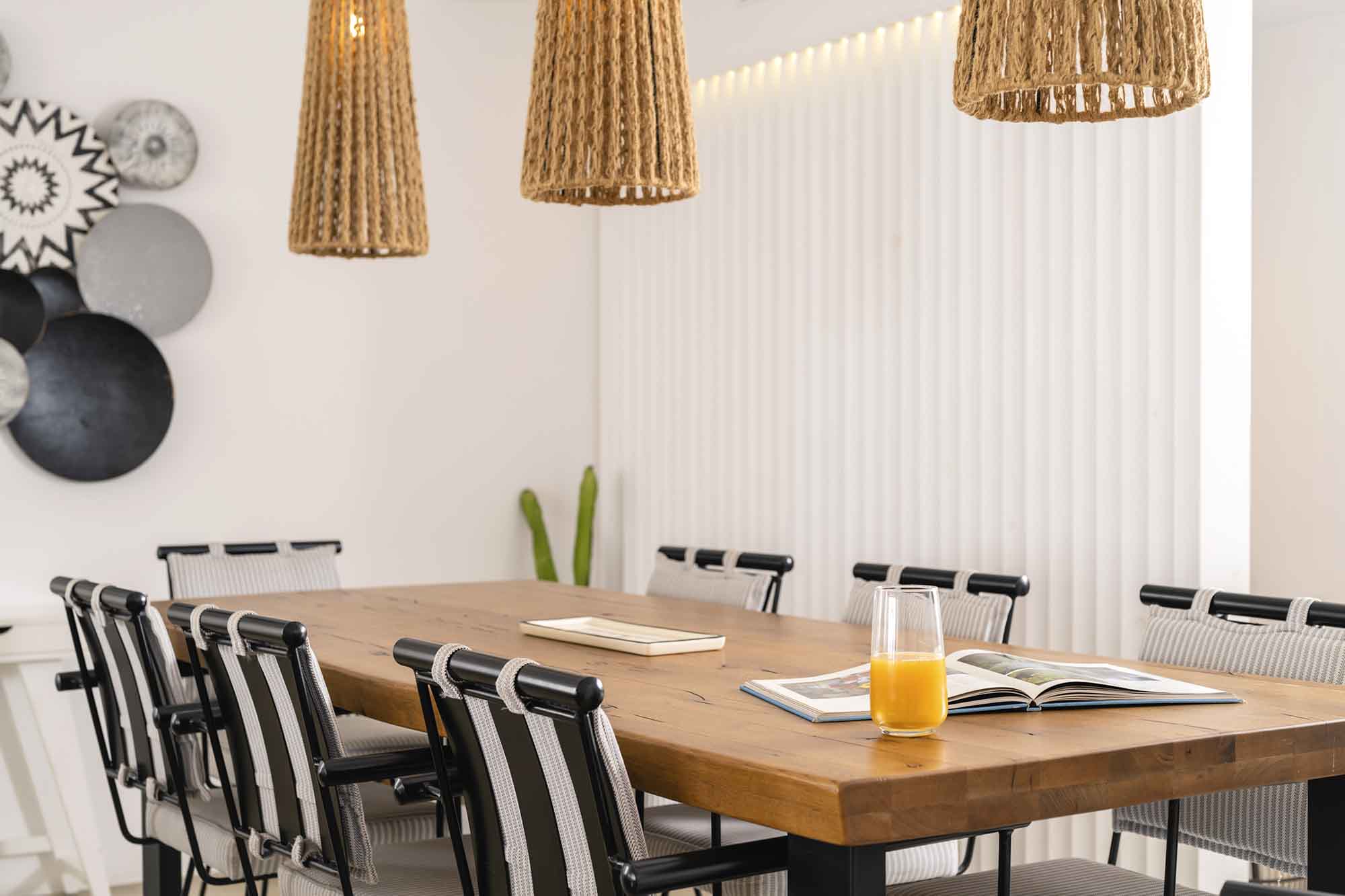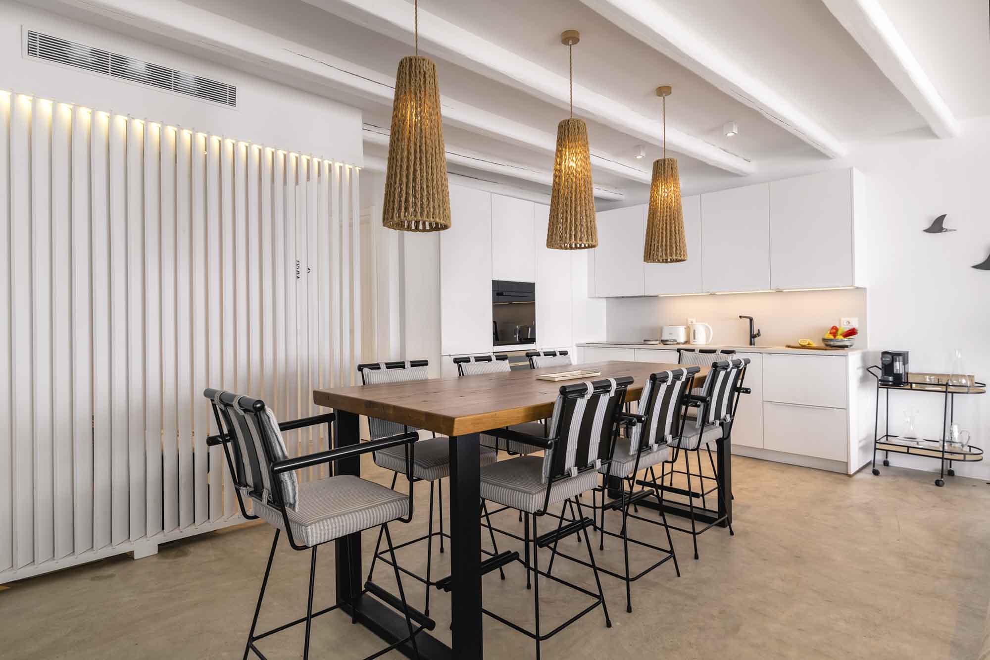 The house can accommodate up to 8 people and has been designed and furnished with the highest-end equipment to offer you utmost comfort while enjoying the breathtaking view. The living room and dining area as well as the fully equipped open plan kitchen, have a direct access to the pool area.