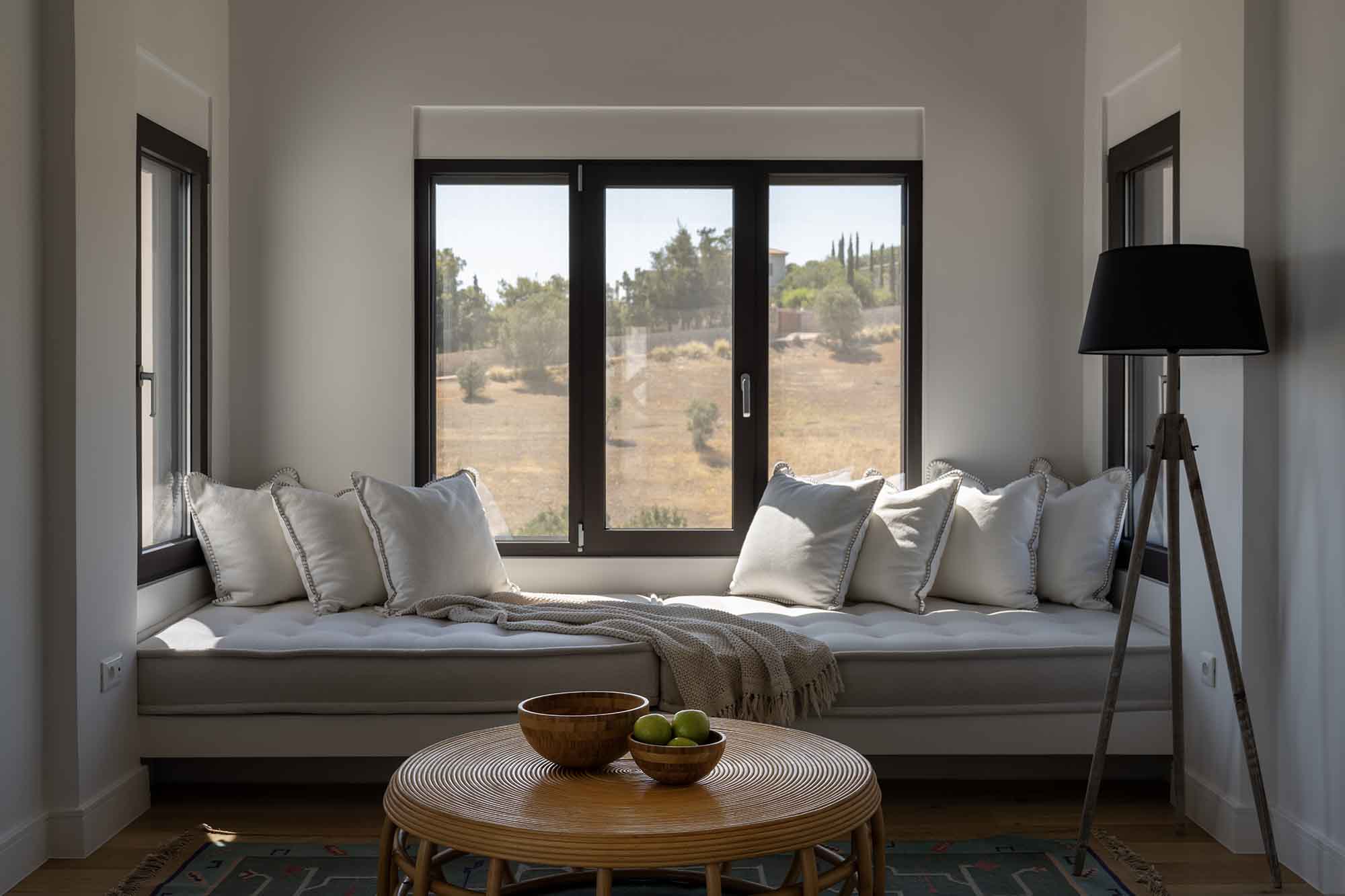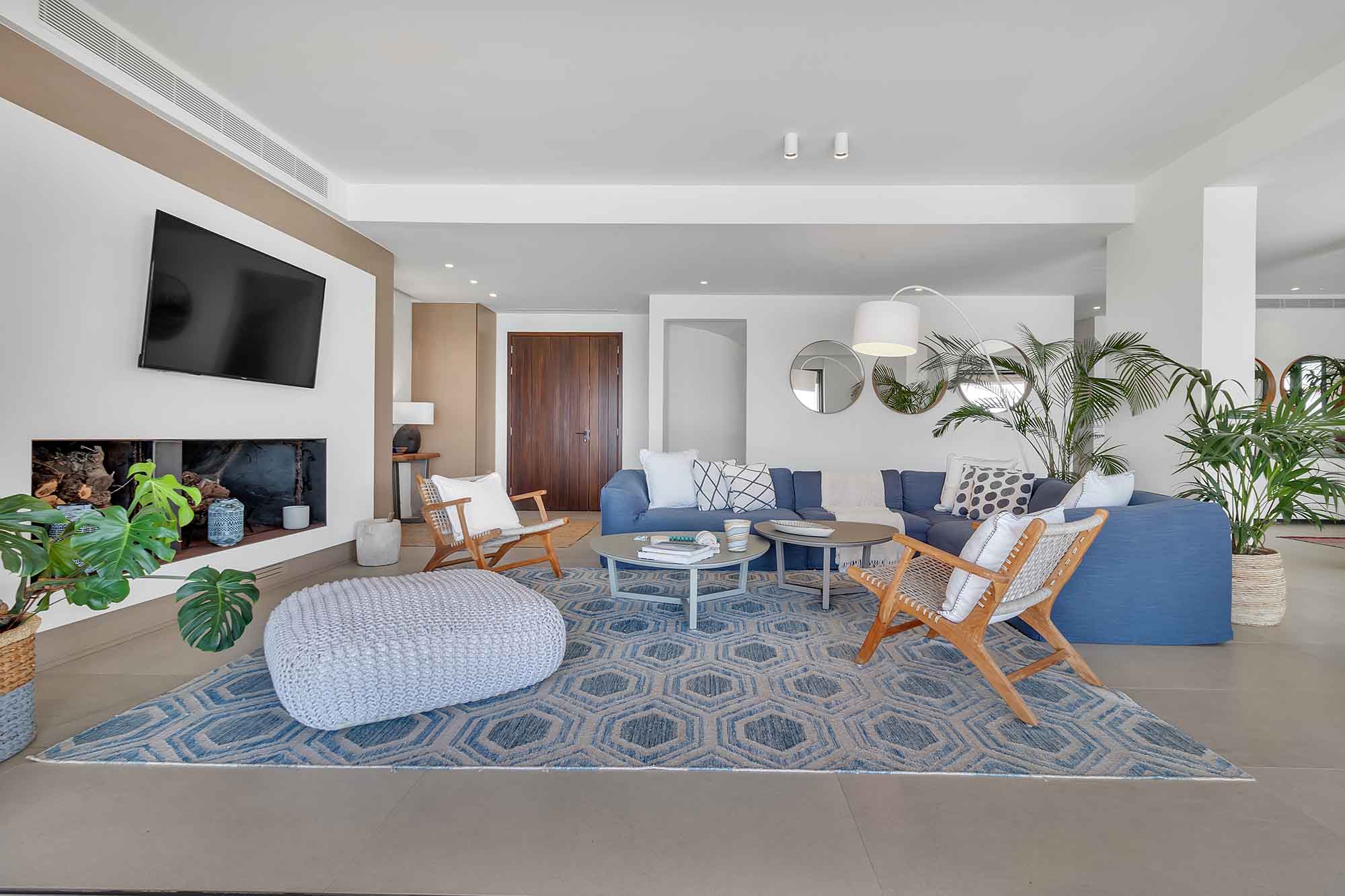 As you step inside the villa, the ground floor welcomes you with a bright and inviting living room featuring a cozy fireplace and expansive windows that open onto a panoramic terrace.