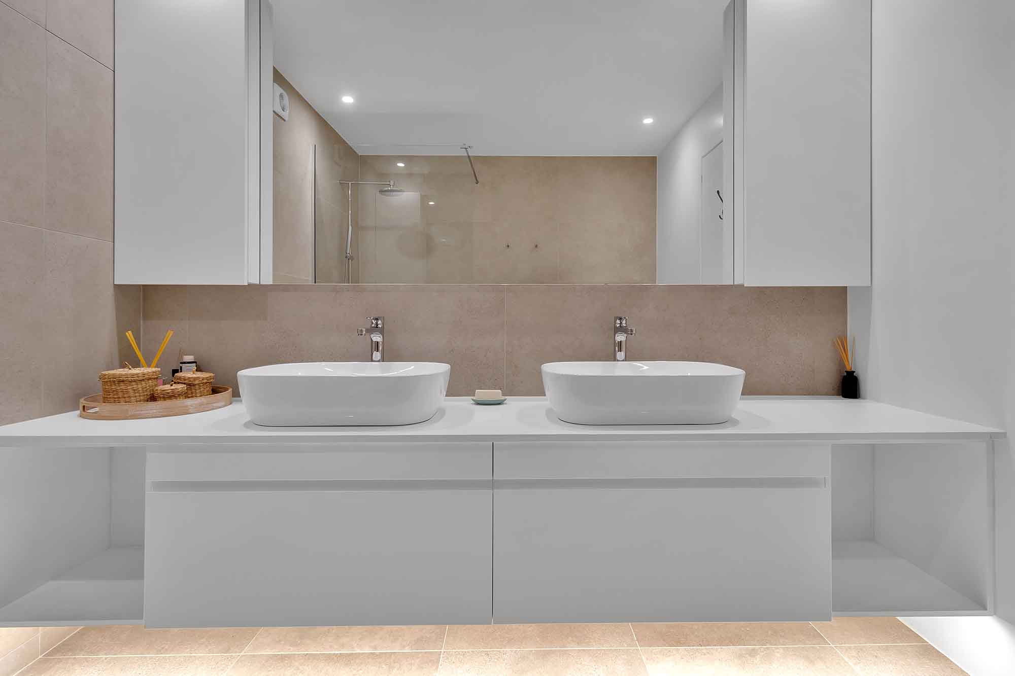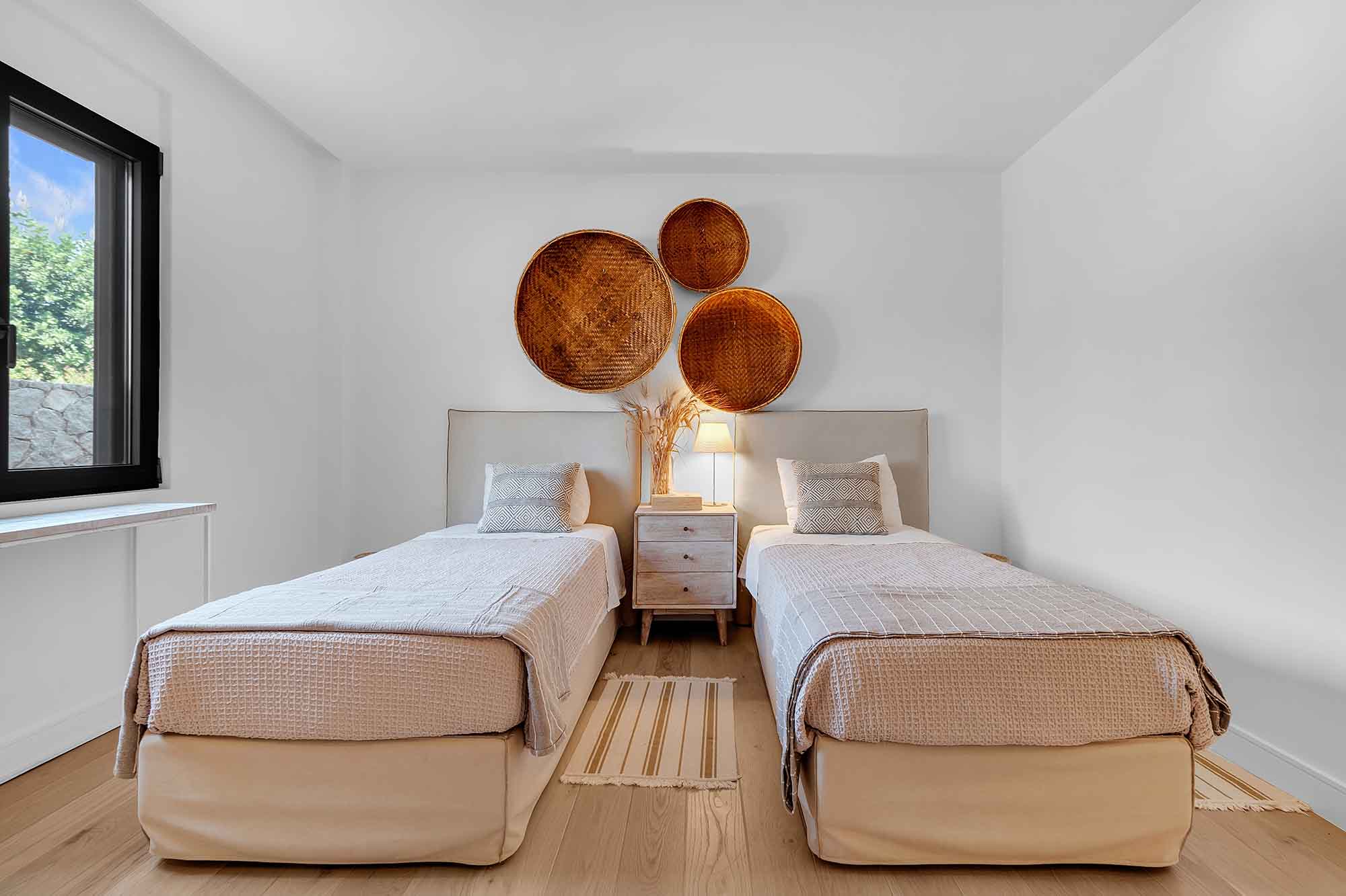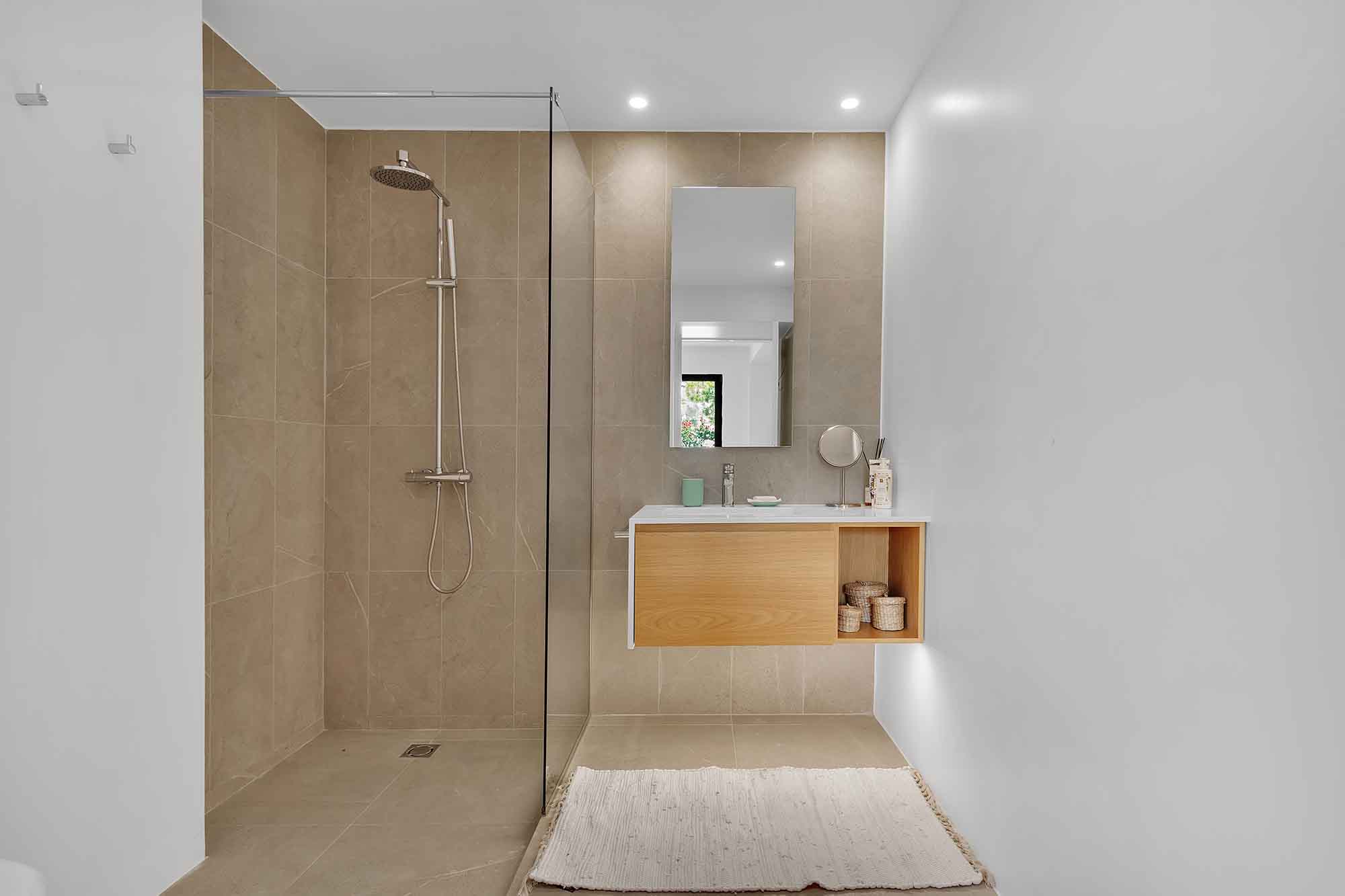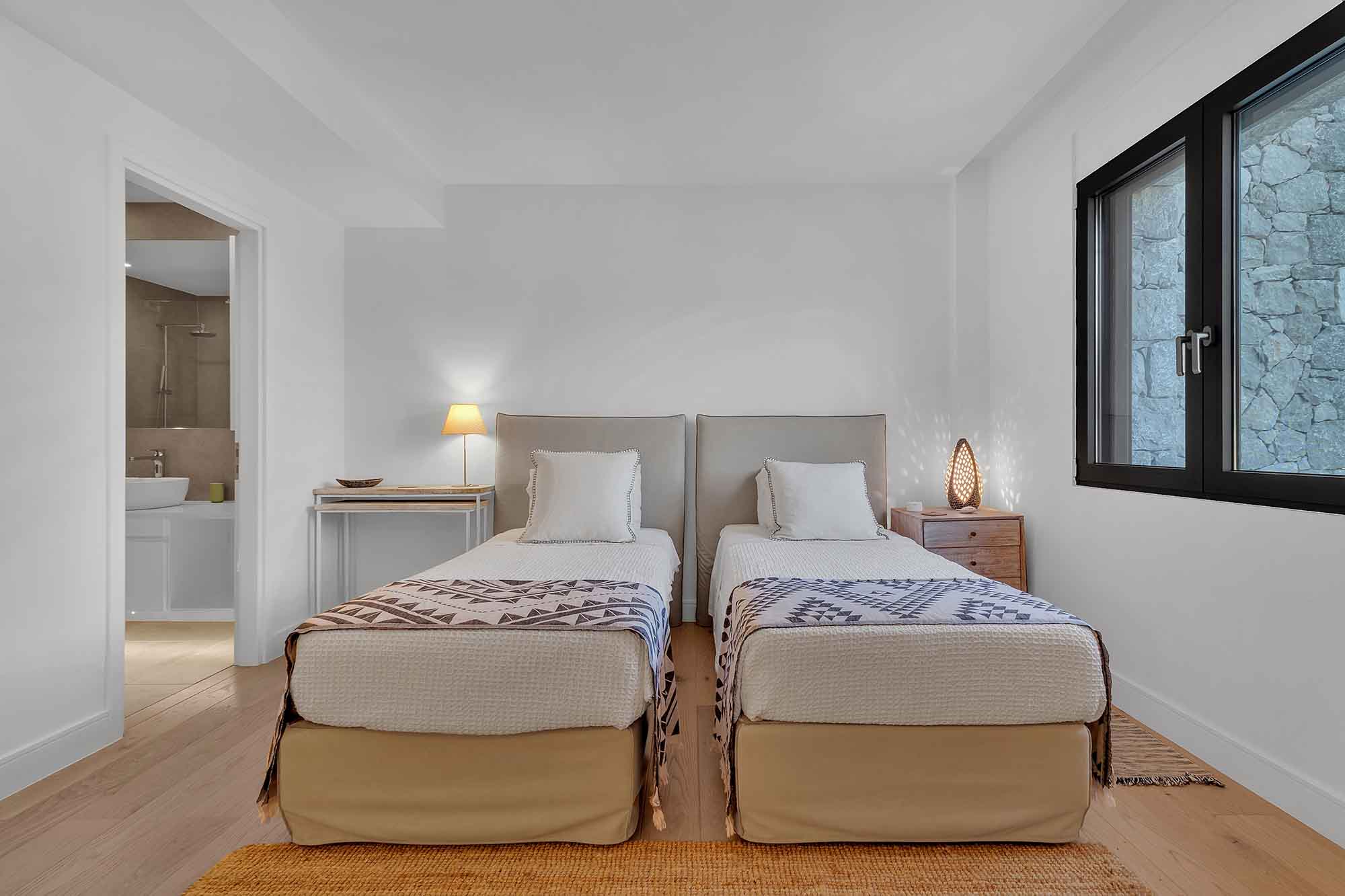 The lower level of the villa is designed for both relaxation and privacy. It offers four spacious, beautifully furnished bedrooms, each with its own en-suite bathroom and direct access to the lush garden, allowing guests to step outside and enjoy the peaceful surroundings at any time. In addition, this level includes a separate staff room with its own en-suite bathroom, providing comfortable accommodation for household staff.