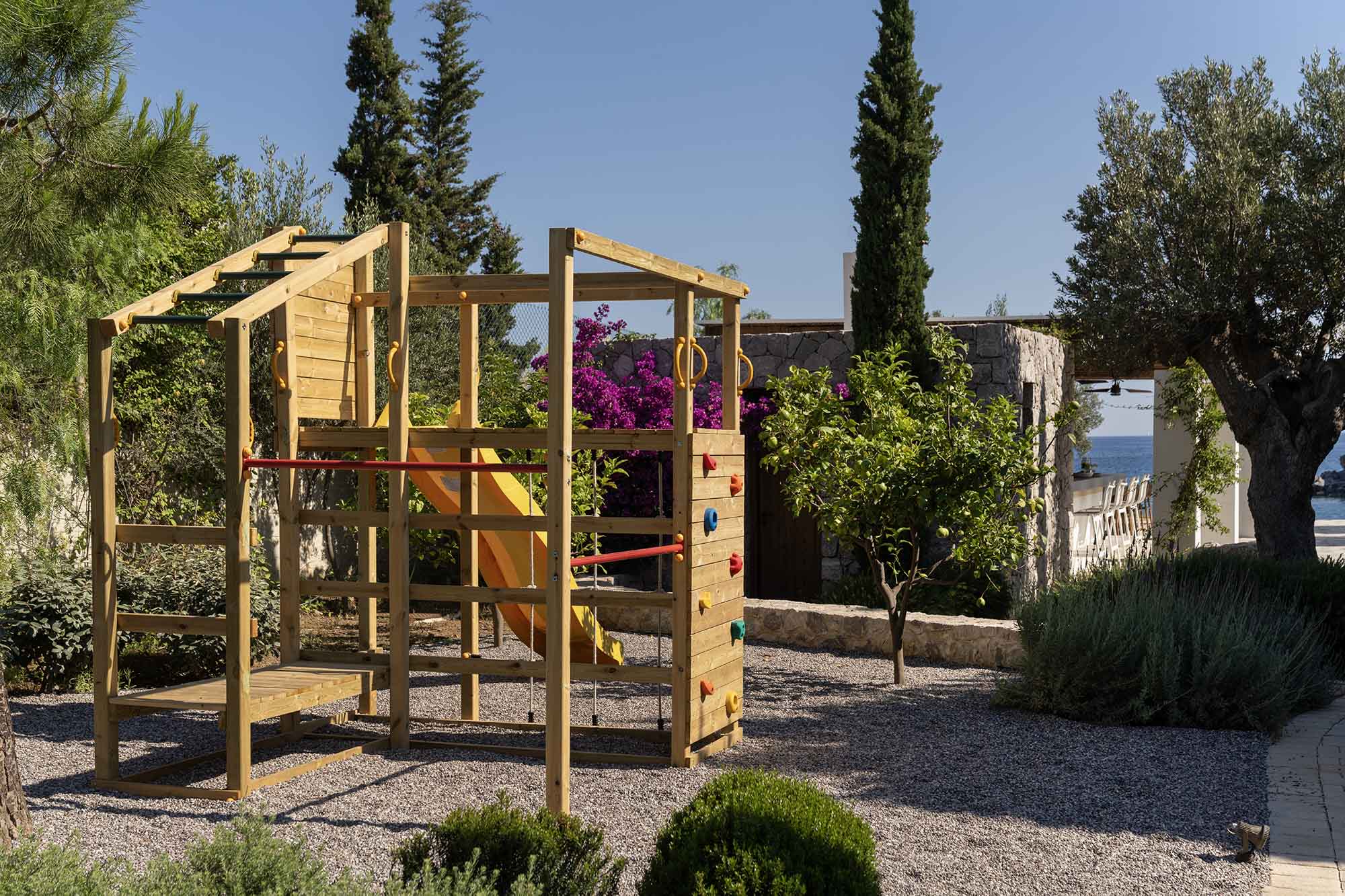 Outside, Villa Davina’s lush garden offers a peaceful haven for guests to relax and entertain. The property also includes a children’s playground, private parking, and exclusive direct access to the beach, ensuring that every moment of your stay is easy, comfortable, and unforgettable.