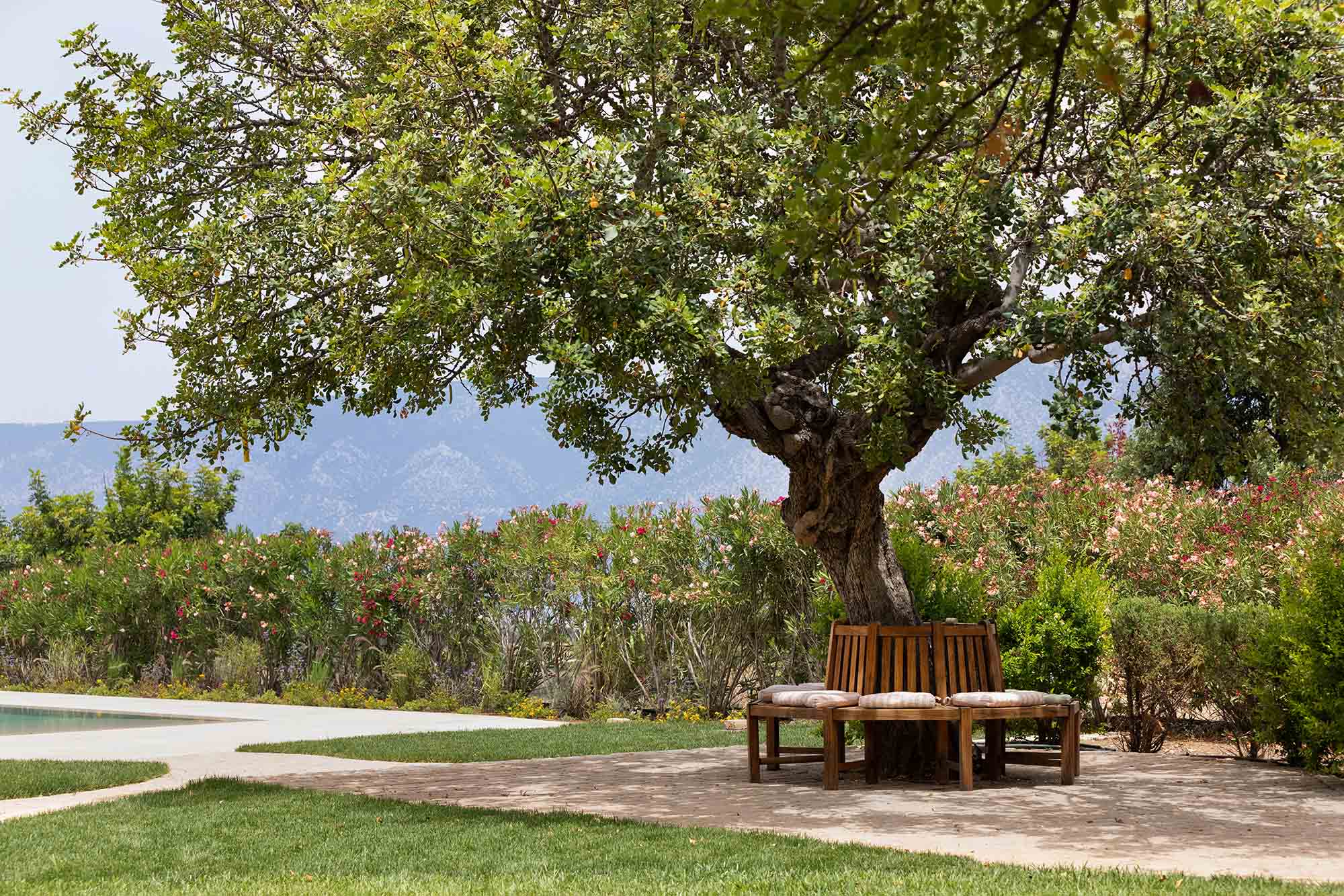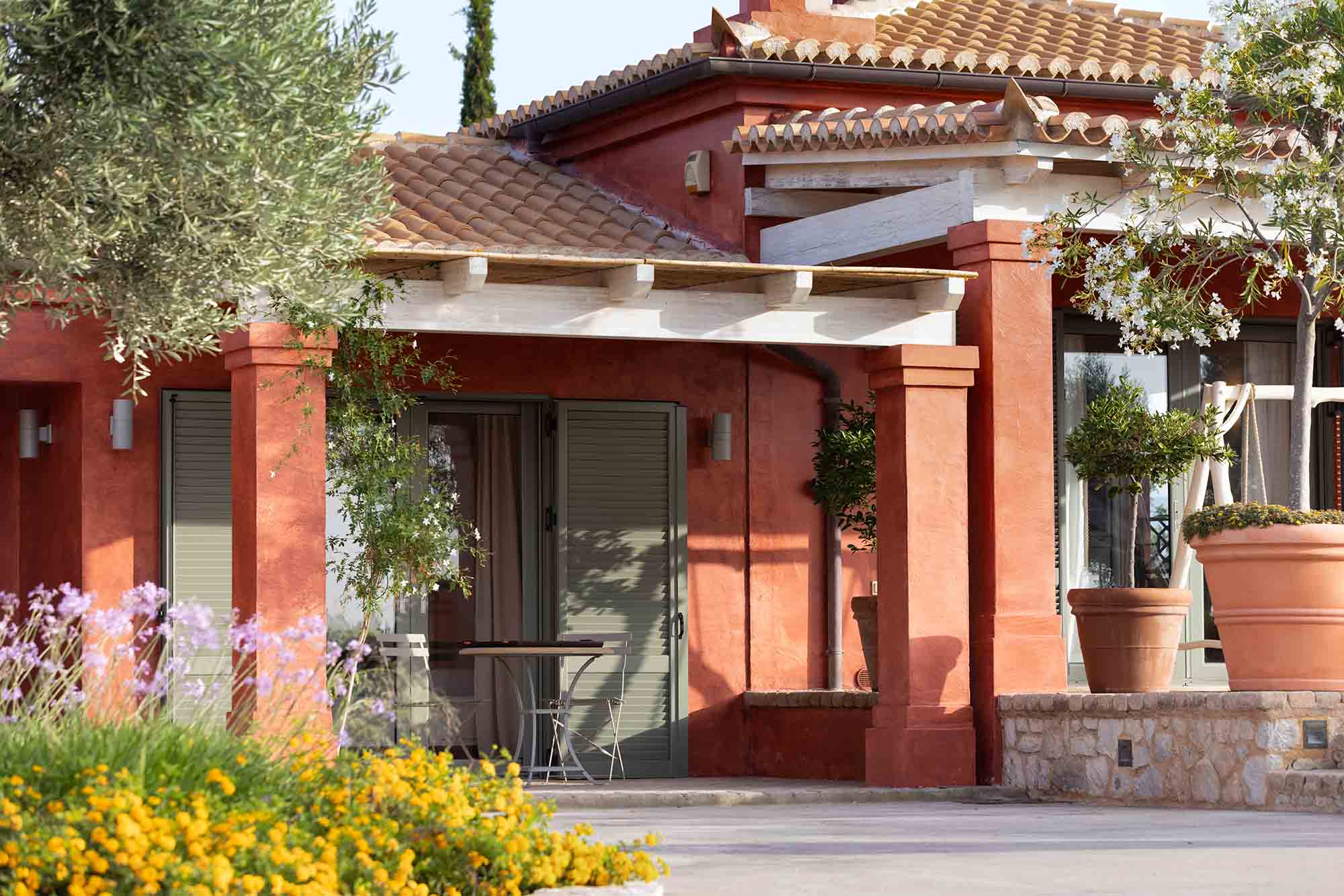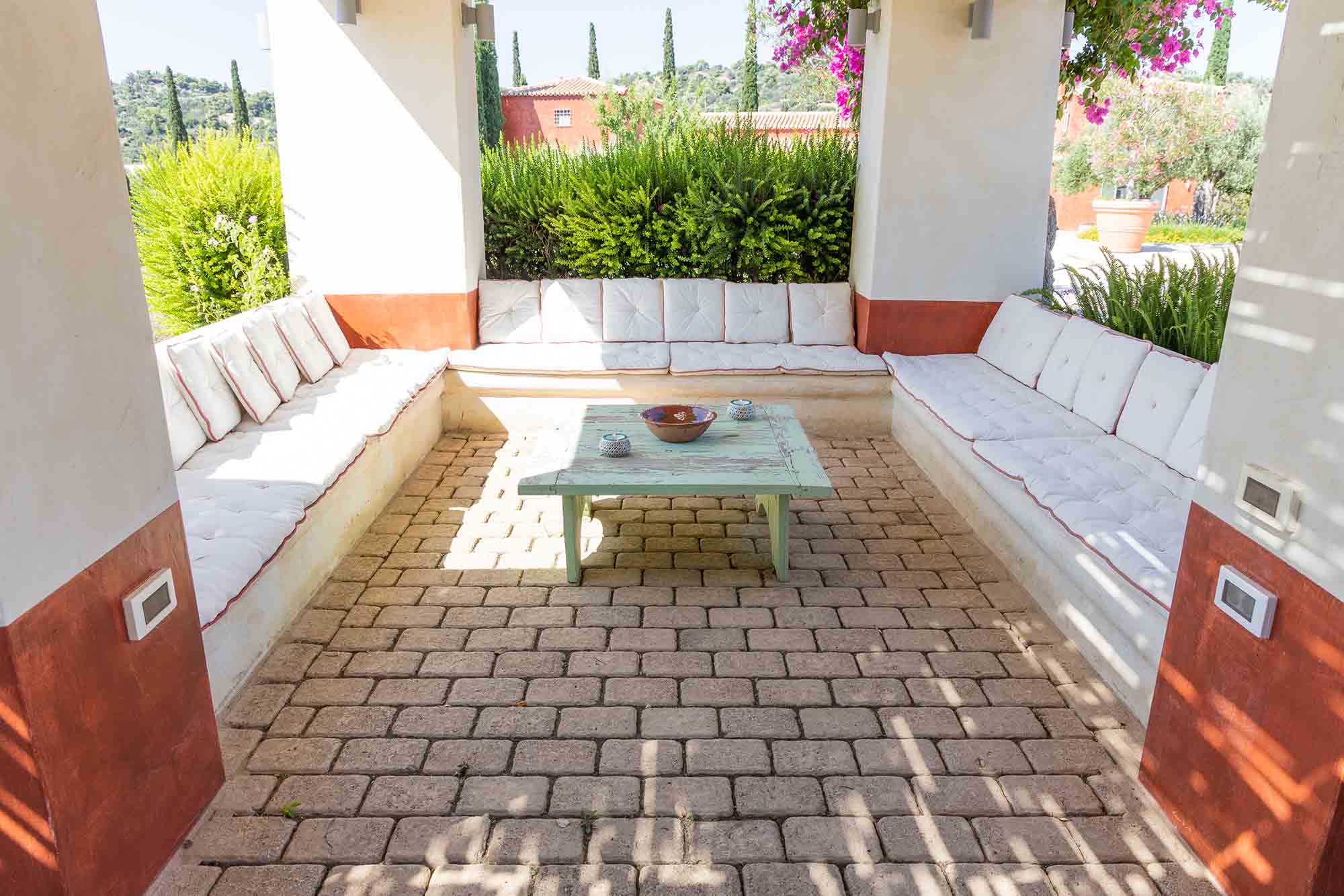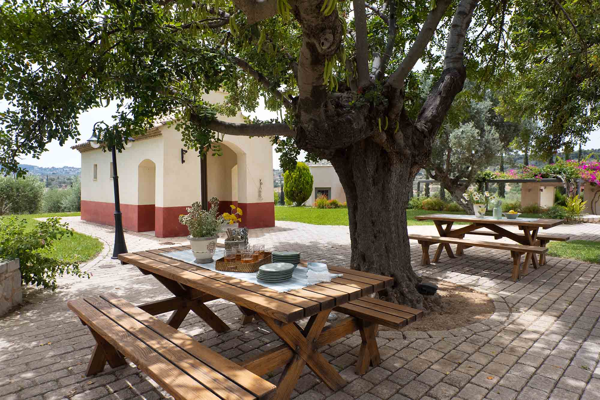 Outdoors, Dome Estate is surrounded by an extensive garden filled with colorful flowers and fragrant herbs, creating a peaceful and refreshing atmosphere. At the heart of the property lies the swimming pool, ideal for relaxing and embracing outdoor living. Several covered seating and dining areas, BBQ facilities, and a stable — once used for horses — further enhance the estate’s charm. On the property sits a unique in aesthetics and charm Chapel.