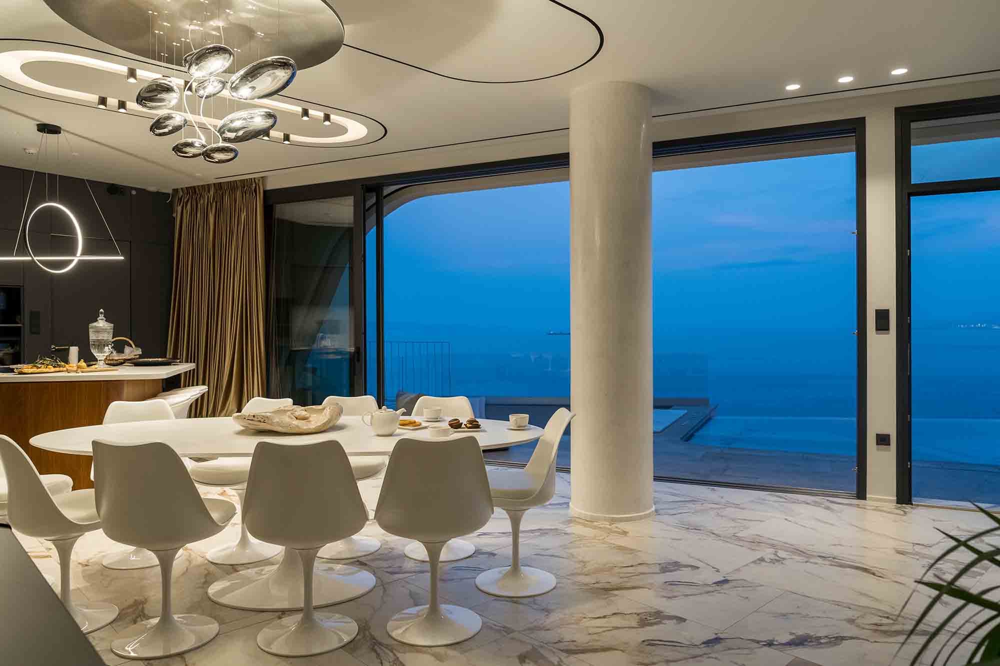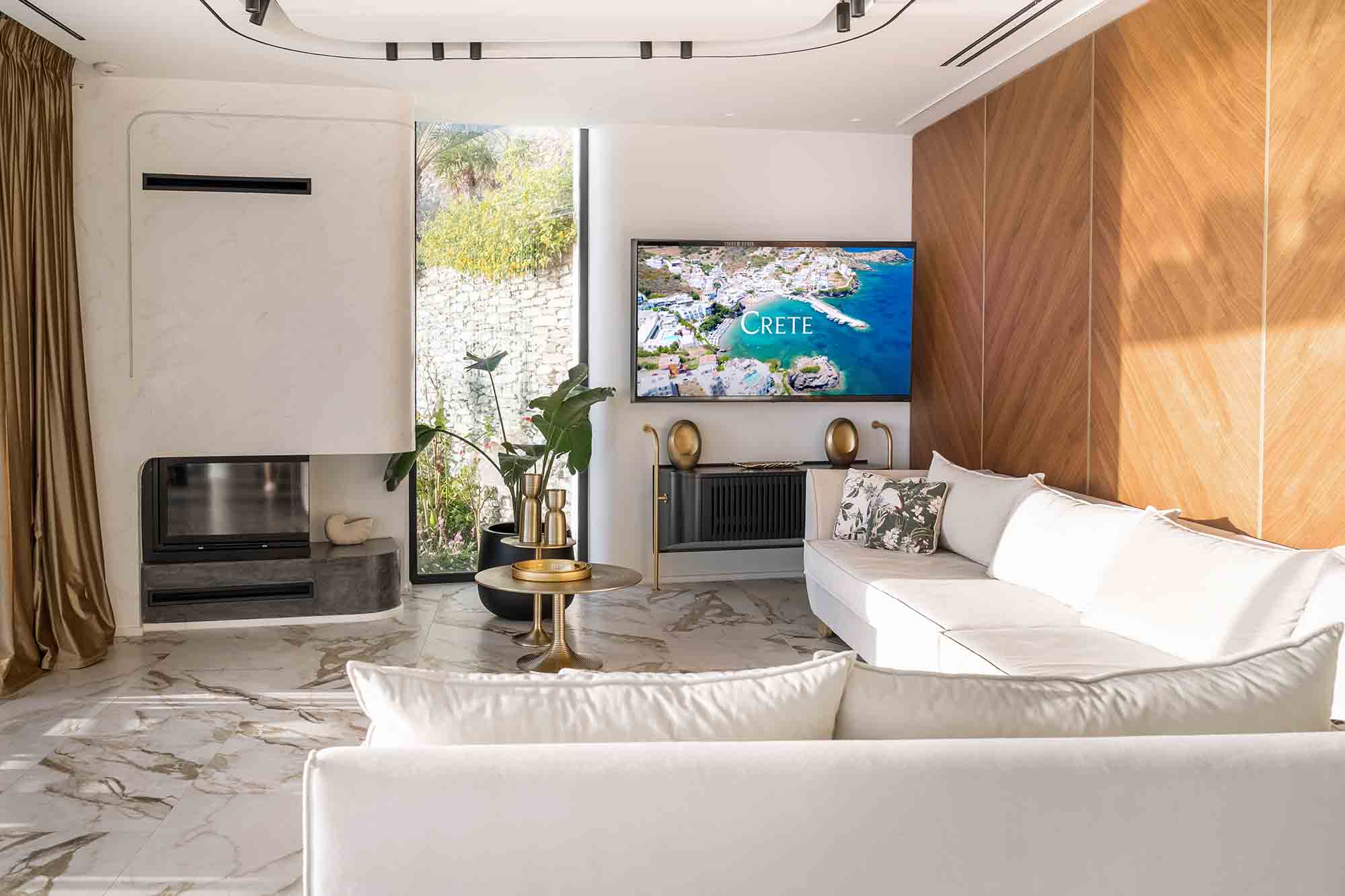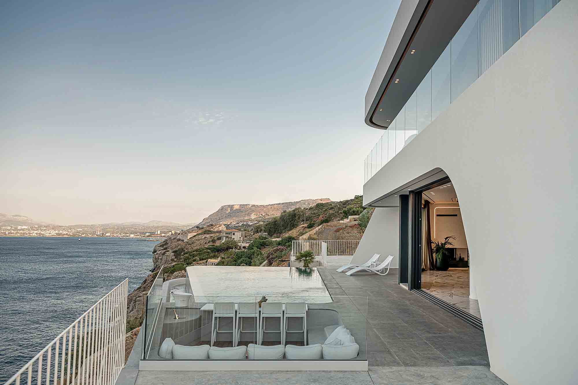 Experience the epitome of luxury in this extraordinary villa situated on the picturesque Heraklion Bay. Its expansive living area, complete with a stylish dining table, comfortable sofa, TV, and a cozy fireplace, seamlessly blends into the pool area through large sliding windows. This clever design amalgamation creates a stunningly vast space, perfect for hosting unforgettable gatherings under the twinkling city lights across the bay.