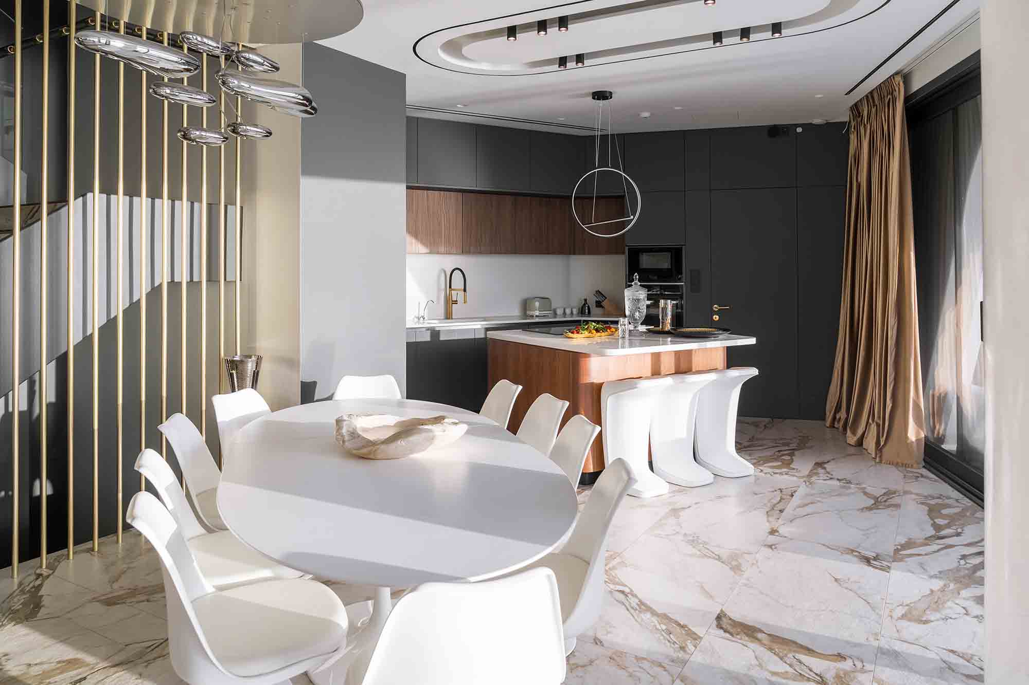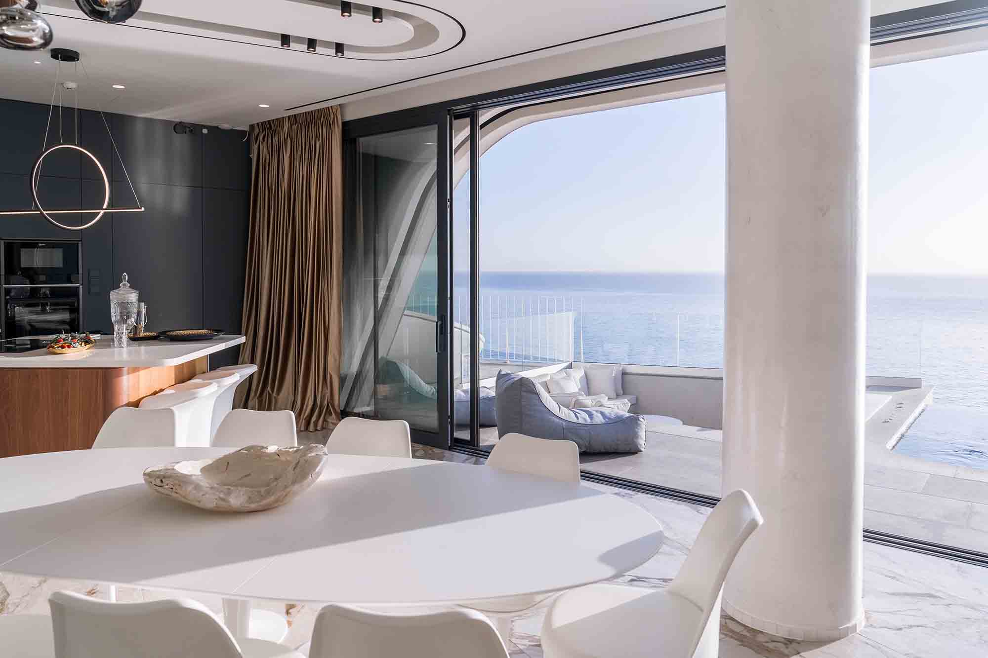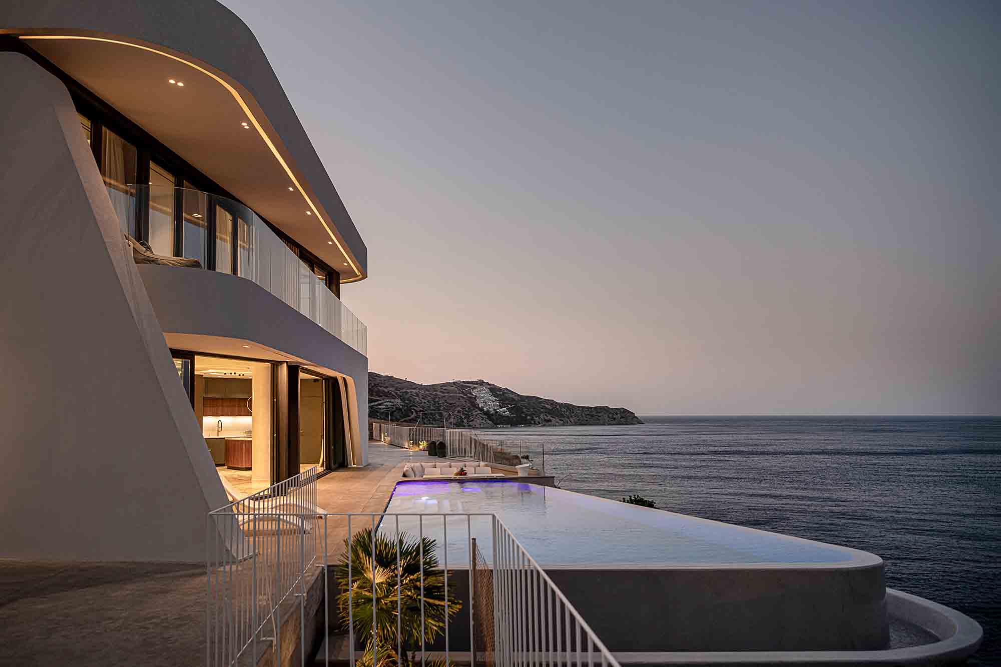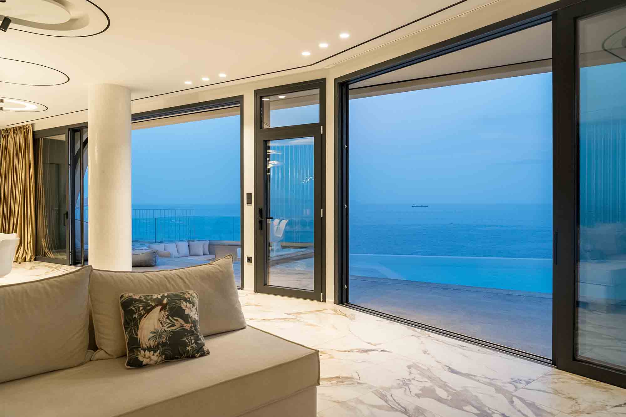 Experience the epitome of luxury in this extraordinary villa situated on the picturesque Heraklion Bay. Its expansive living area, complete with a stylish dining table, comfortable sofa, TV, and a cozy fireplace, seamlessly blends into the pool area through large sliding windows. This clever design amalgamation creates a stunningly vast space, perfect for hosting unforgettable gatherings under the twinkling city lights across the bay.