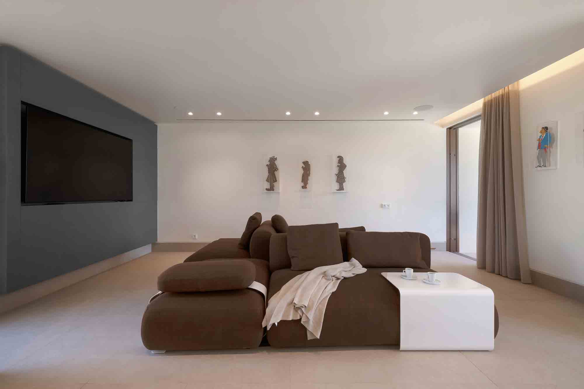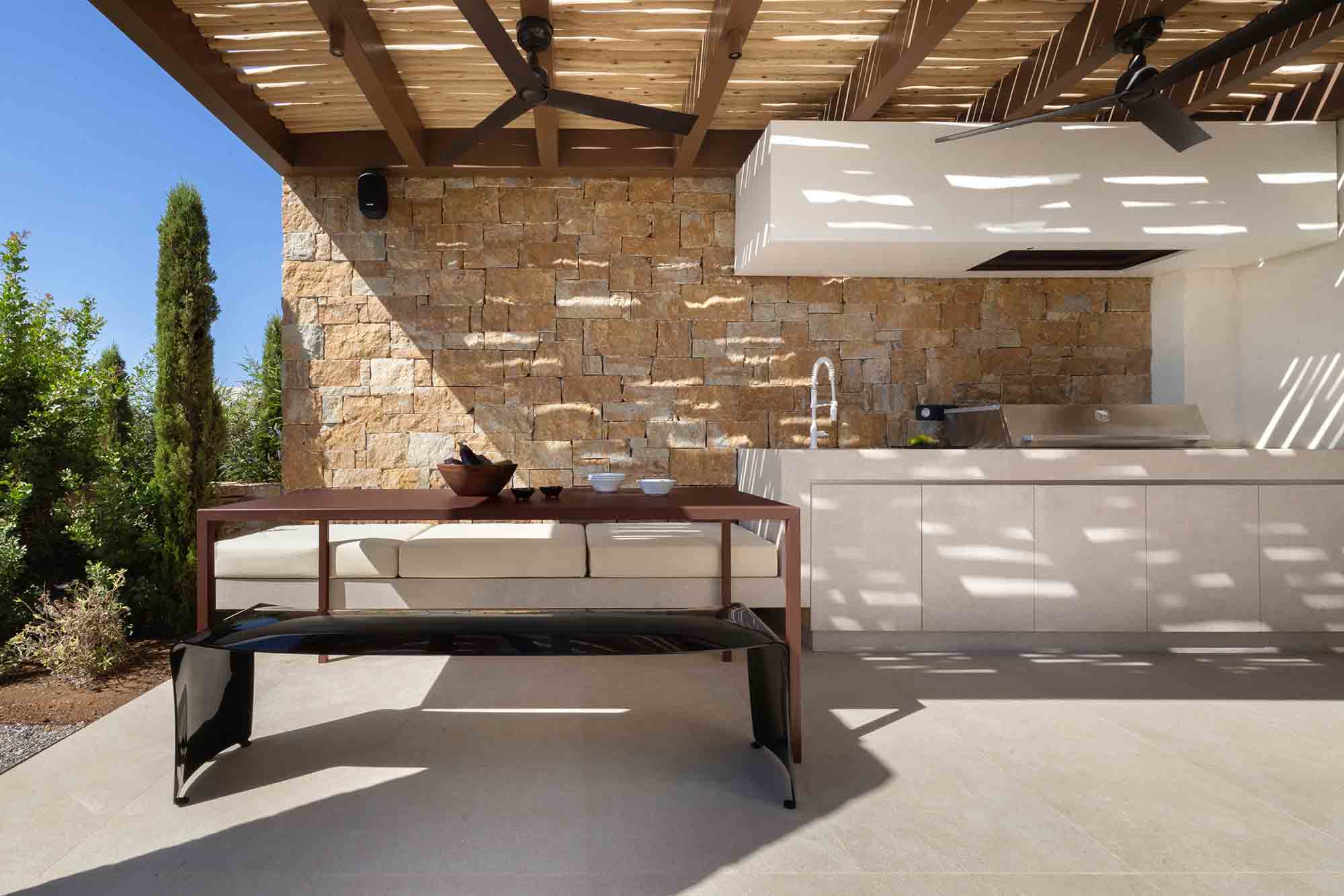 At its heart lies a fully equipped kitchen and spacious dining area, ideal for hosting family and friends. The inviting living room with its contemporary double-sided sofa opens to the shaded BBQ terrace and lounge, overlooking a striking 50m² pool.