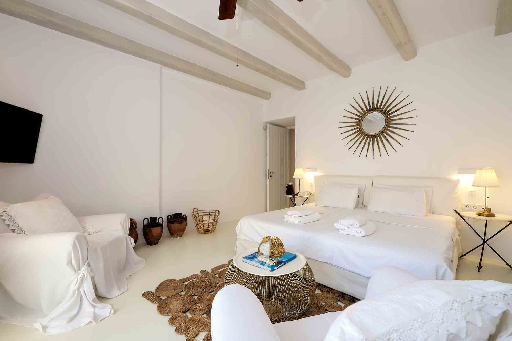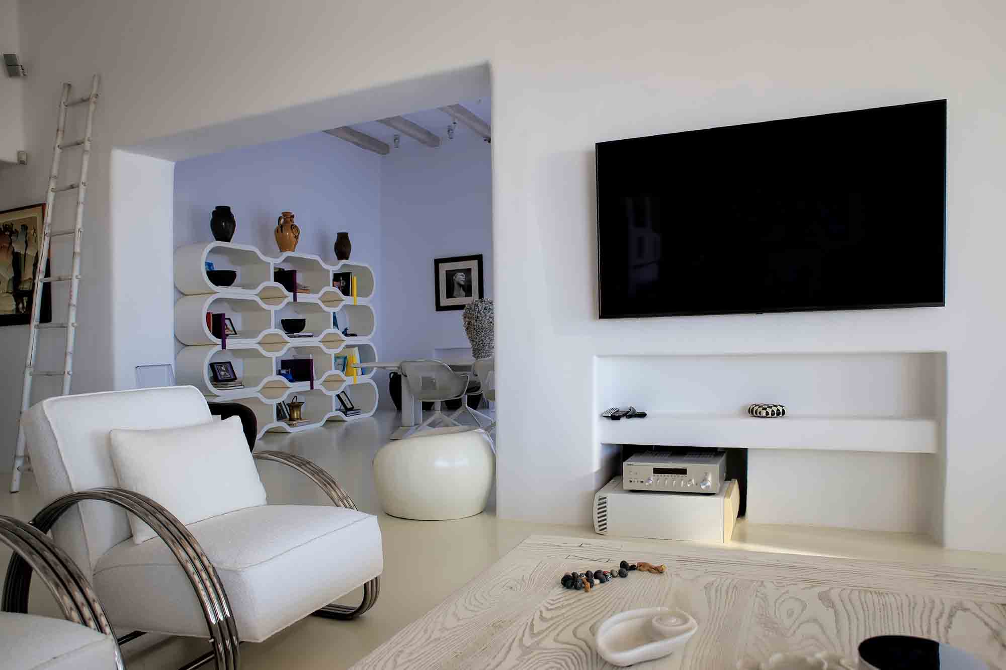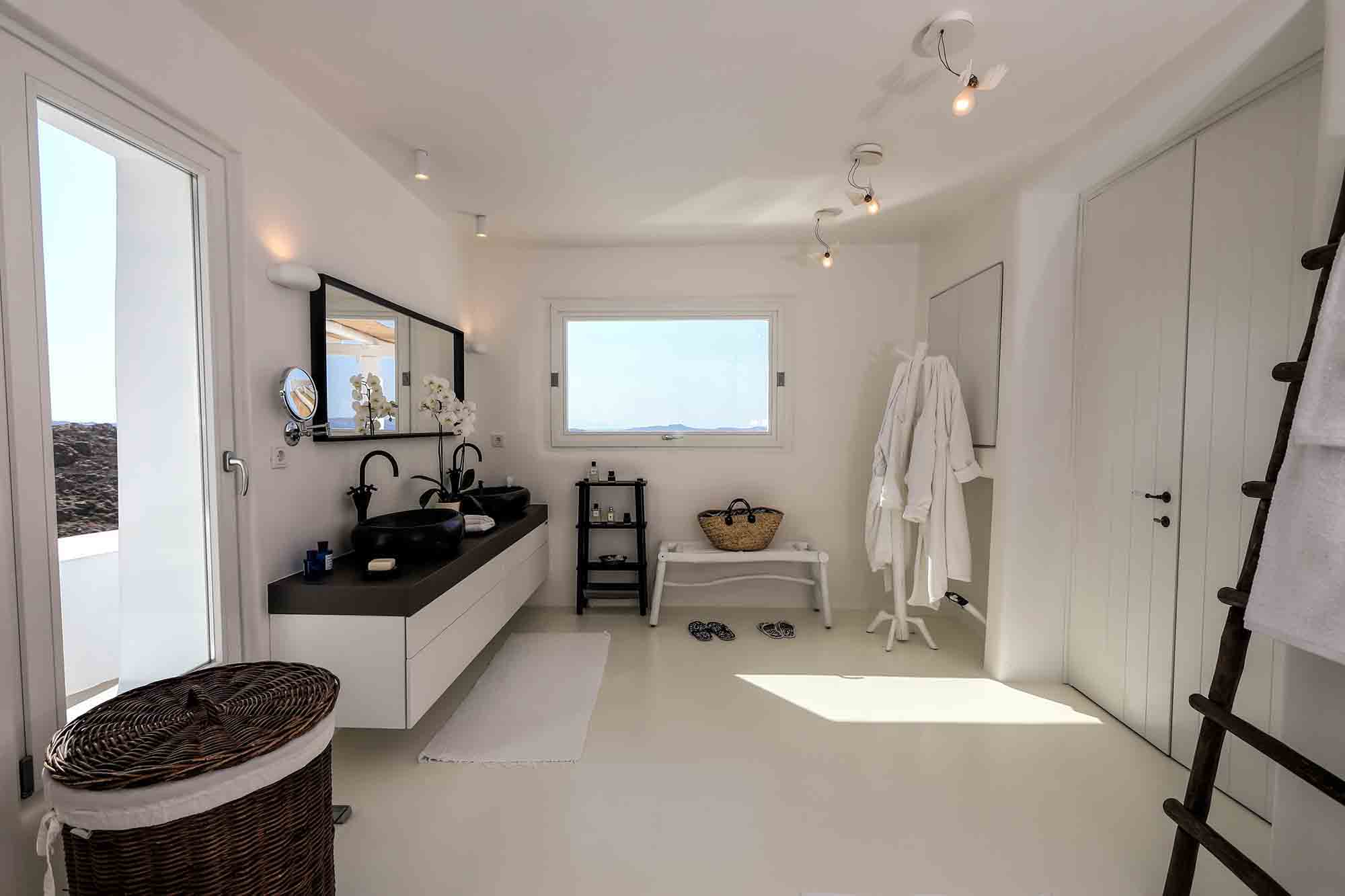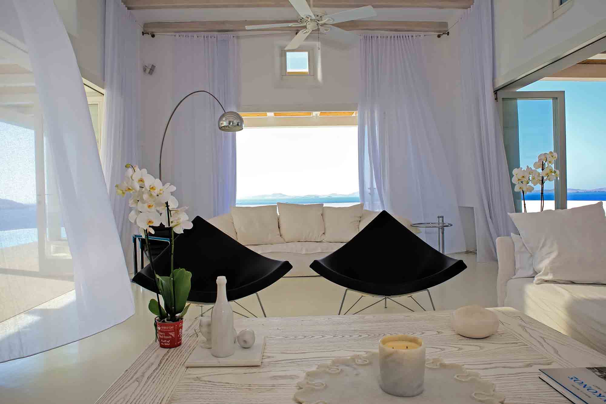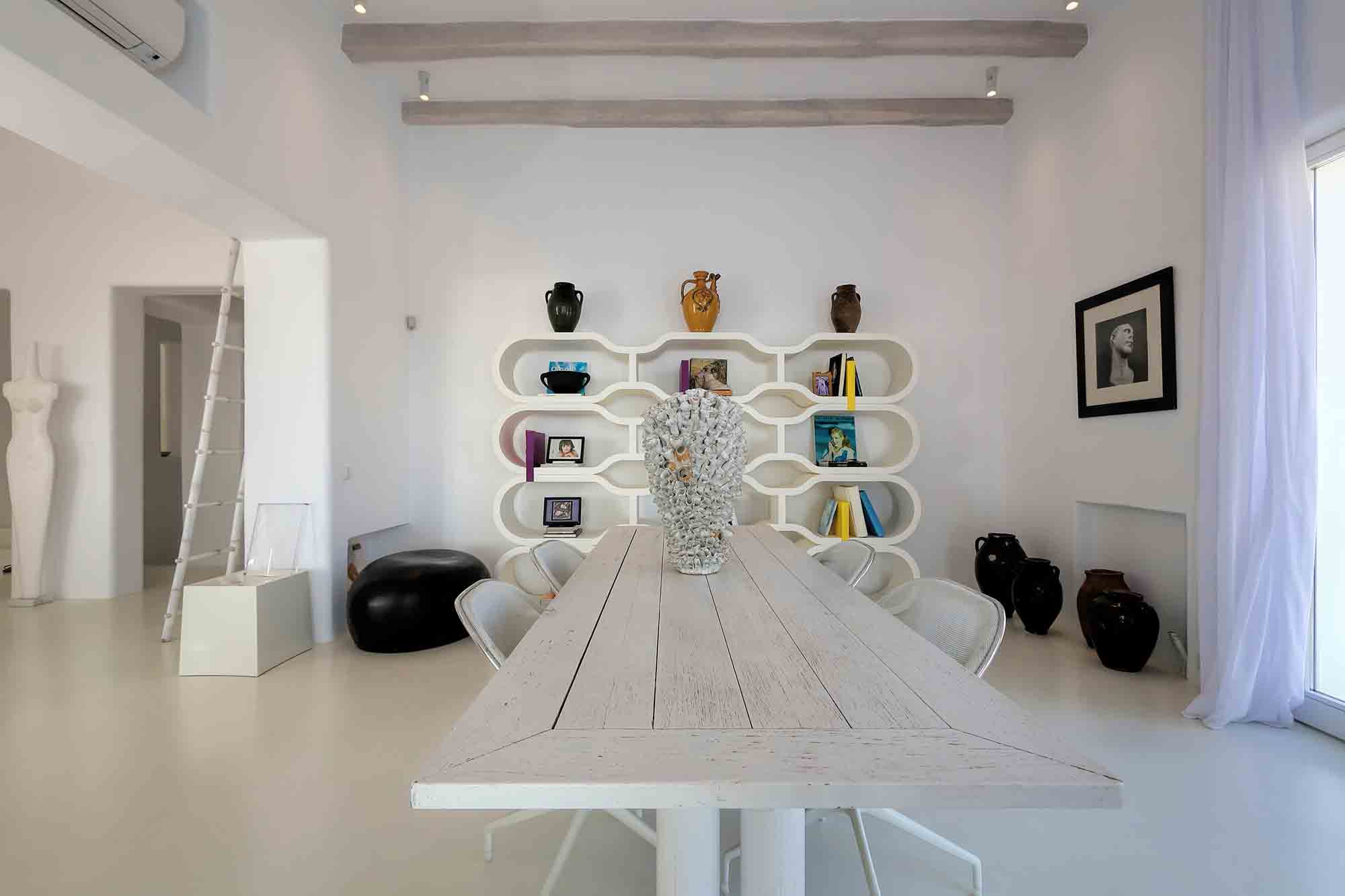 Villa Ifikleia stands out for its design, the quality of materials, and the unique blend of bohemian and contemporary styling. Sophisticated fabrics and furniture elevate the expressions of white while black touches and colorful artifacts playfully create a warm ambiance and lifestyle. The ensuite bedrooms unfold in various levels, all offering space, natural light, and impeccable comfort. The lounge and dining areas are styled to invite gatherings and relaxation, while the state-of-the-art kitchen offers the playground for food manifestations!