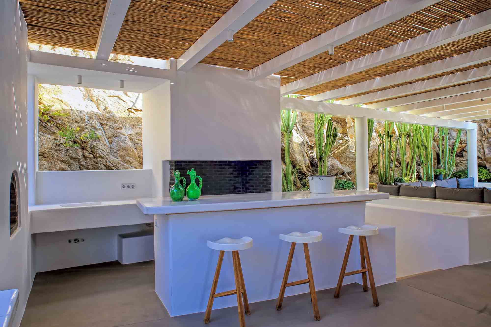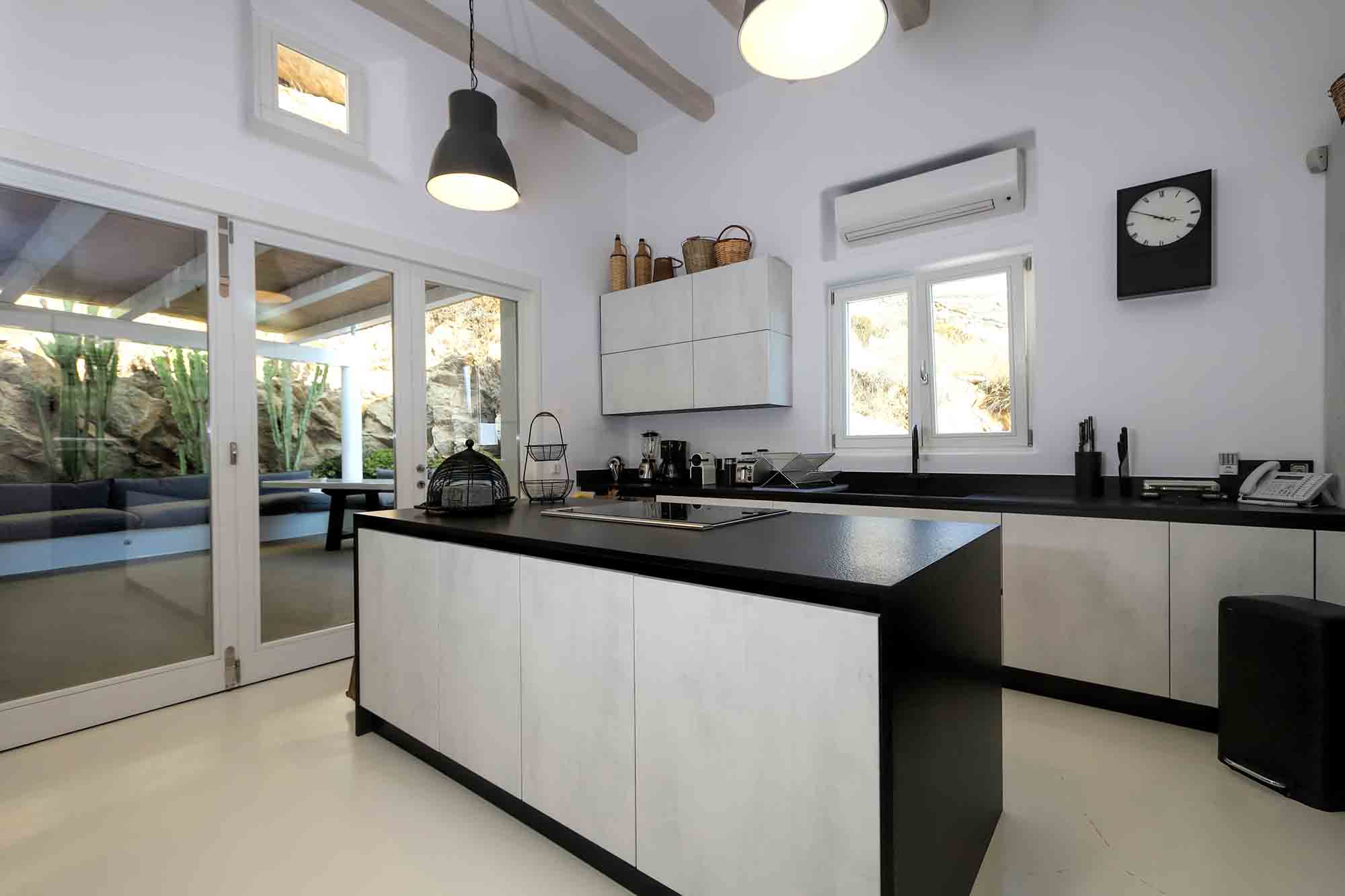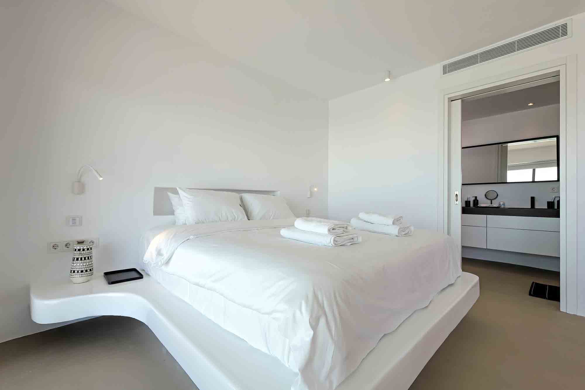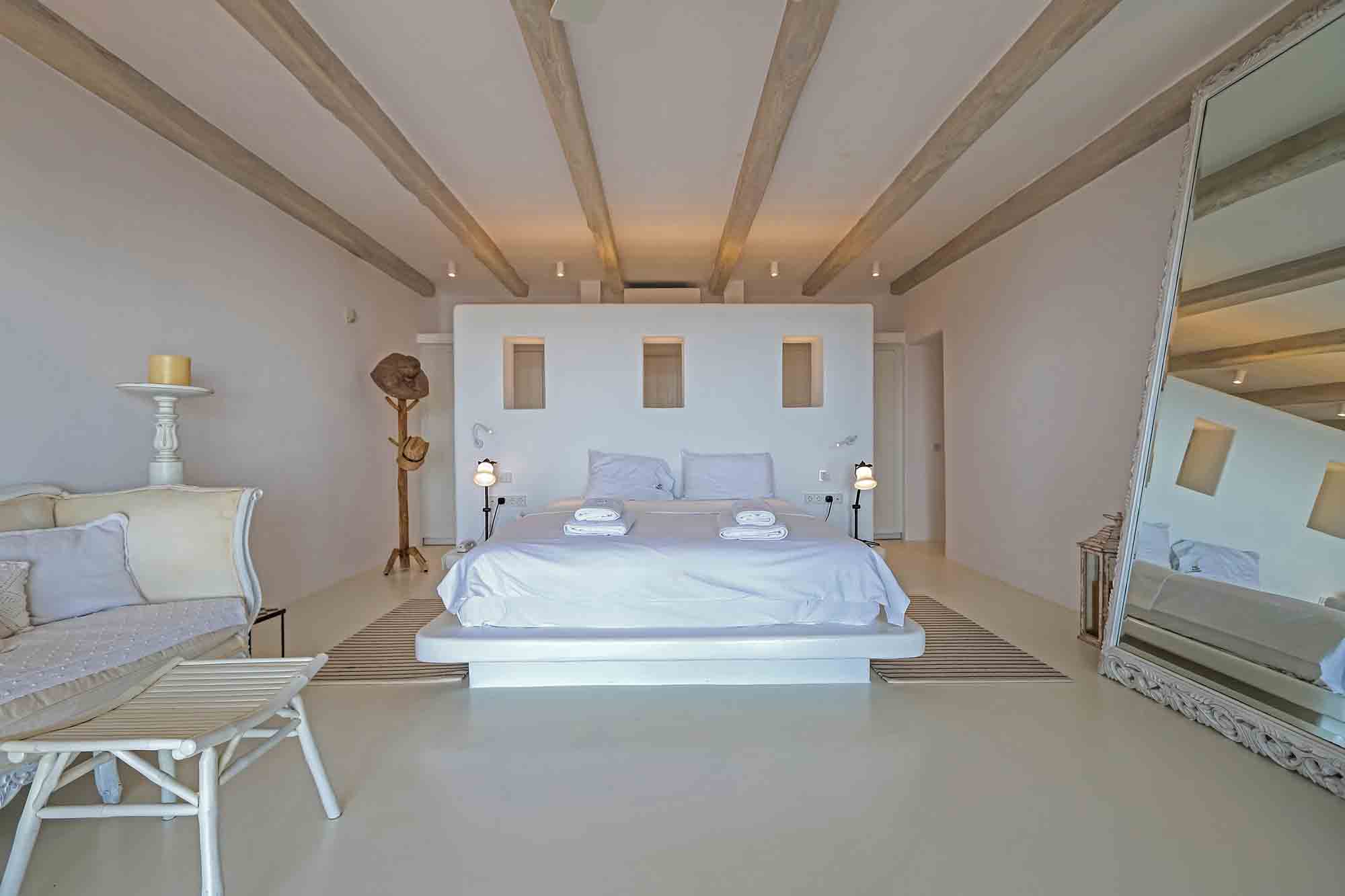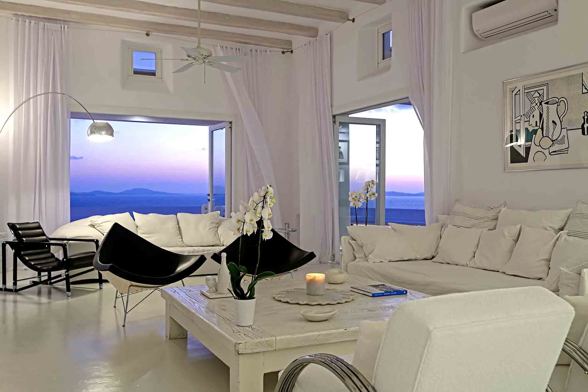 Villa Ifikleia stands out for its design, the quality of materials, and the unique blend of bohemian and contemporary styling. Sophisticated fabrics and furniture elevate the expressions of white while black touches and colorful artifacts playfully create a warm ambiance and lifestyle. The ensuite bedrooms unfold in various levels, all offering space, natural light, and impeccable comfort. The lounge and dining areas are styled to invite gatherings and relaxation, while the state-of-the-art kitchen offers the playground for food manifestations!