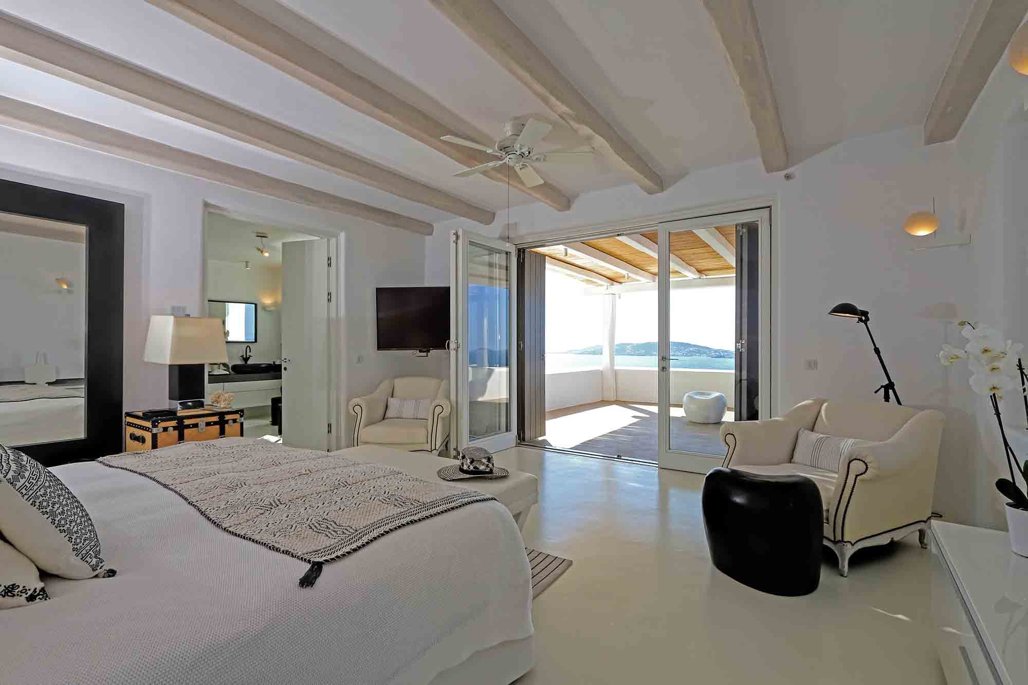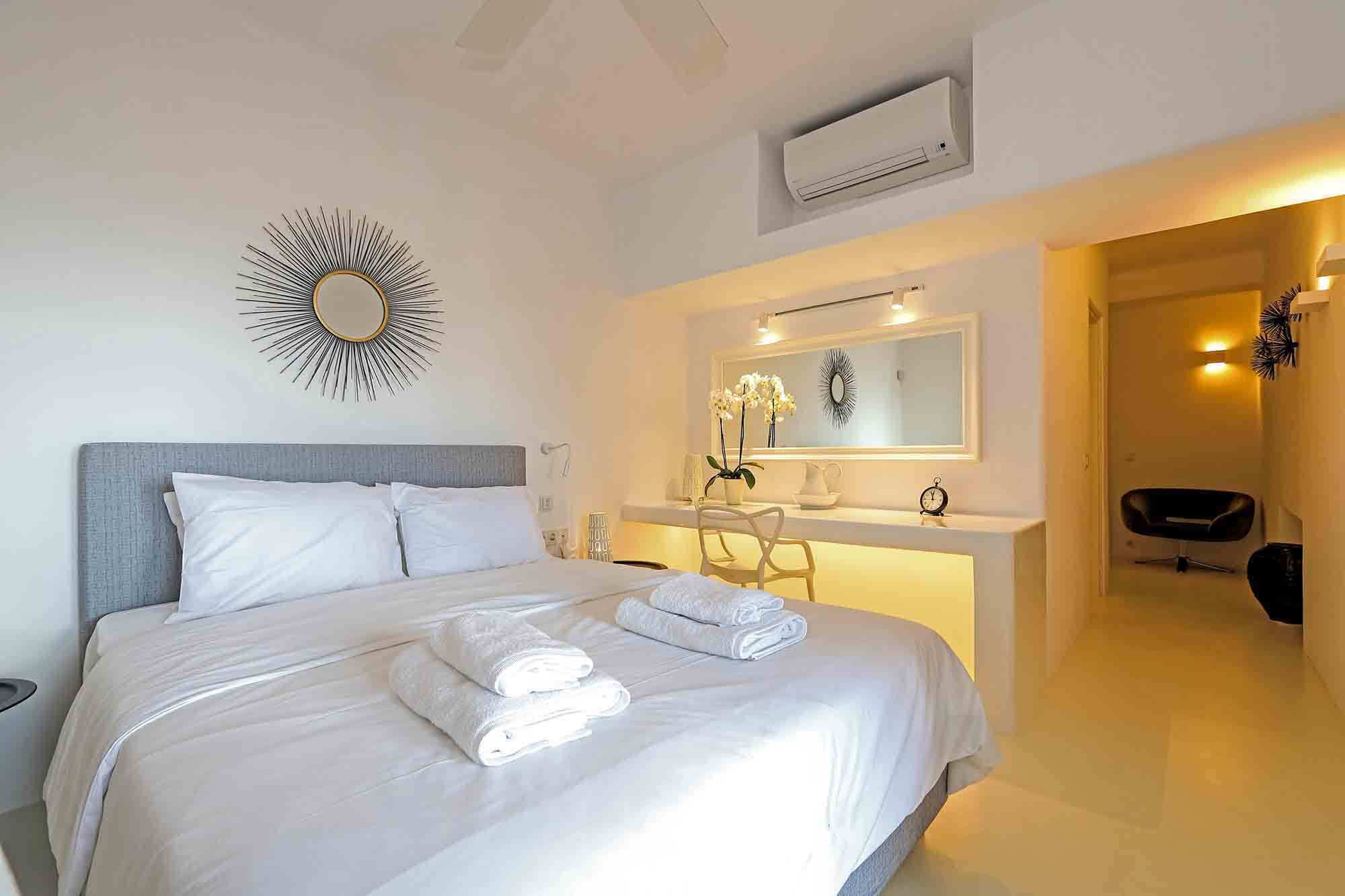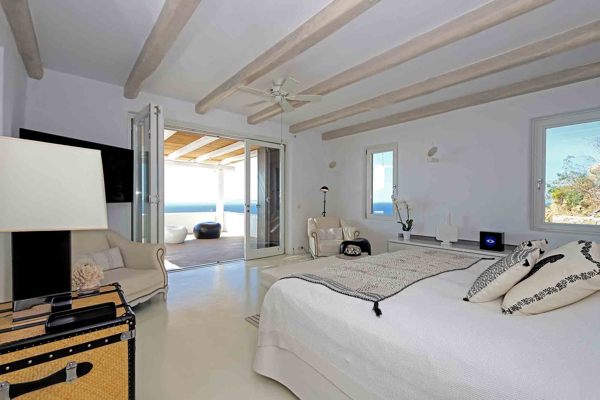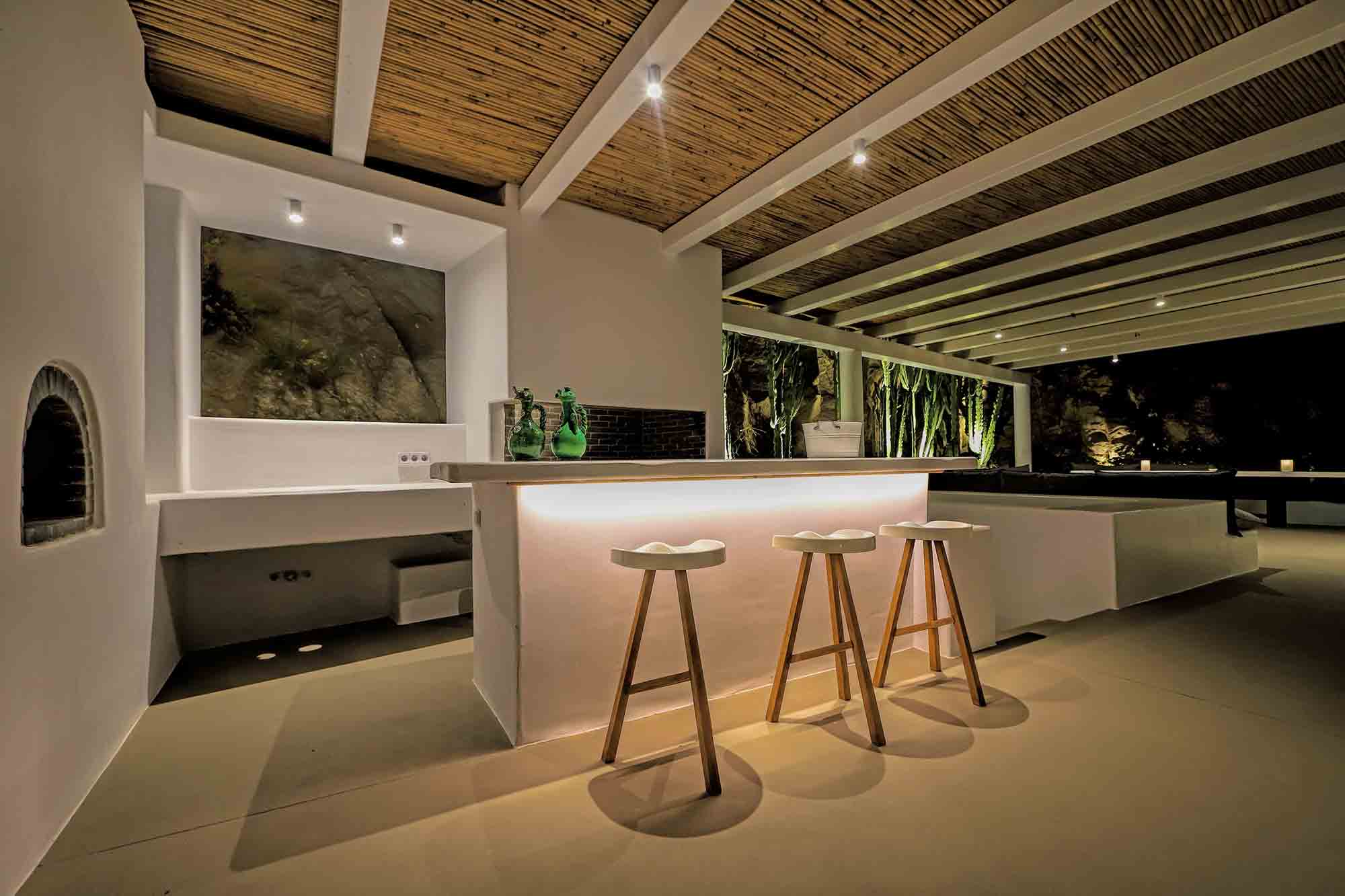 Villa Ifikleia stands out for its design, the quality of materials, and the unique blend of bohemian and contemporary styling. Sophisticated fabrics and furniture elevate the expressions of white while black touches and colorful artifacts playfully create a warm ambiance and lifestyle. The ensuite bedrooms unfold in various levels, all offering space, natural light, and impeccable comfort. The lounge and dining areas are styled to invite gatherings and relaxation, while the state-of-the-art kitchen offers the playground for food manifestations!