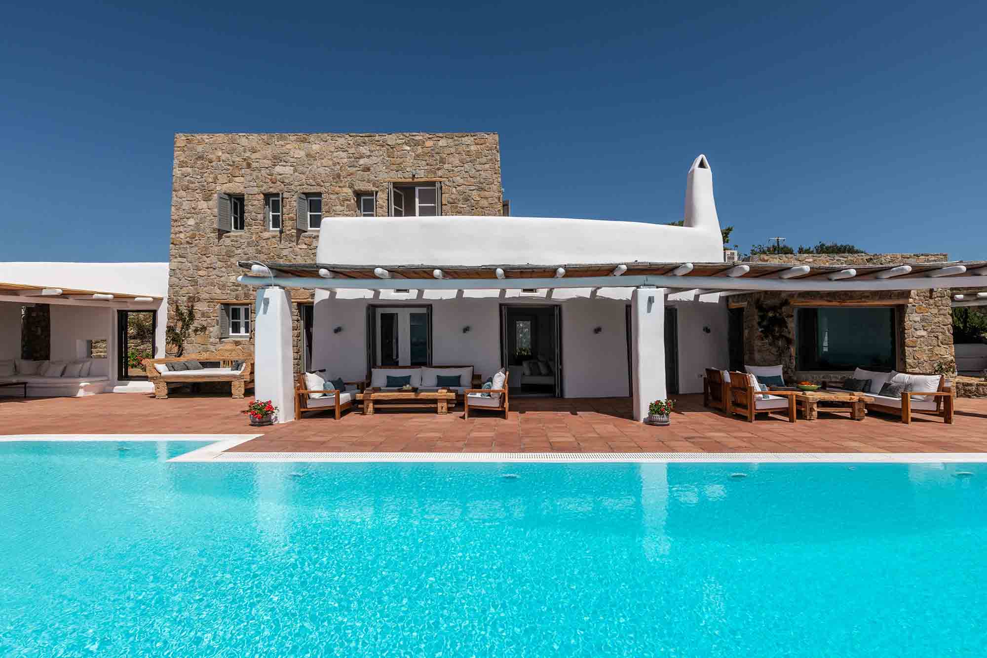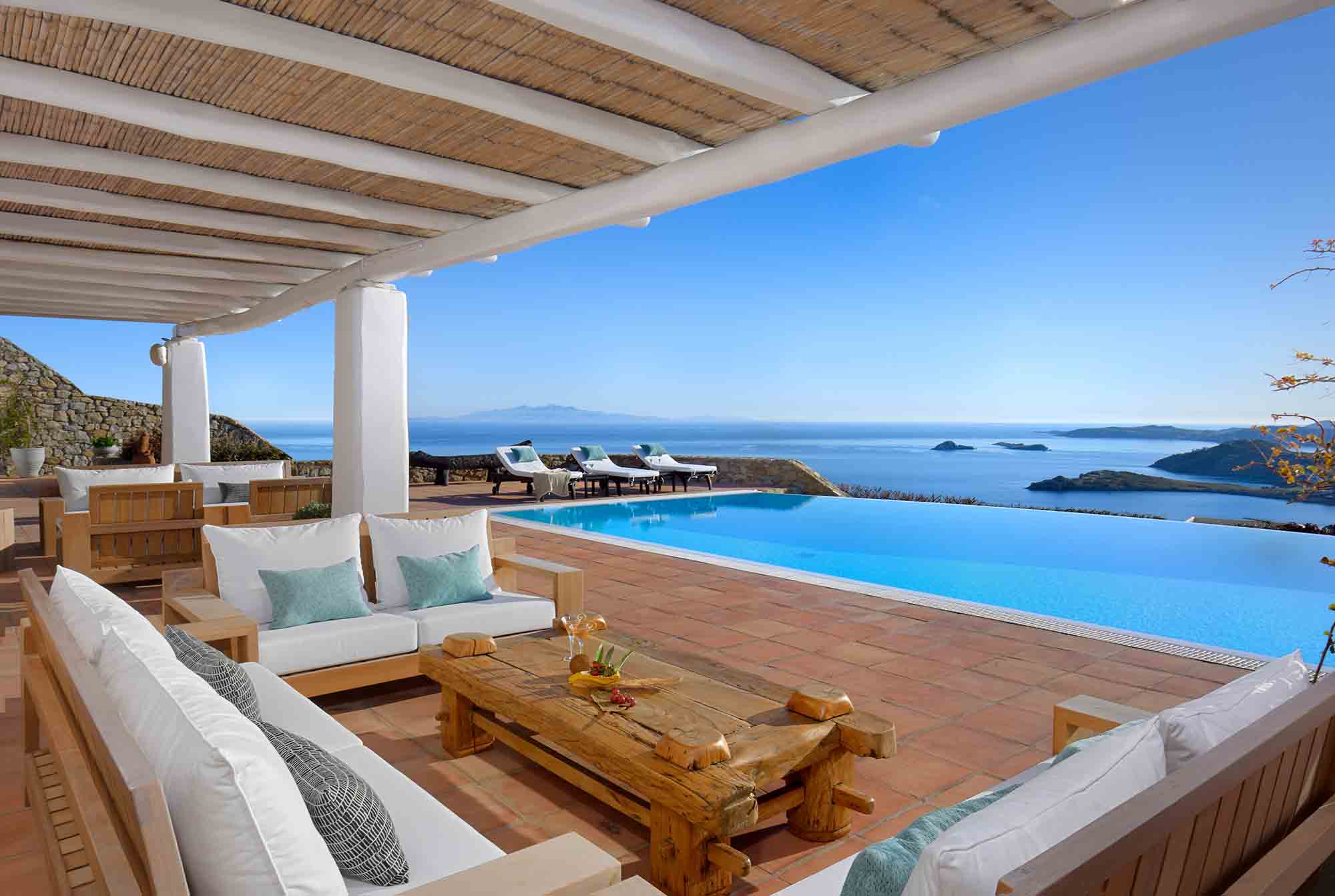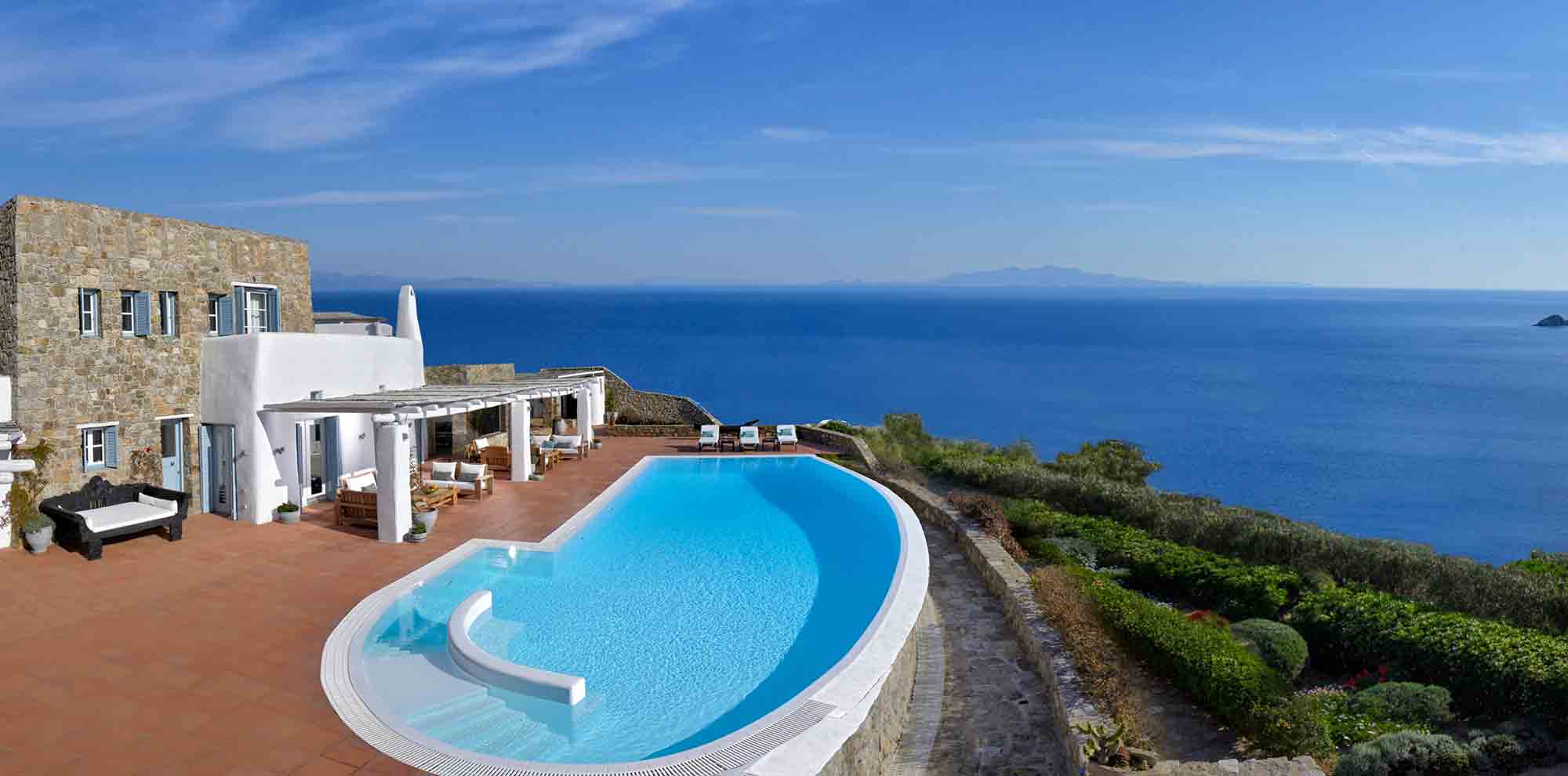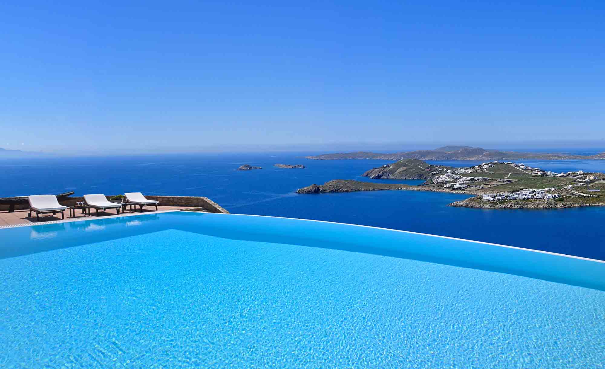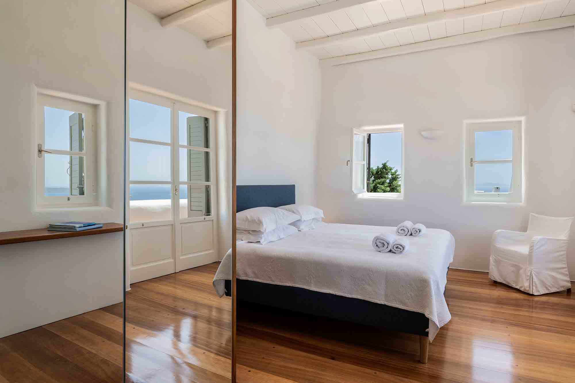 Truly breathtaking views of the blue surroundings of Mykonos transform Villa Ilios into a large and bright window to the Aegean.