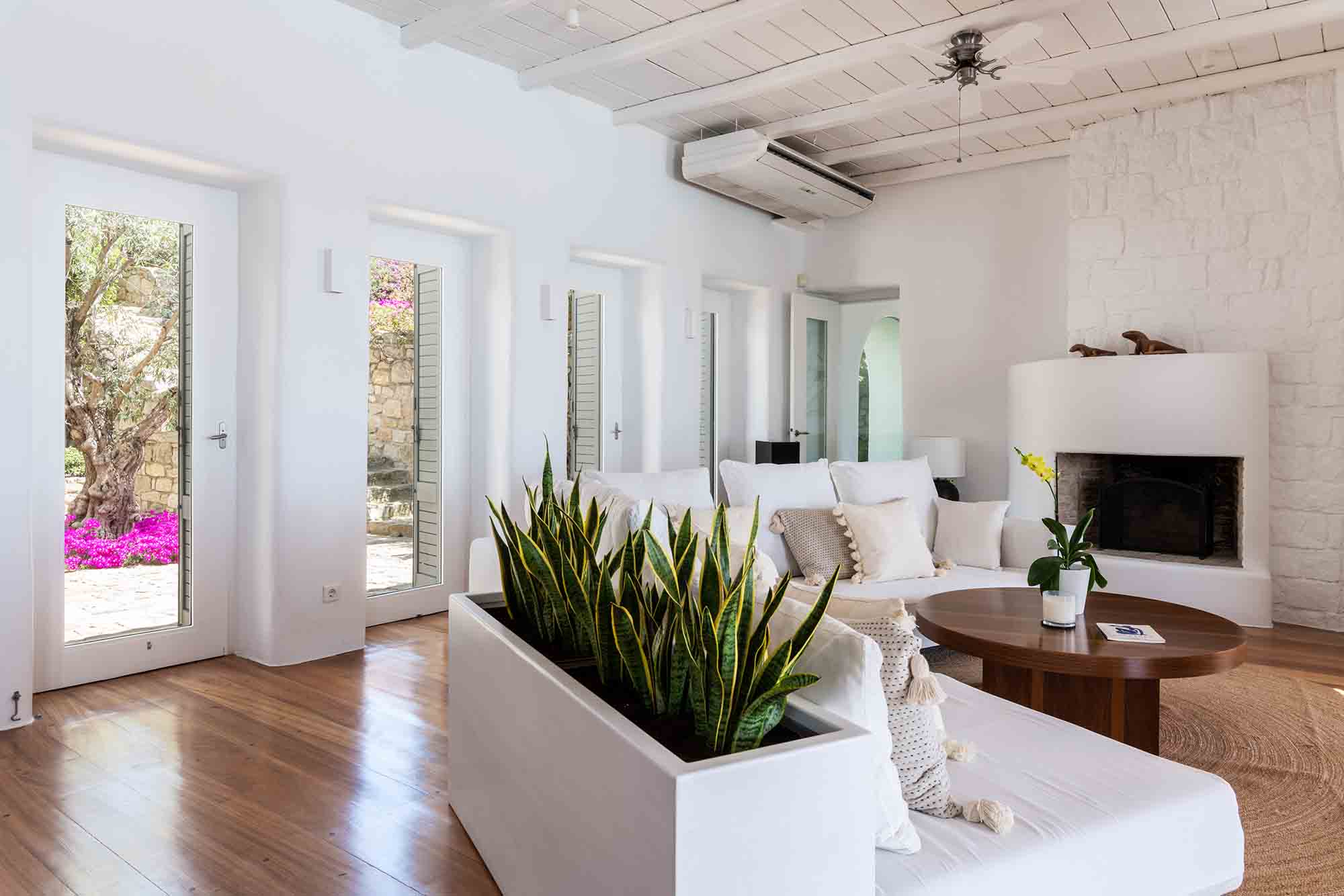 The Villa’s interior picks up the Cycladic aesthetic and works it beautifully. White-washed stone walls and a modest fireplace echo the traditional, while the necessary blue touches are provided by pillows and small furniture. An old door turned coffee table joins the old with the new.