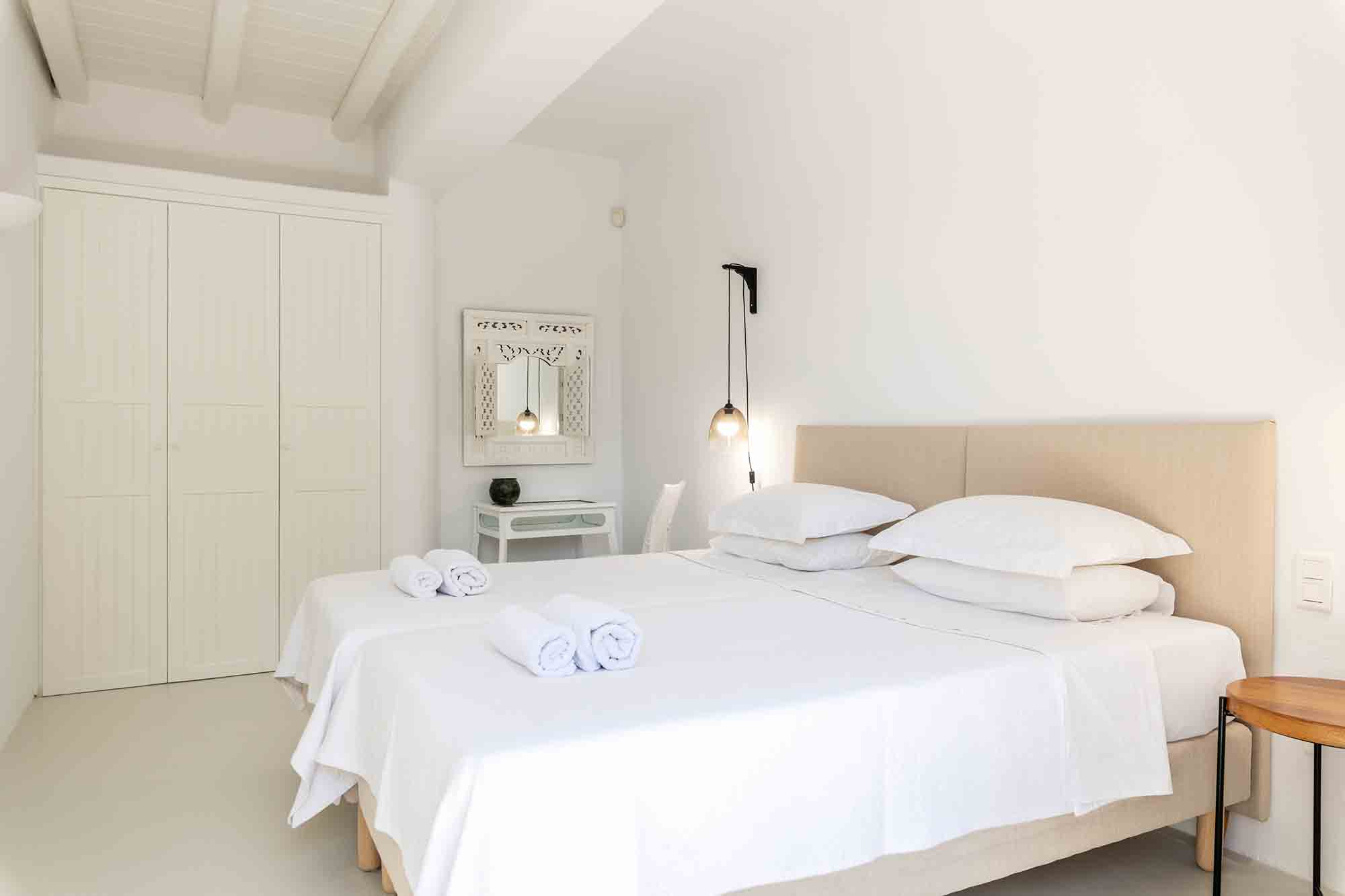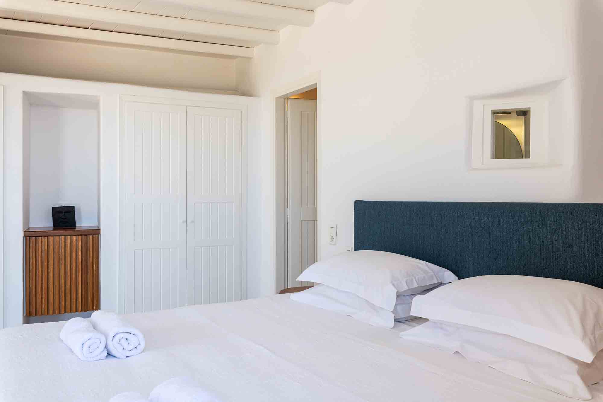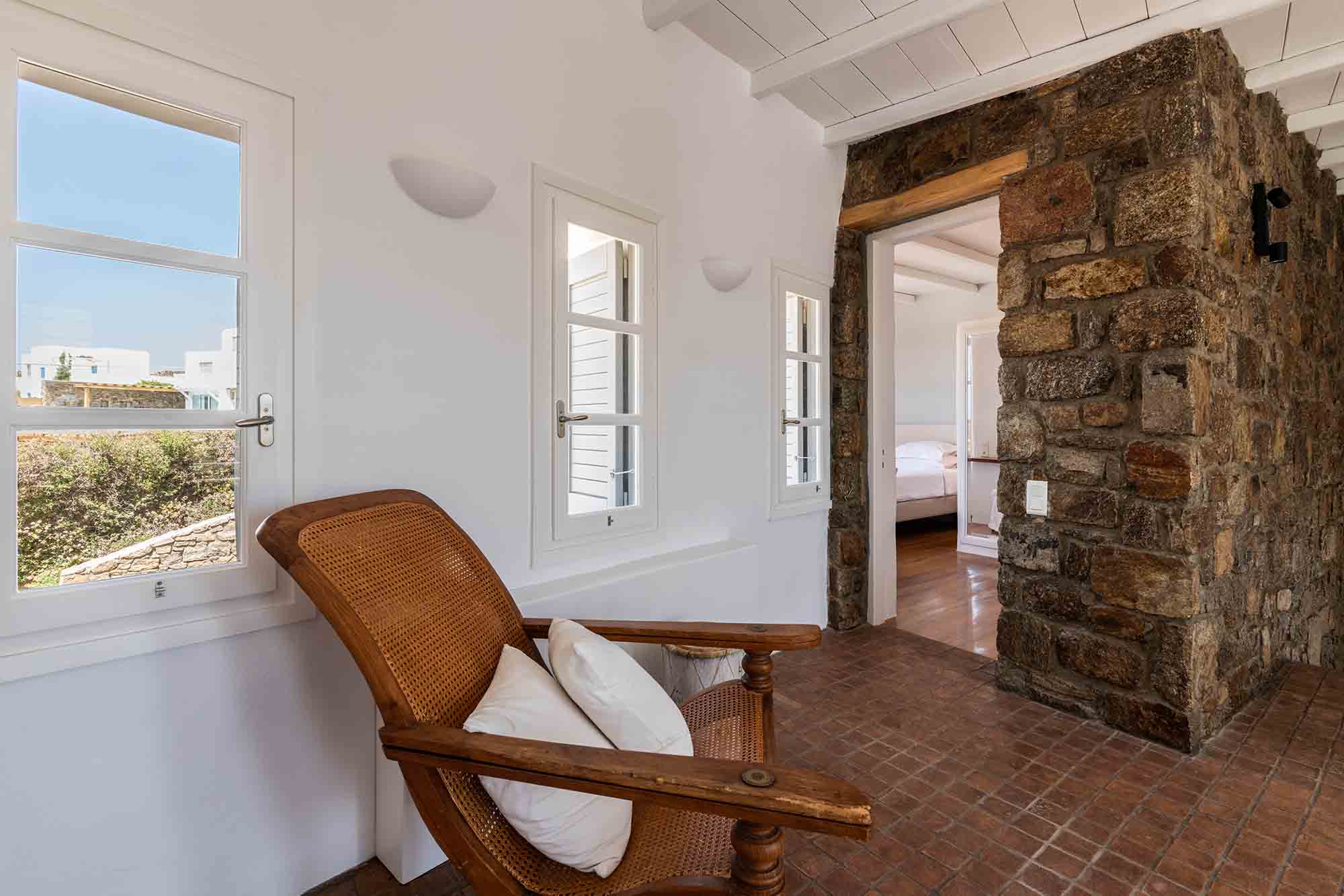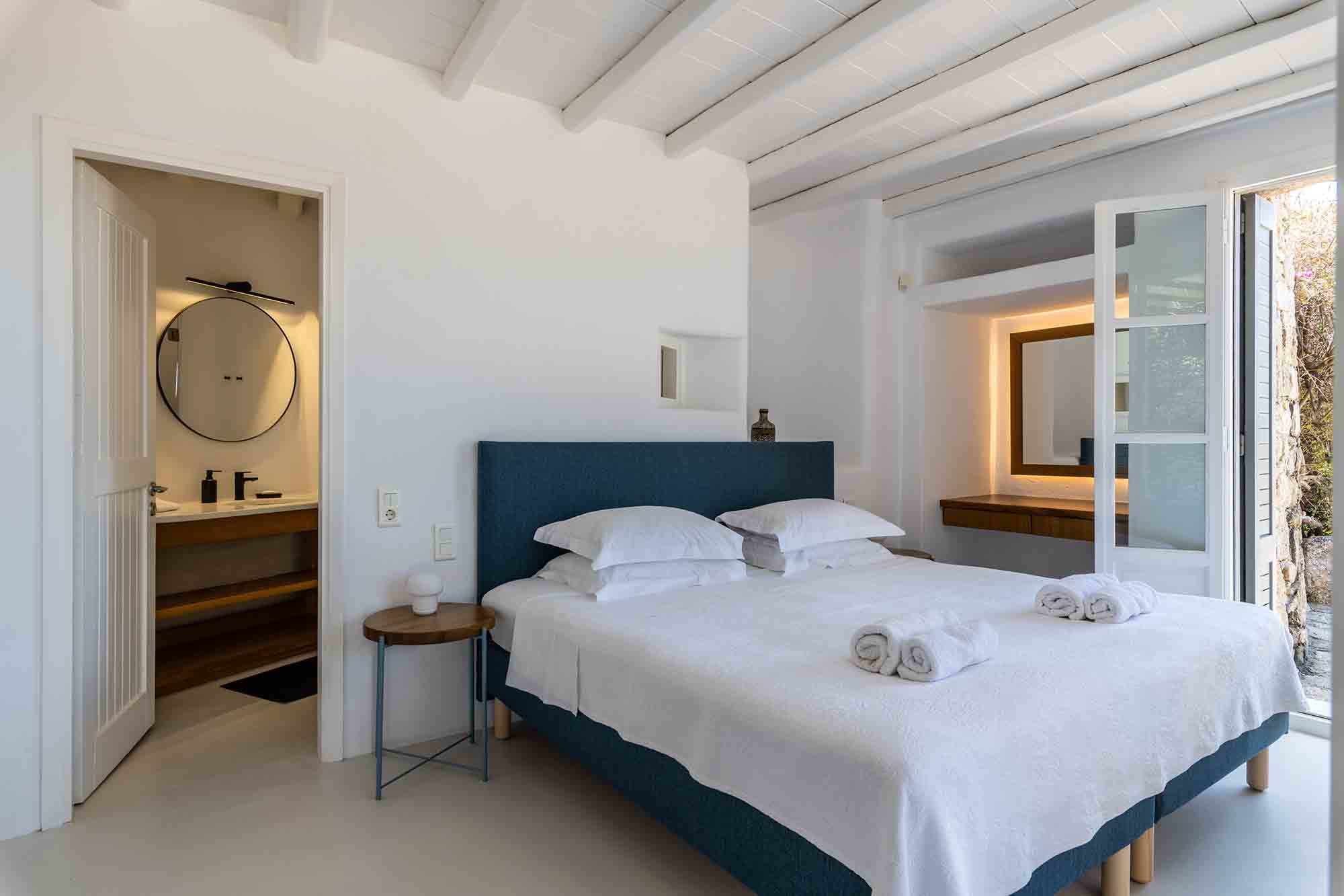 The luxury villa displays a captivating combination of stone and white-washed surfaces, with light blue windows and doors creating a playful variation to the Cycladic cobalt blue. Sitting outdoors is a must, as authentic Balinese furniture exude an exotic atmosphere and a spacious dining area entertains guests with beyond spaces expectations. The Villa’s swimming pool appears to be one with the sea below, while the wild garden, where cacti and lavender coexist, reinforces an overall feeling of seclusion and privacy.