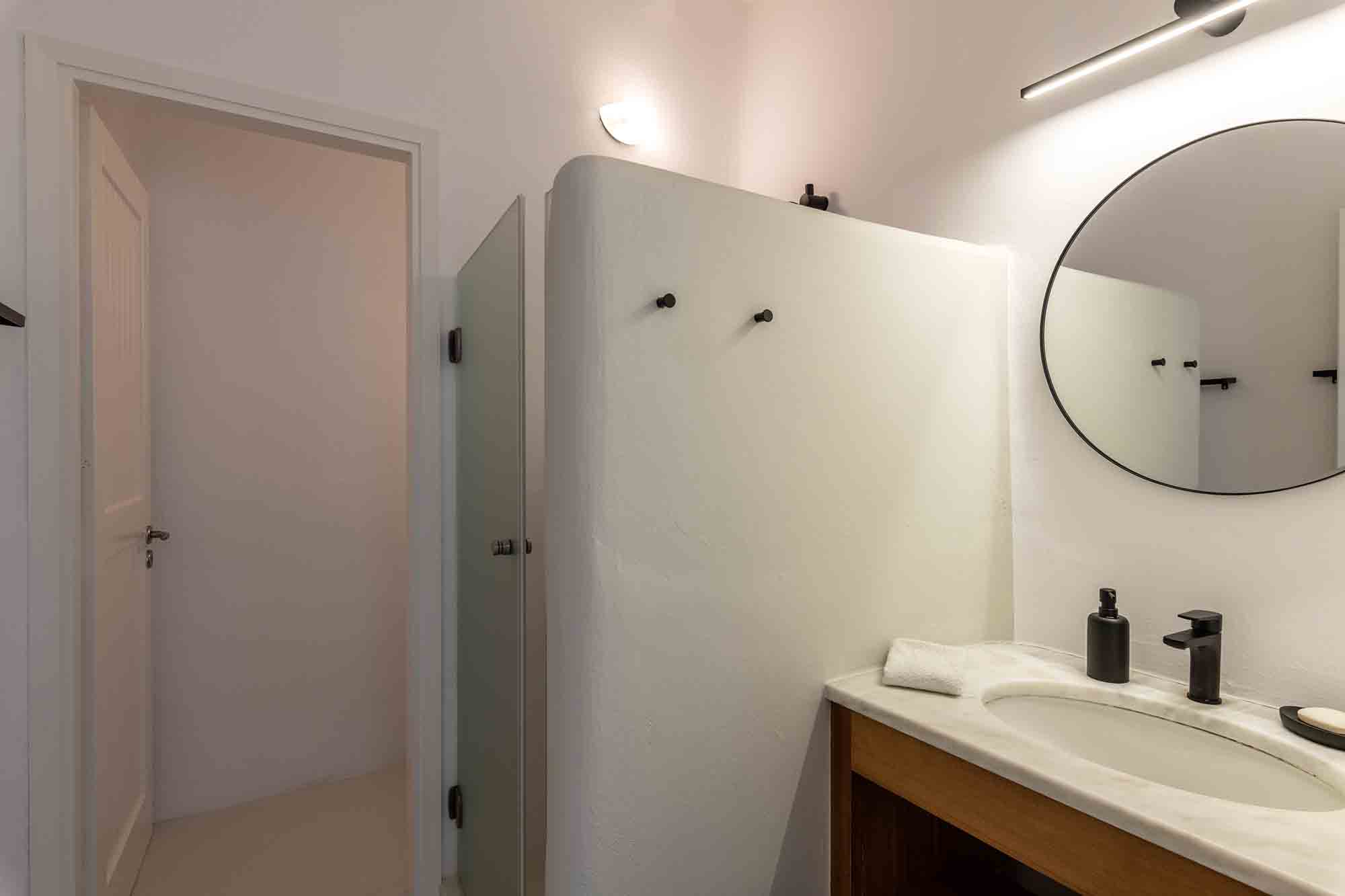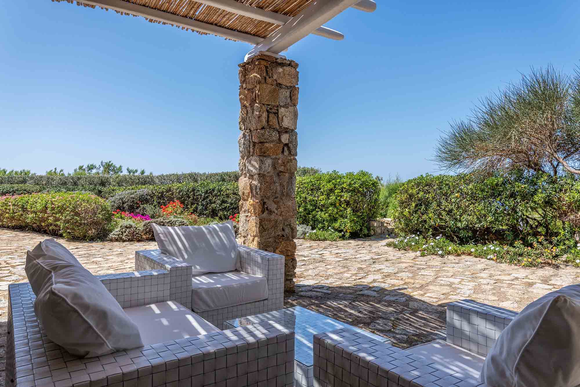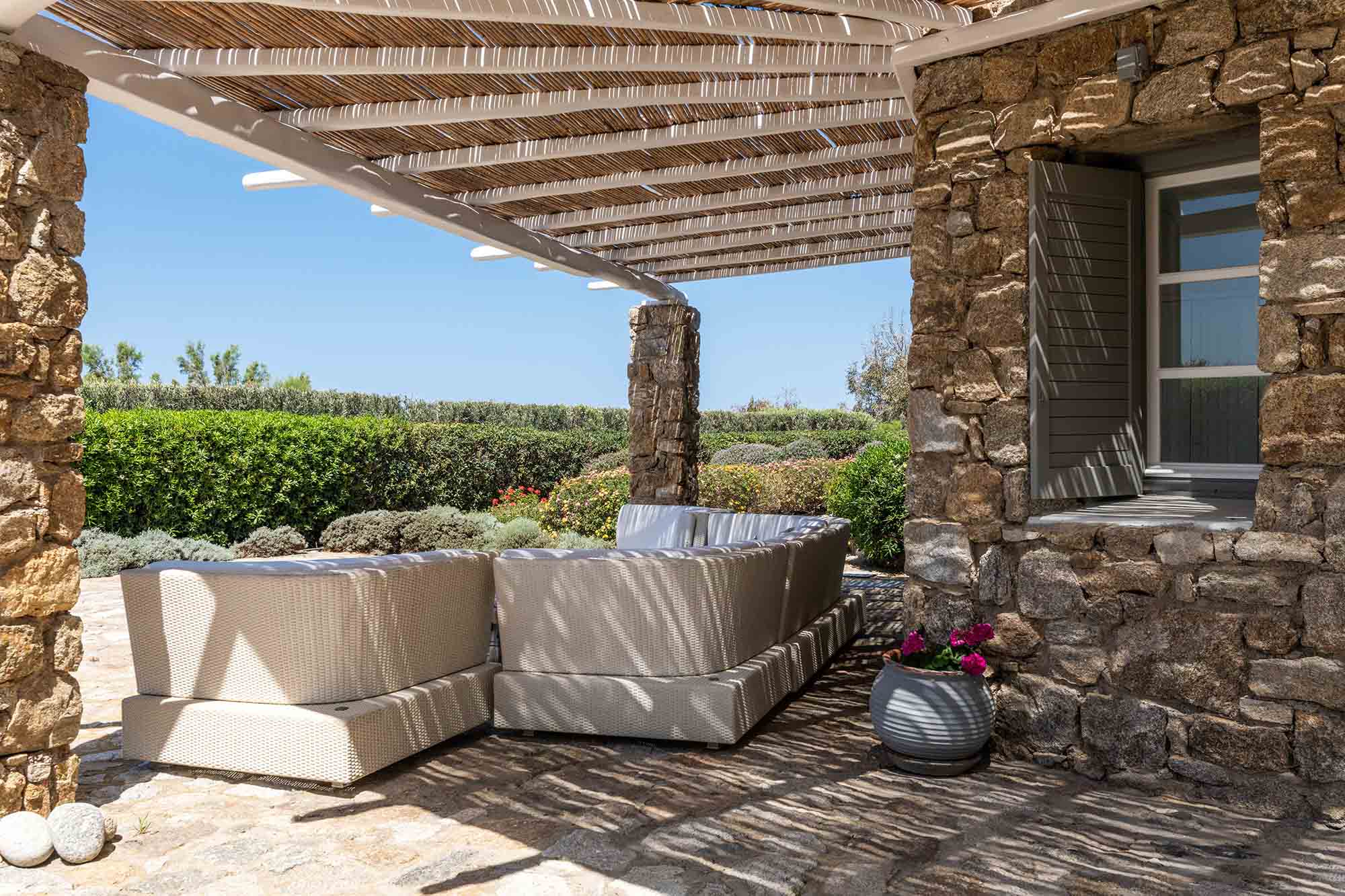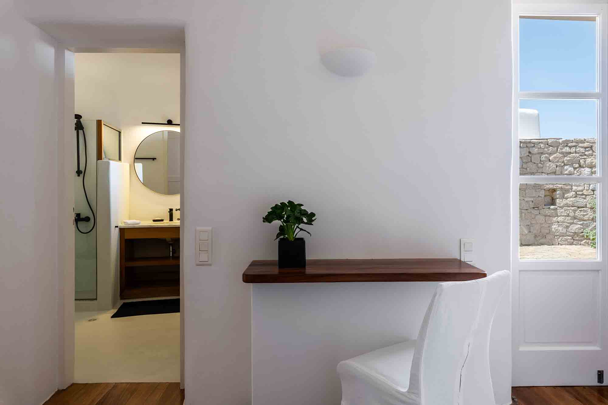 The luxury villa displays a captivating combination of stone and white-washed surfaces, with light blue windows and doors creating a playful variation to the Cycladic cobalt blue. Sitting outdoors is a must, as authentic Balinese furniture exude an exotic atmosphere and a spacious dining area entertains guests with beyond spaces expectations. The Villa’s swimming pool appears to be one with the sea below, while the wild garden, where cacti and lavender coexist, reinforces an overall feeling of seclusion and privacy.