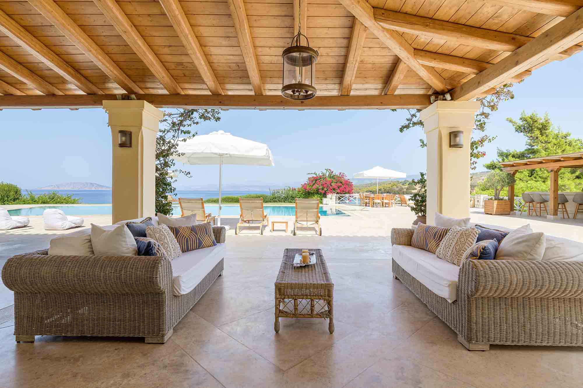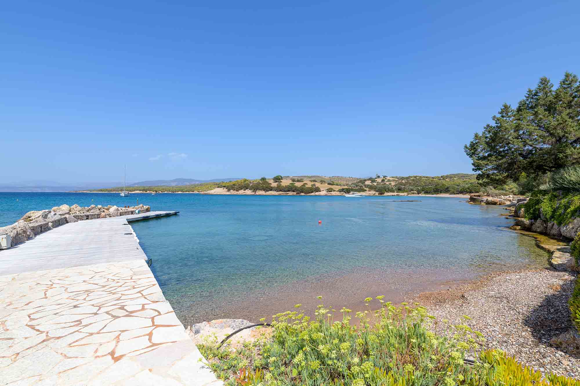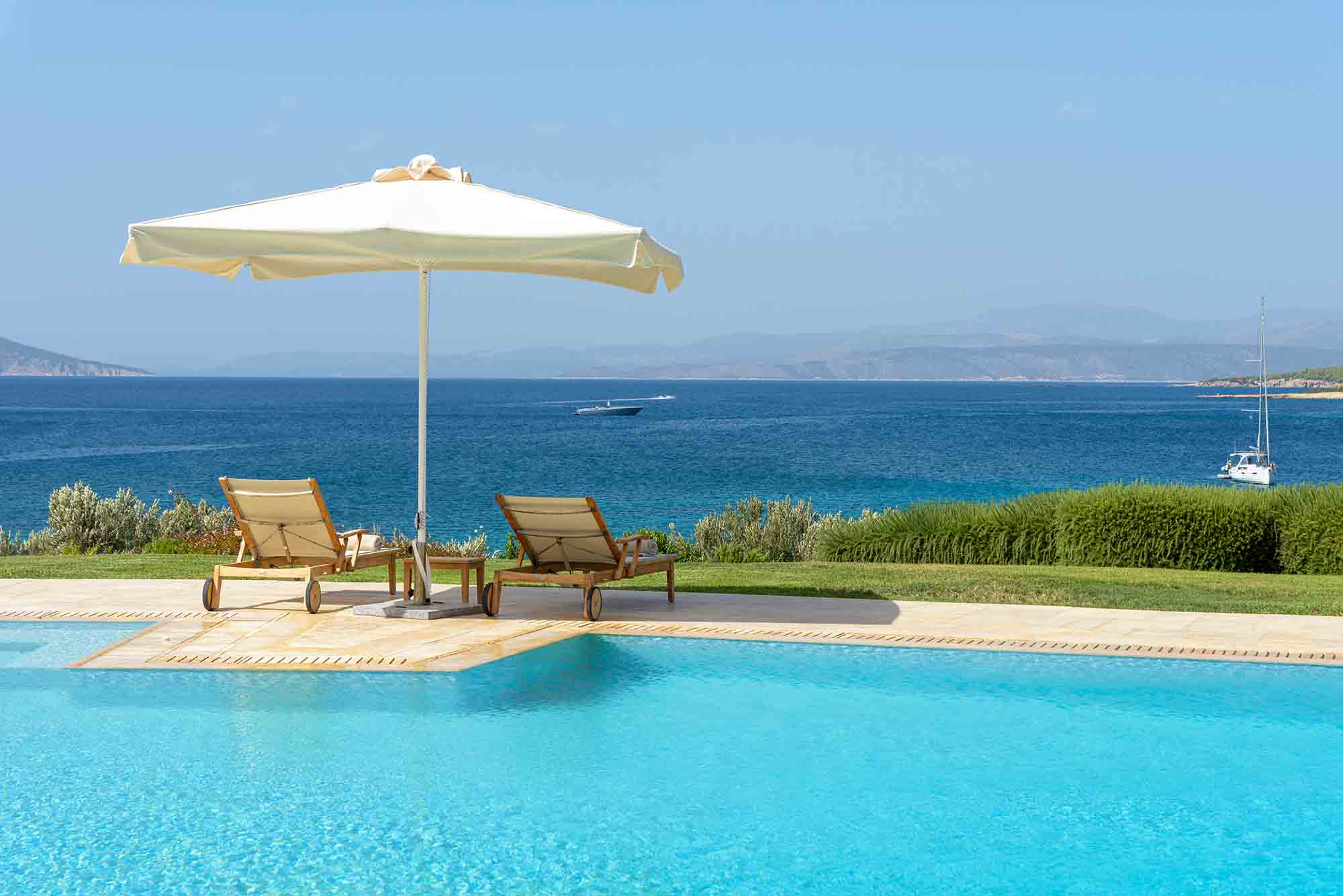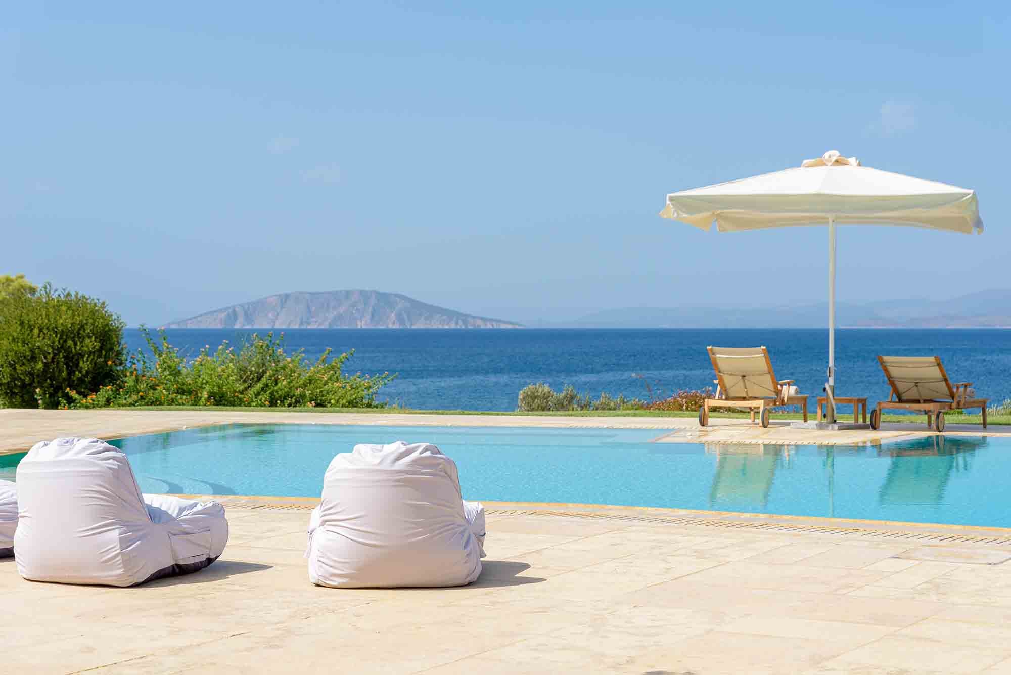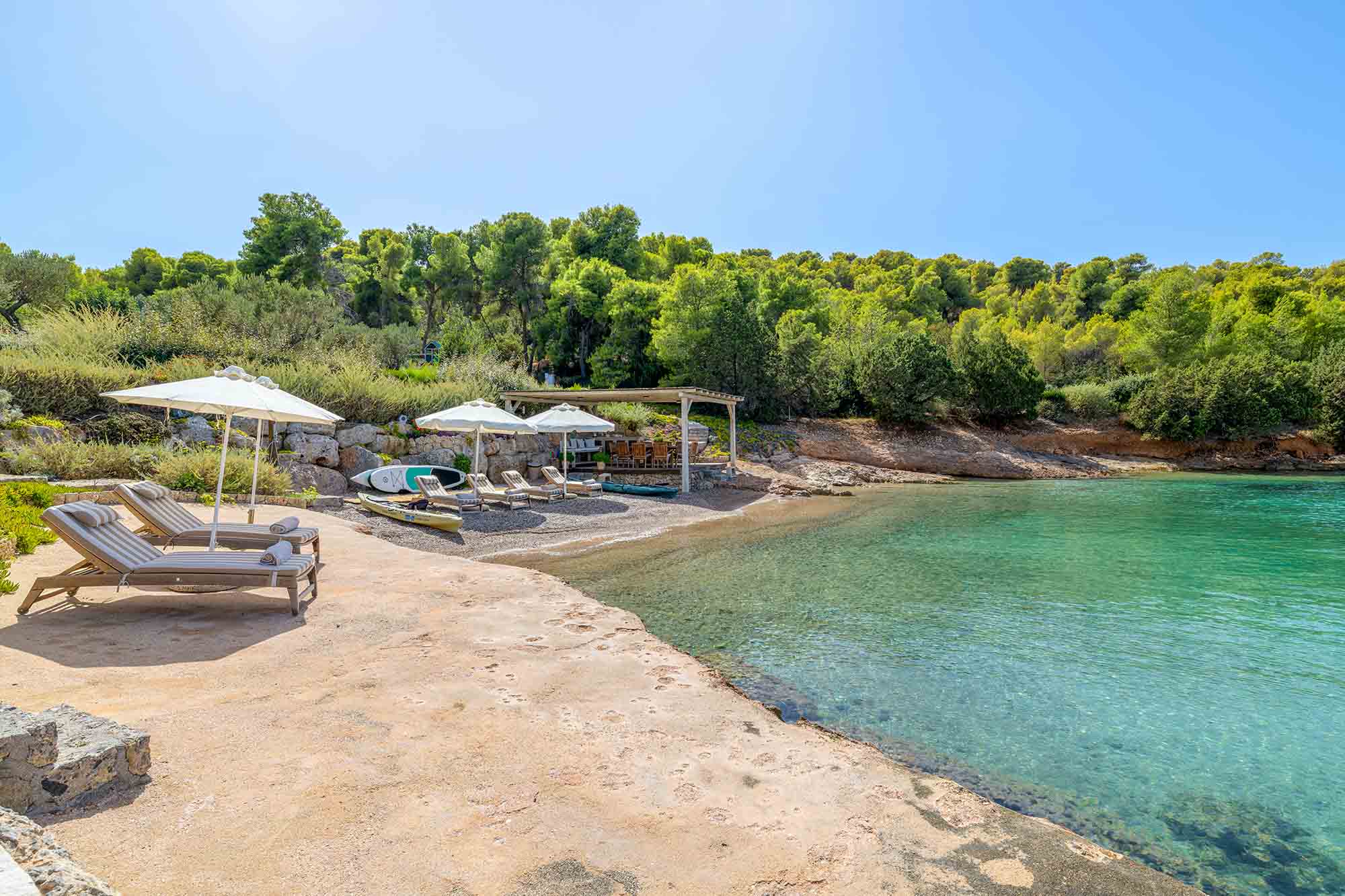 The outdoor landscape offers the perfect setting to enjoy the property day or night. With sea access and uninterrupted views, the pool area is at center stage surrounded by lounge and dining areas for guests to gather and relax. The private sandy beach is a few steps away offering a shaded area with sunbeds while the staff takes care of your every request so you can relax and unwind.