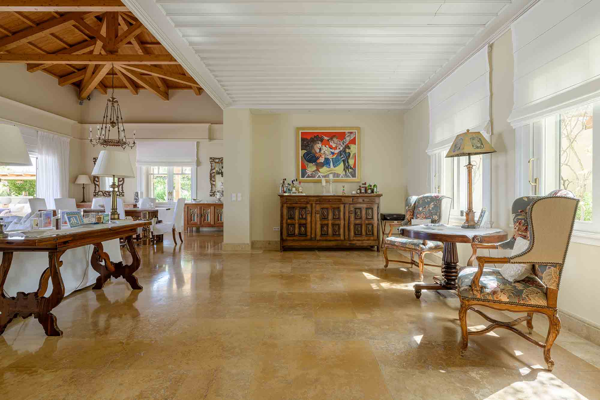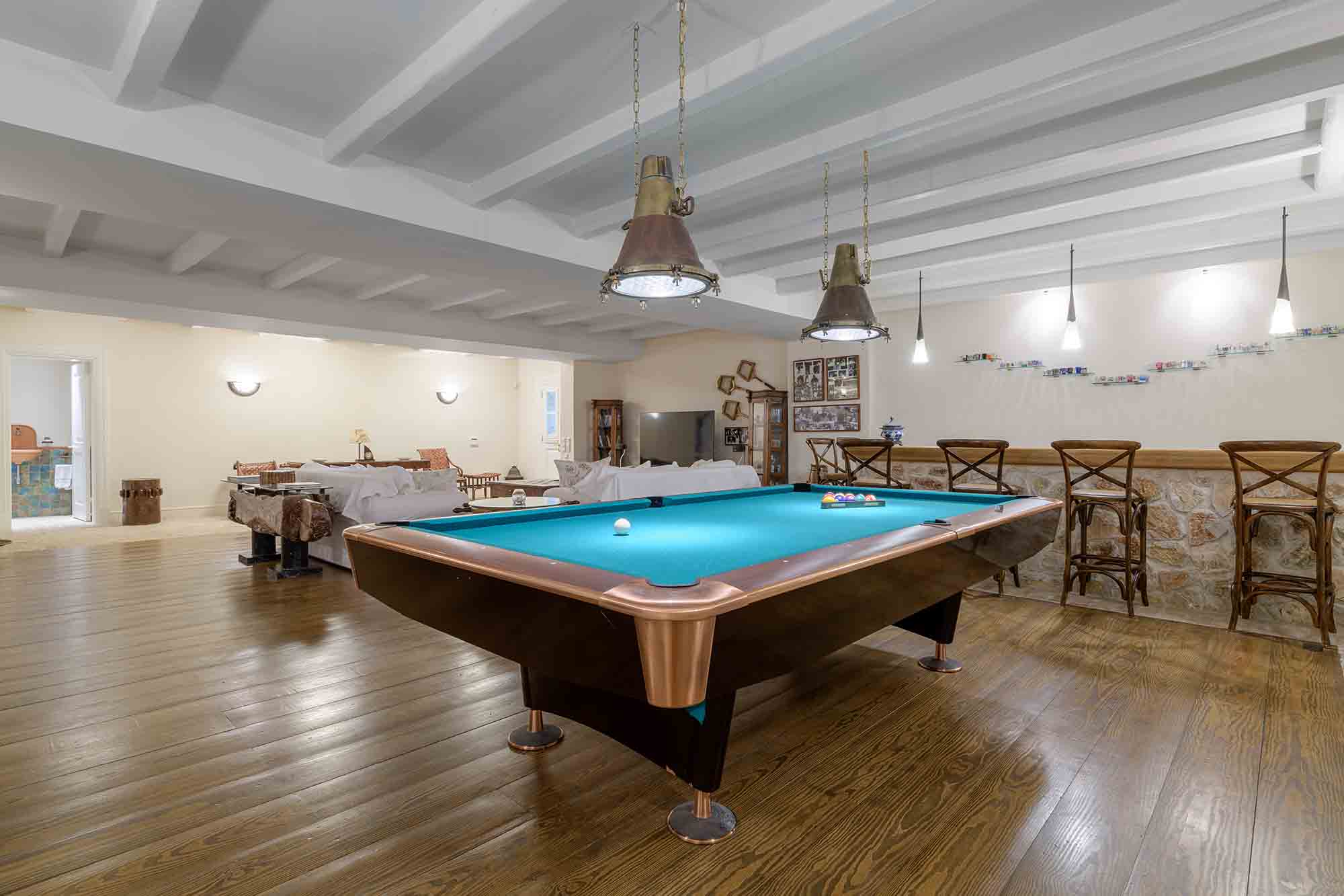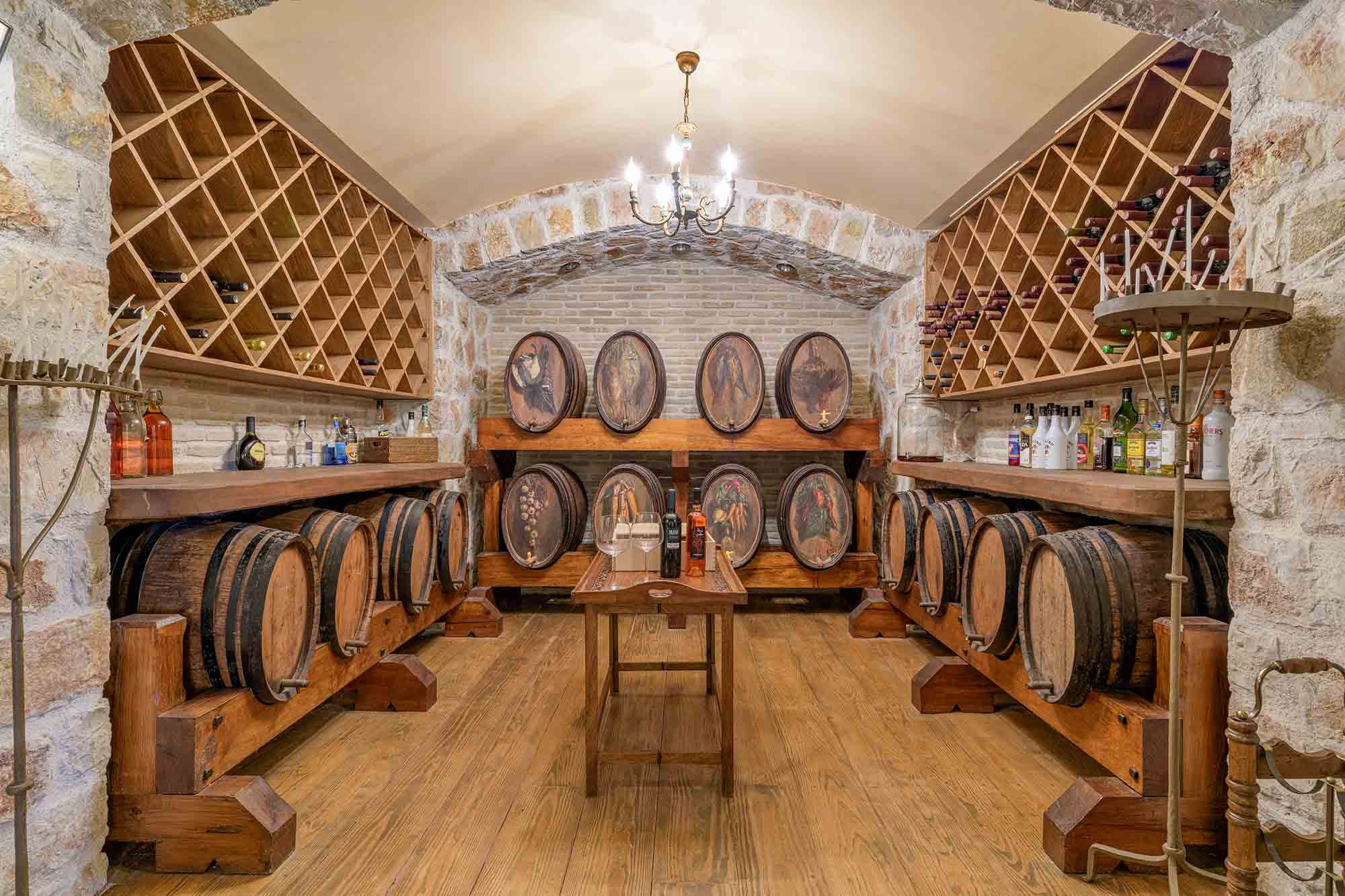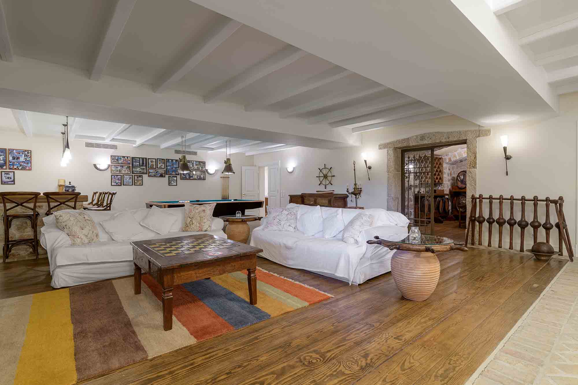 The interior design enhances the aristocratic ambiance of the estate, with carefully selected antiques, furniture, and fabrics, while floor-to-ceiling windows lead directly to the pool area. The lower level features a cozier quarter with a lounge area, a pool table, and a wine cellar along with a bar. The nine bedrooms of the property offer a relaxed and spacious setting, in a neutral yet sophisticated décor where pallet and neutral colors blend with the wood and the outdoor natural colors and light.