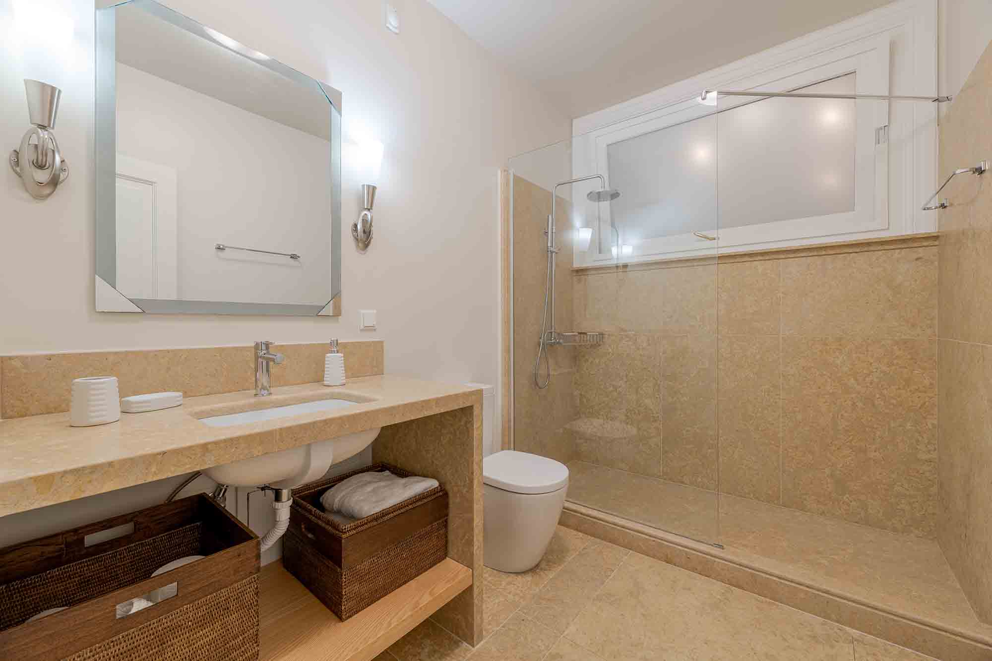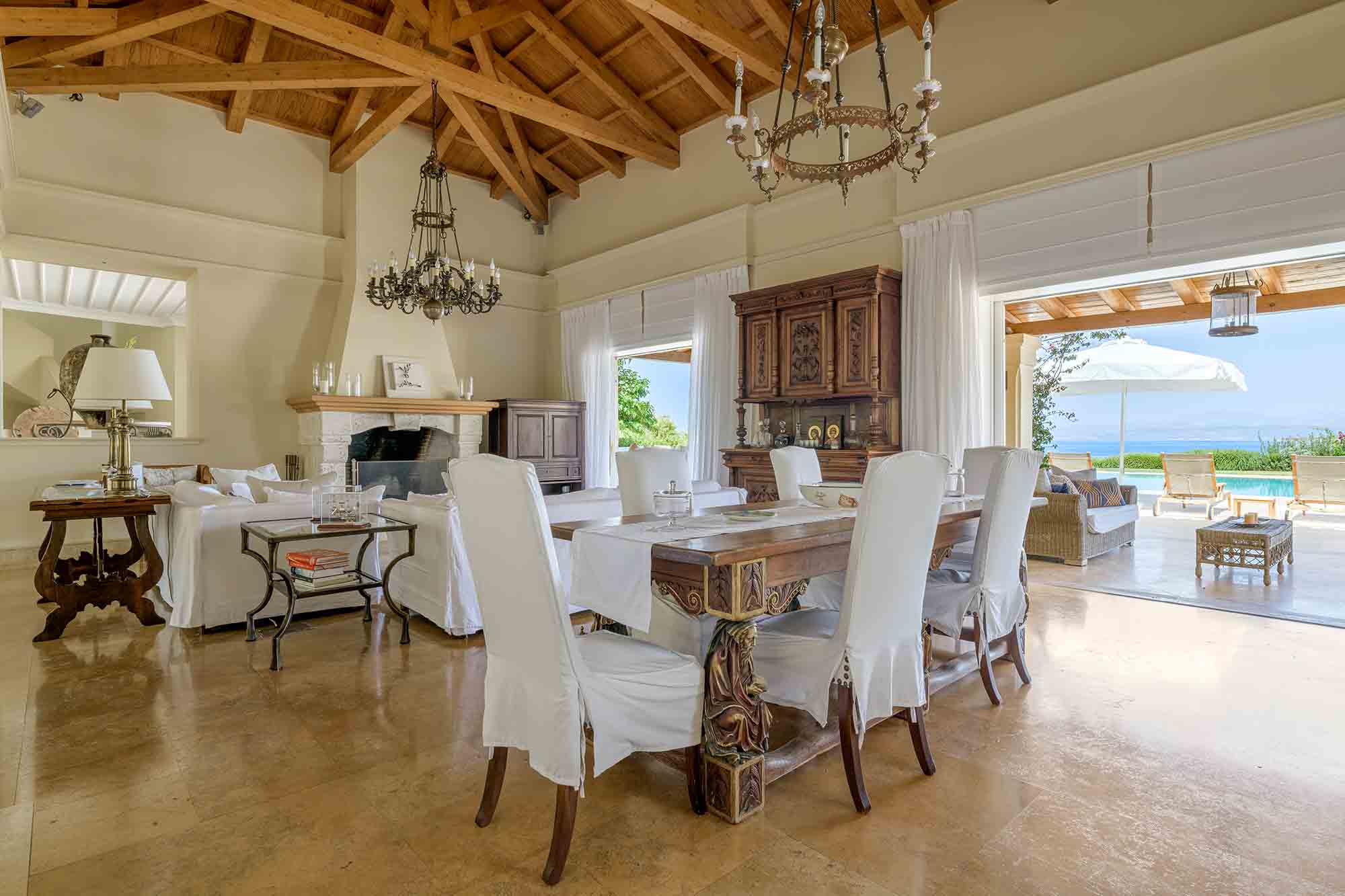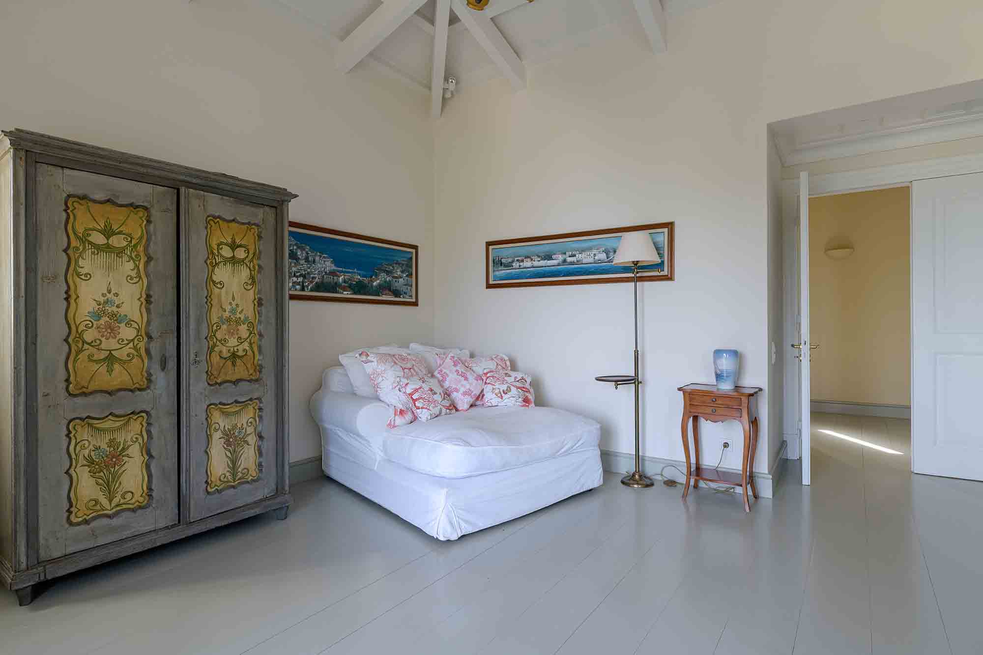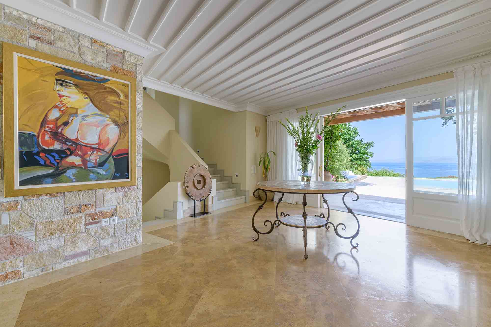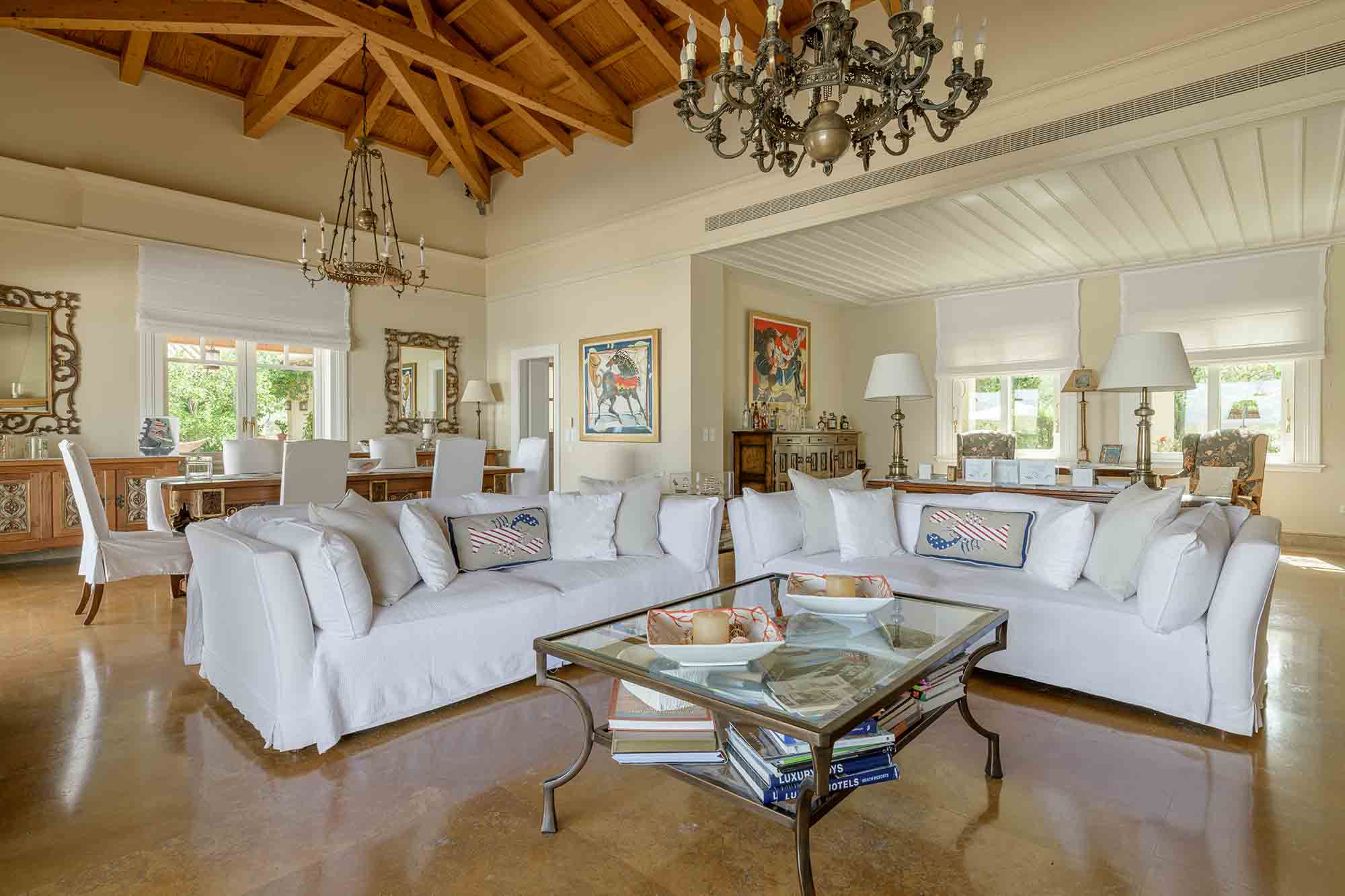 The interior design enhances the aristocratic ambiance of the estate, with carefully selected antiques, furniture, and fabrics, while floor-to-ceiling windows lead directly to the pool area. The lower level features a cozier quarter with a lounge area, a pool table, and a wine cellar along with a bar. The nine bedrooms of the property offer a relaxed and spacious setting, in a neutral yet sophisticated décor where pallet and neutral colors blend with the wood and the outdoor natural colors and light.