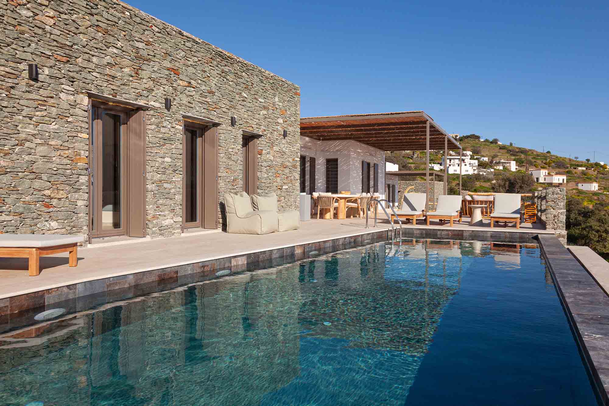 From every corner of the residence, your gaze is drawn to the unparalleled vistas overlooking the historic settlement of Kastro, the endless blue of the Aegean Sea, and the islands of Syros, Tinos, Mykonos, Paros, and Delos. The two infinity pools appear to merge with the horizon, evoking a captivating sense of tranquility beyond spaces.