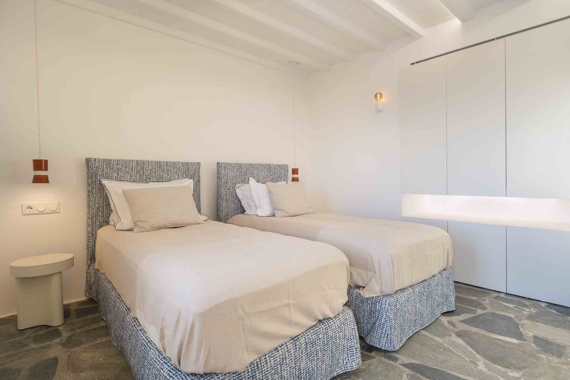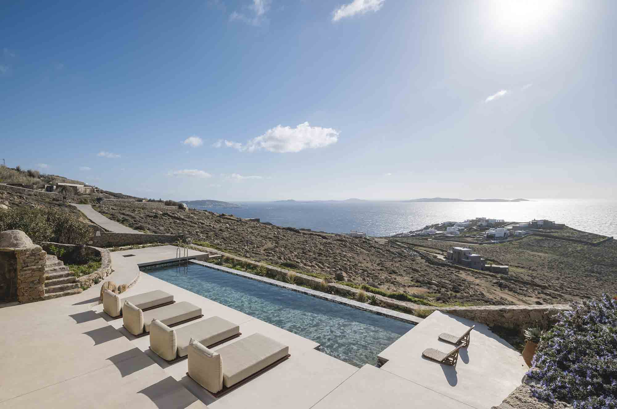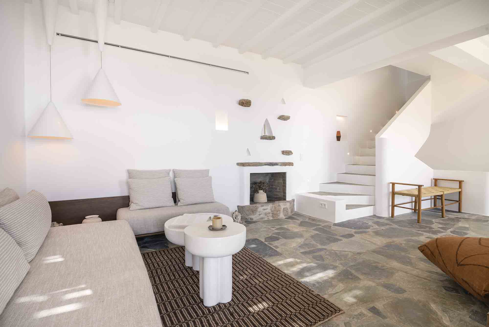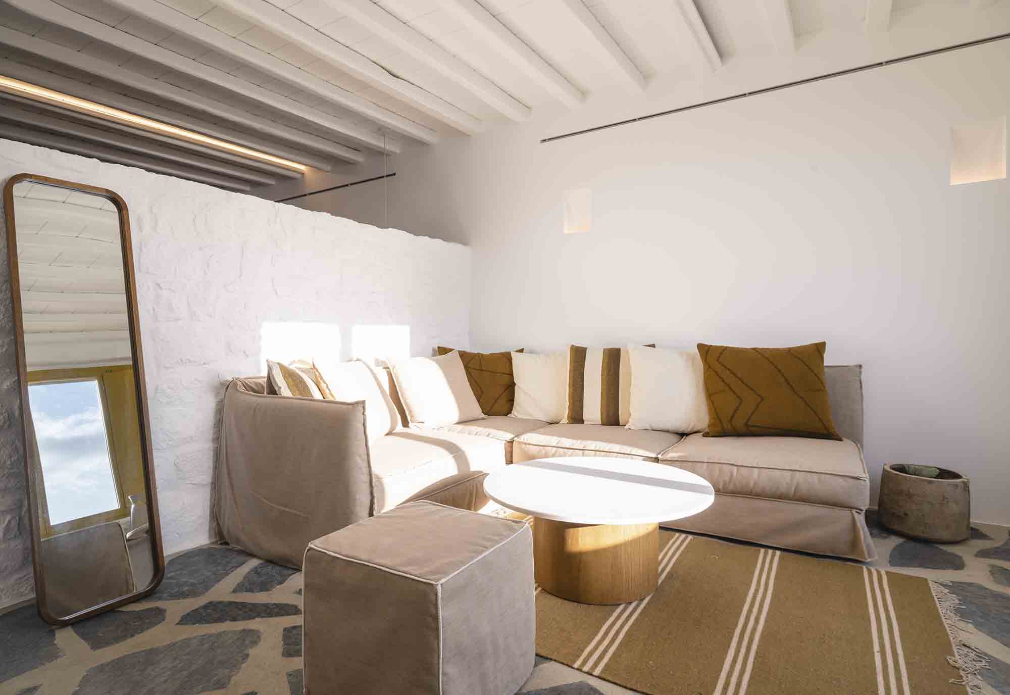 The property combines refined Cycladic architecture with modern design elements, featuring carefully curated interiors and high-end finishes throughout. Inside, the villa showcases bright, airy interiors where contemporary style meets traditional Mykonian elements. Natural stone details are thoughtfully incorporated, helping maintain a cool, serene atmosphere while enhancing the connection to the island’s natural beauty.