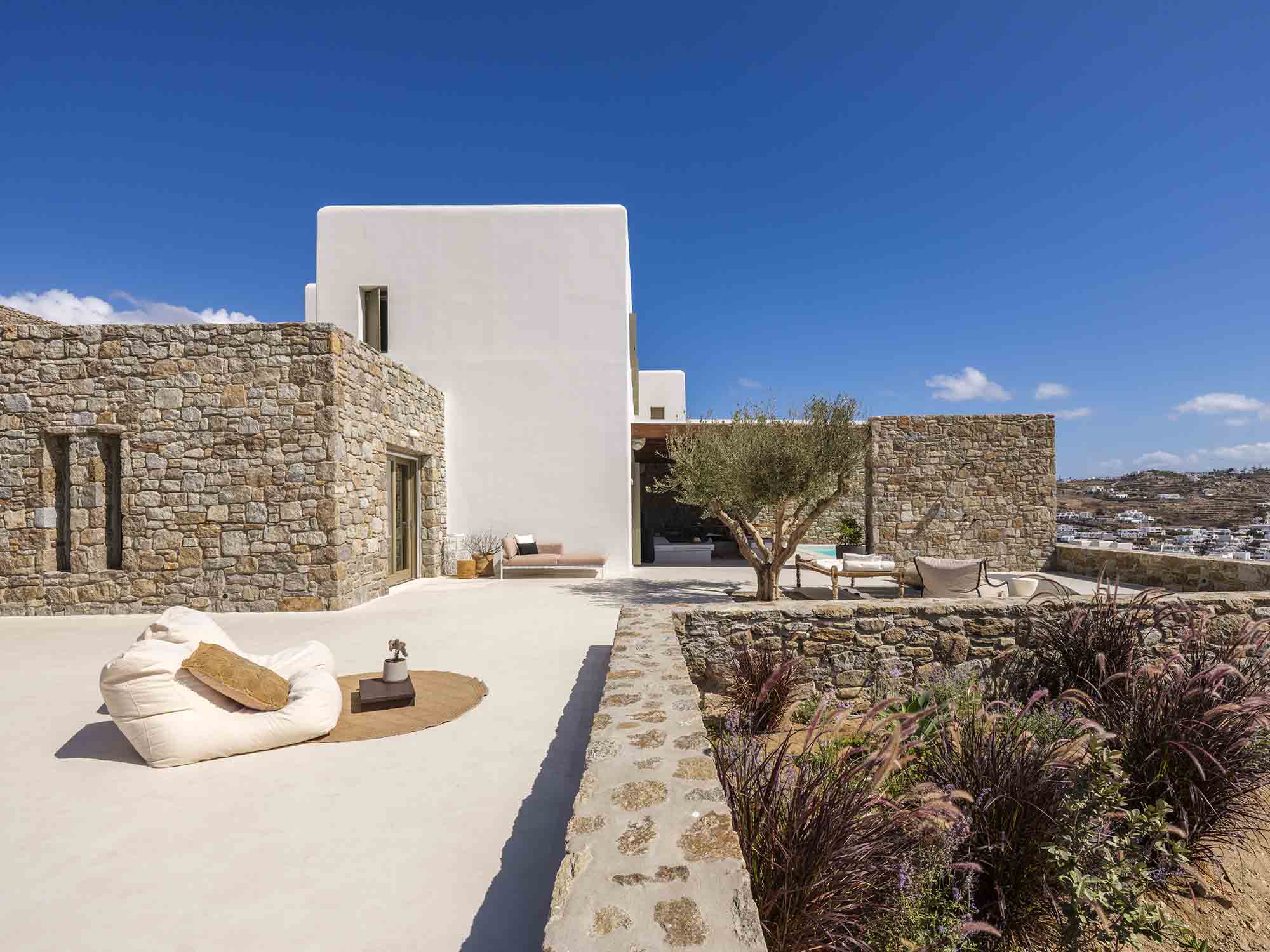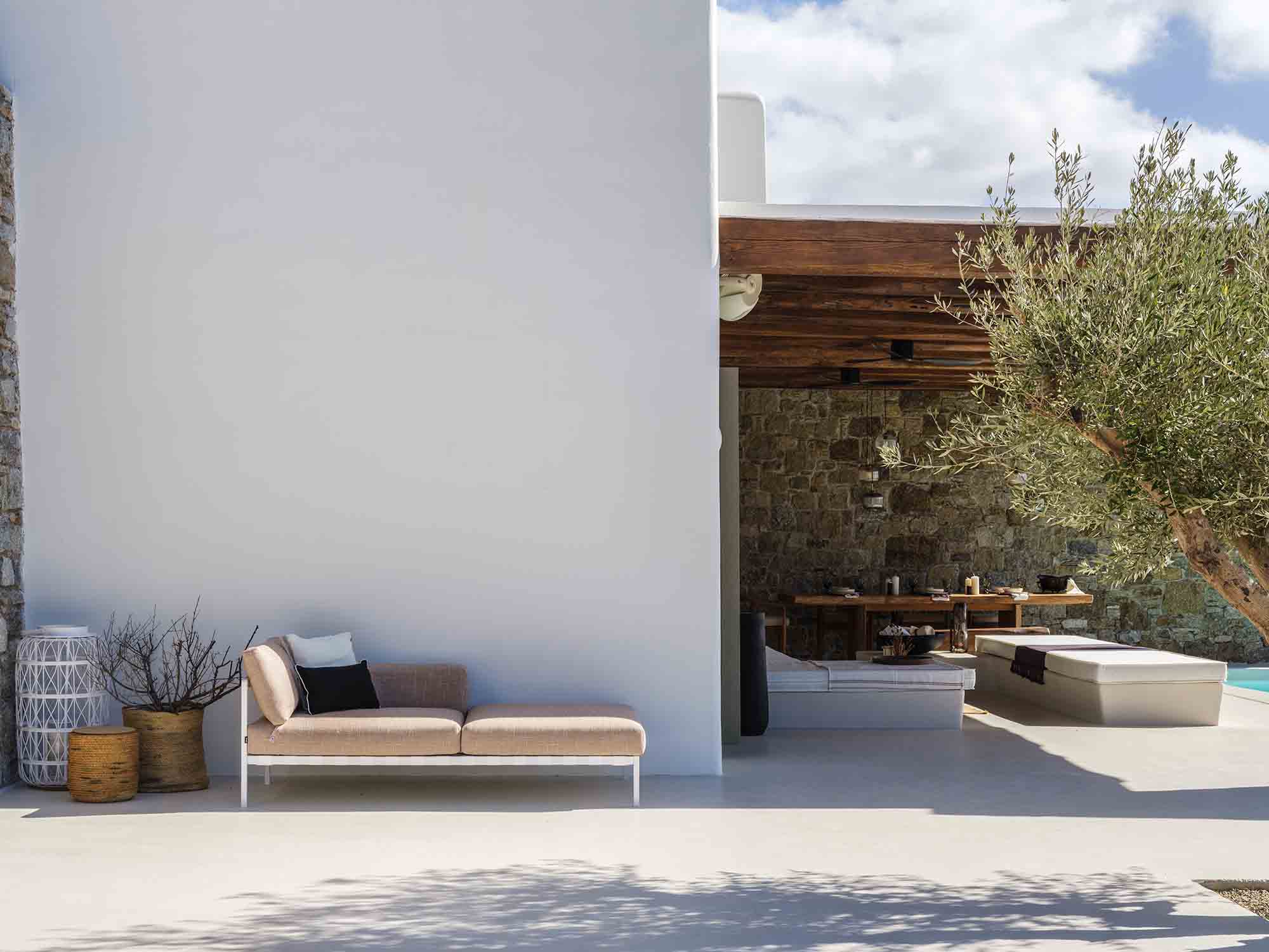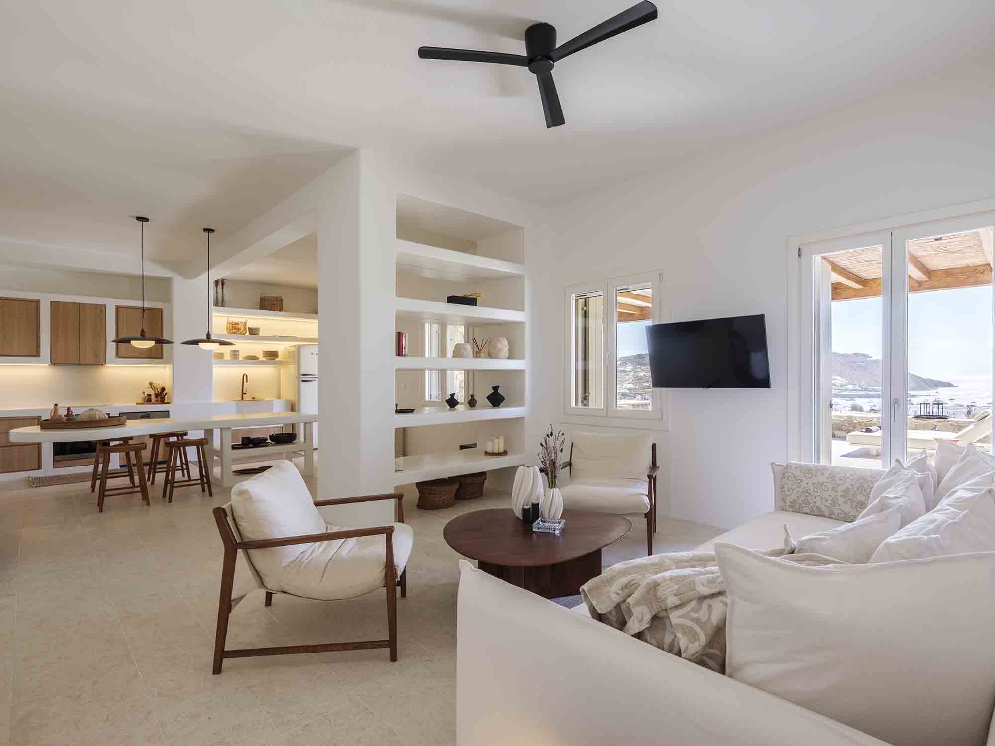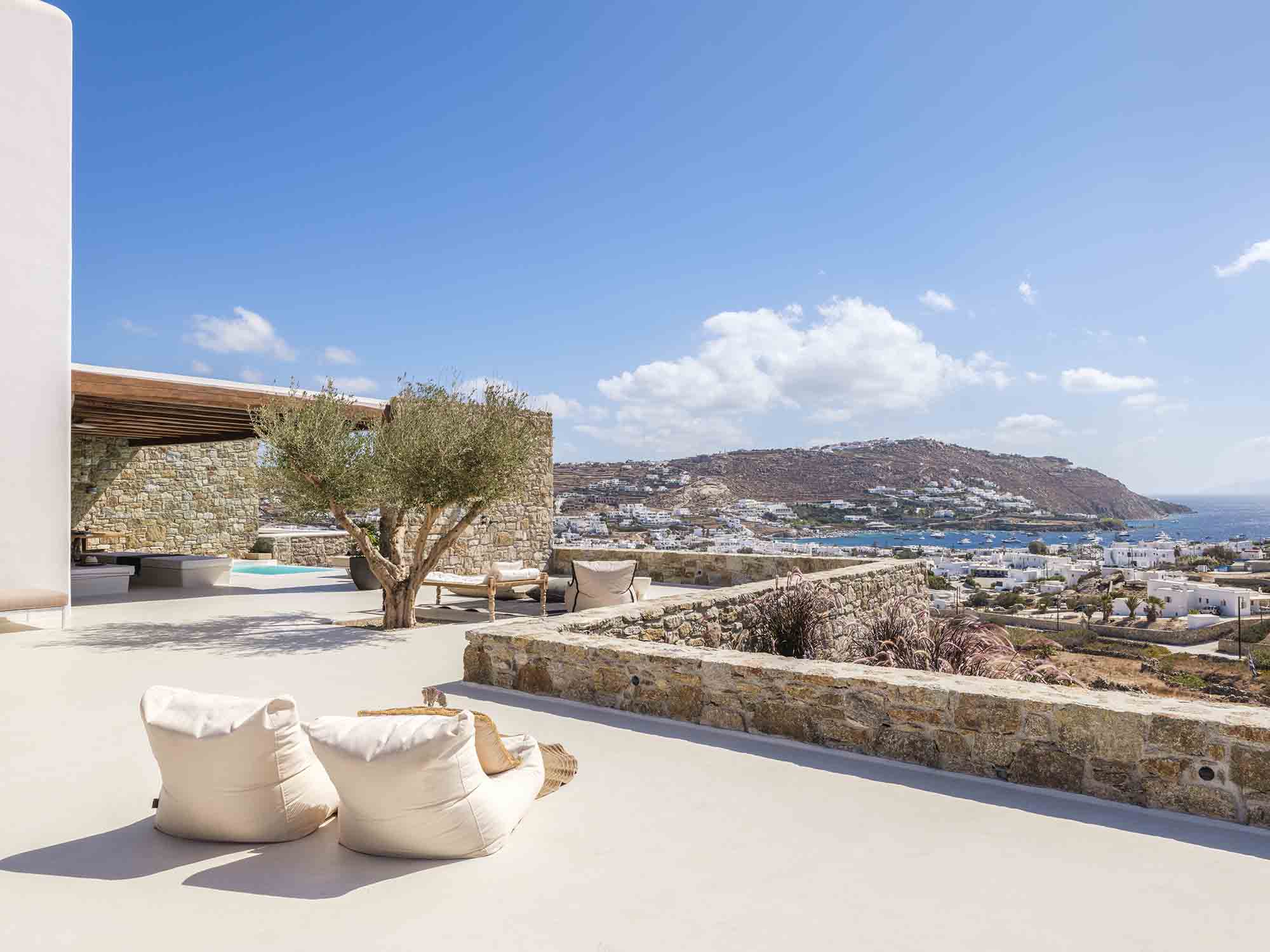 One of the villa’s greatest assets is its sheltered location, offering respite from the strong winds that are typical in Mykonos, allowing you to enjoy the outdoor areas in peace and comfort. This attention to detail extends throughout the villa, ensuring a luxurious experience at every turn.