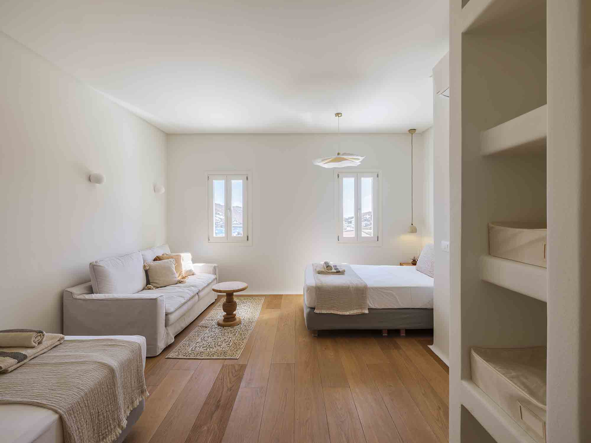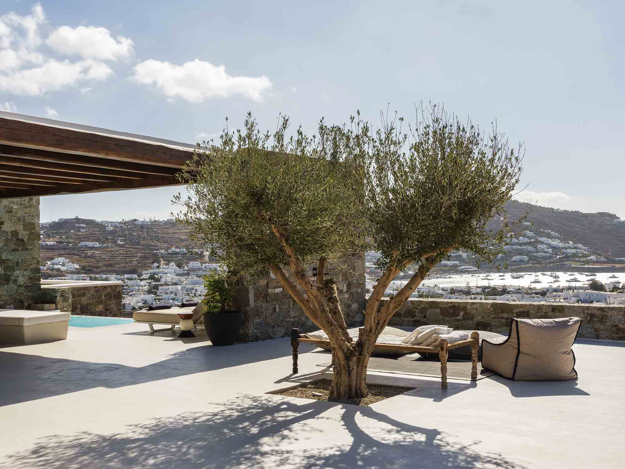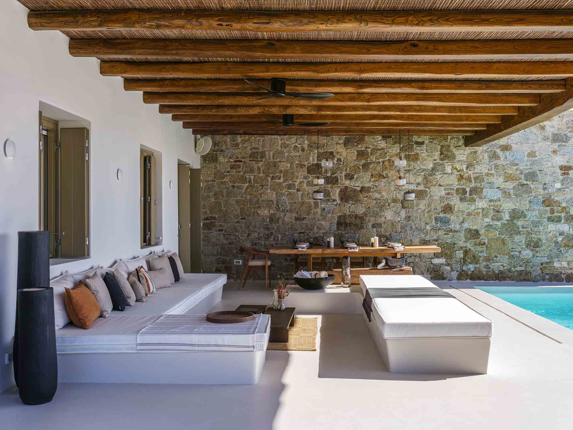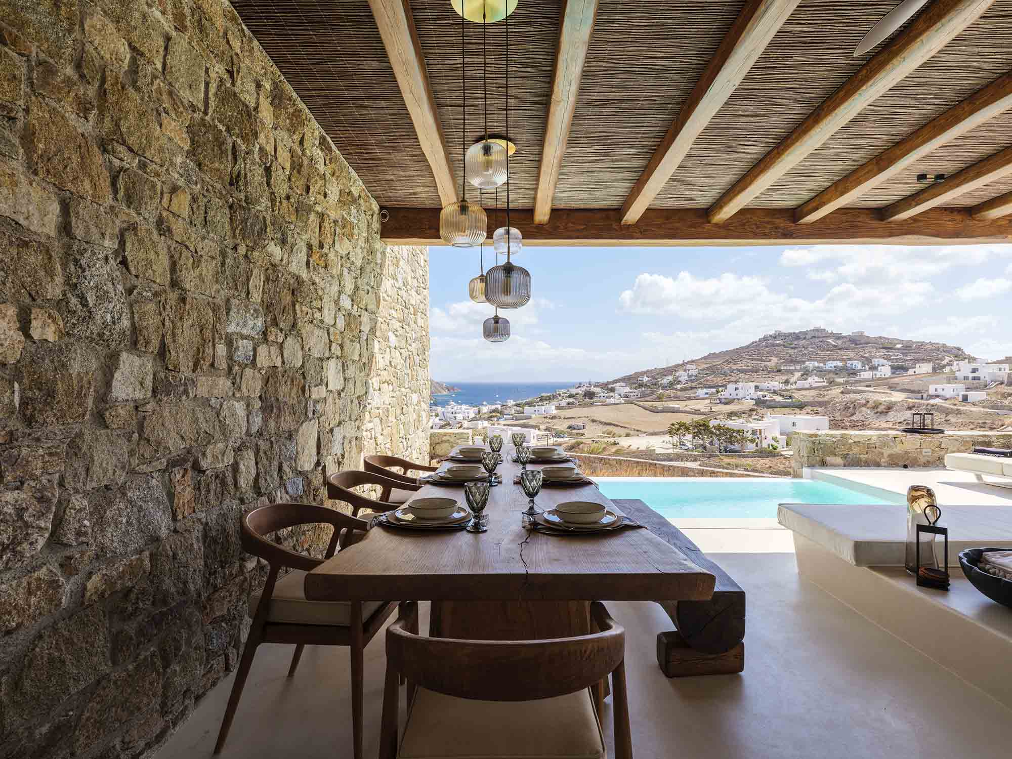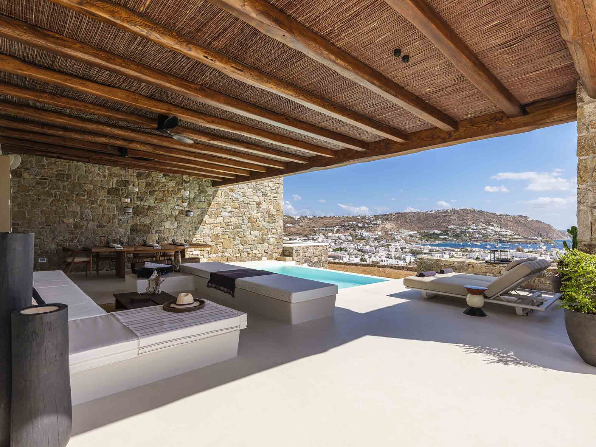 One of the villa’s greatest assets is its sheltered location, offering respite from the strong winds that are typical in Mykonos, allowing you to enjoy the outdoor areas in peace and comfort. This attention to detail extends throughout the villa, ensuring a luxurious experience at every turn.