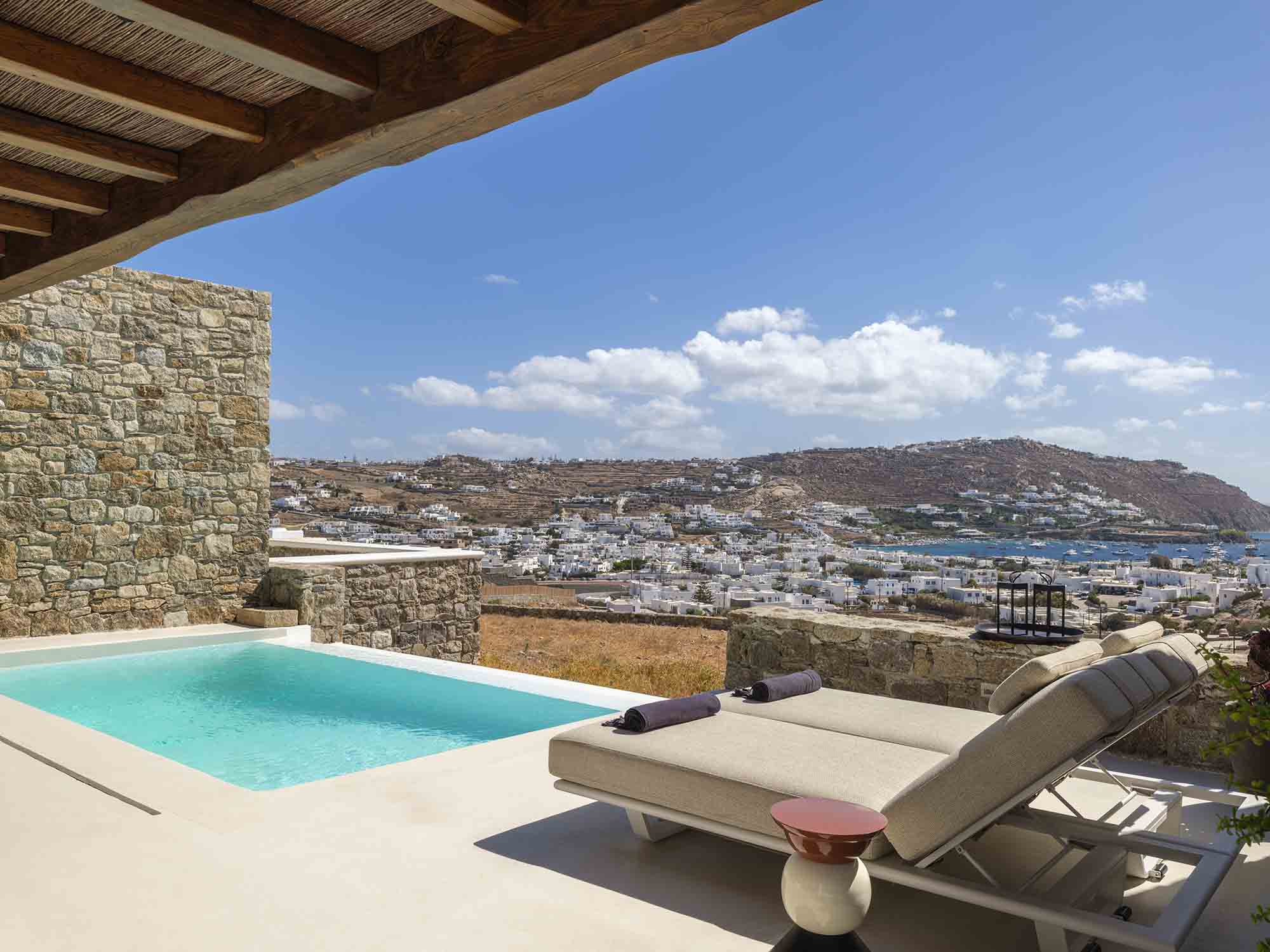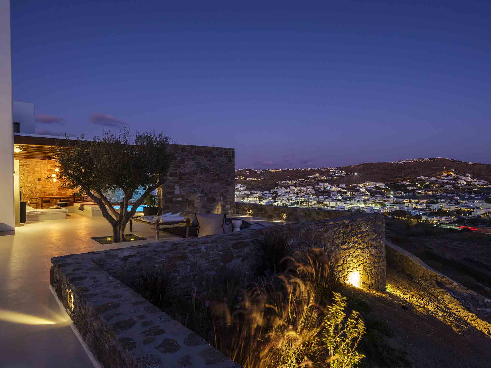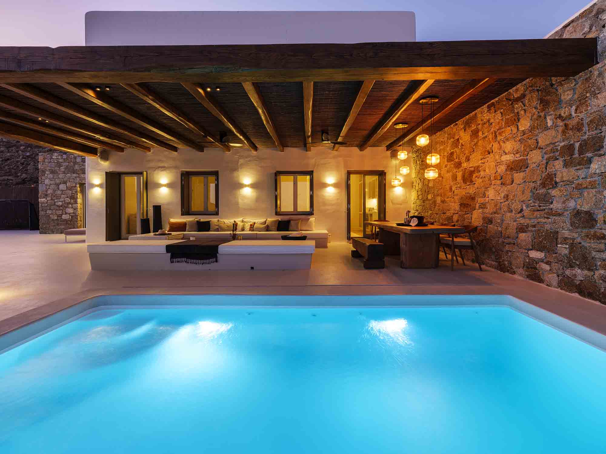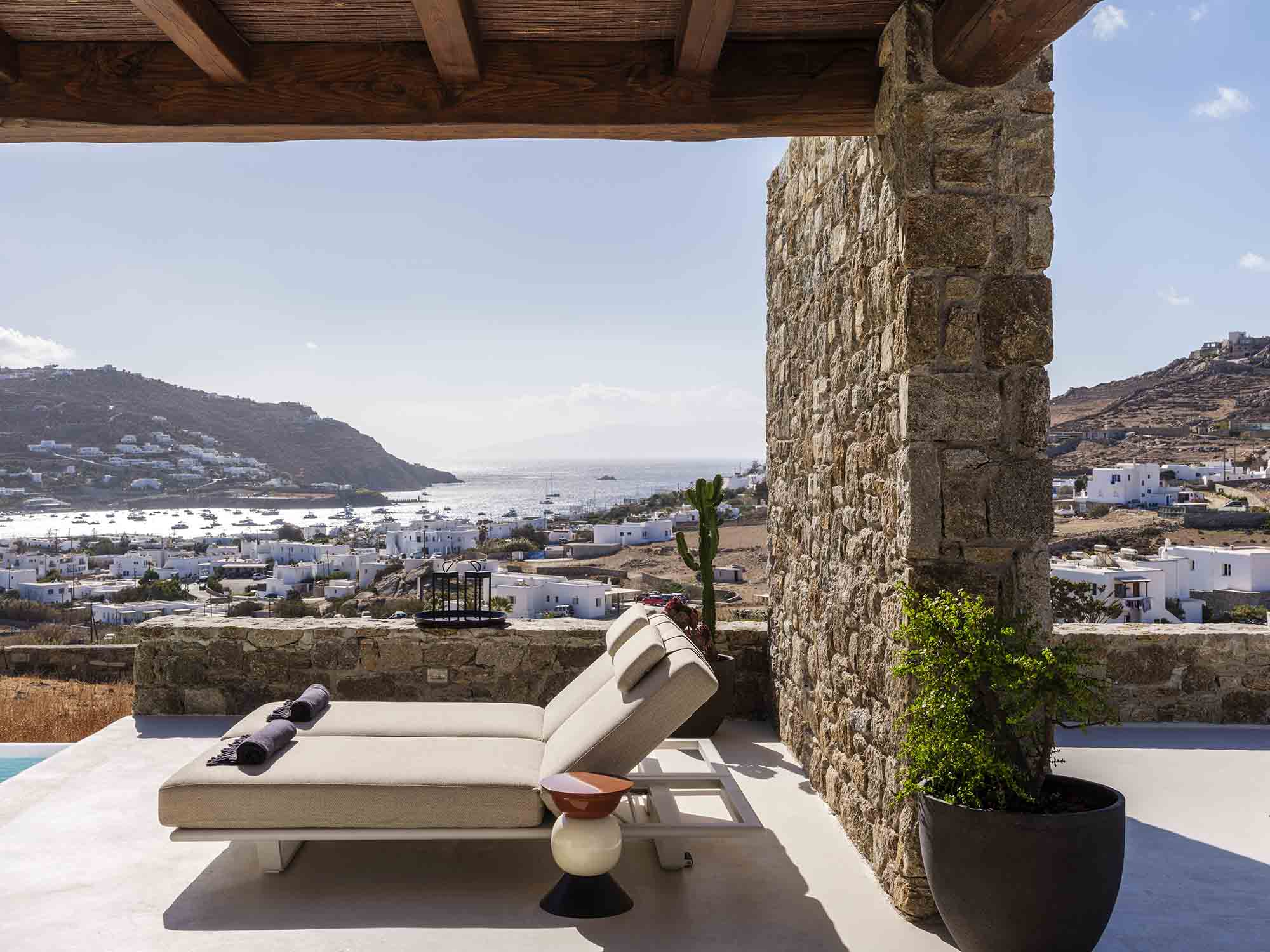 One of the villa’s greatest assets is its sheltered location, offering respite from the strong winds that are typical in Mykonos, allowing you to enjoy the outdoor areas in peace and comfort. This attention to detail extends throughout the villa, ensuring a luxurious experience at every turn.