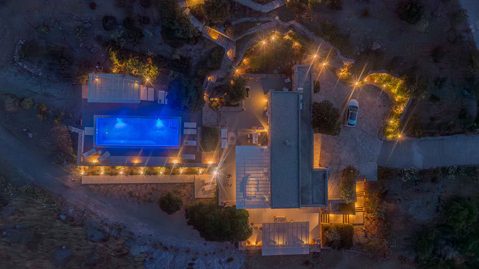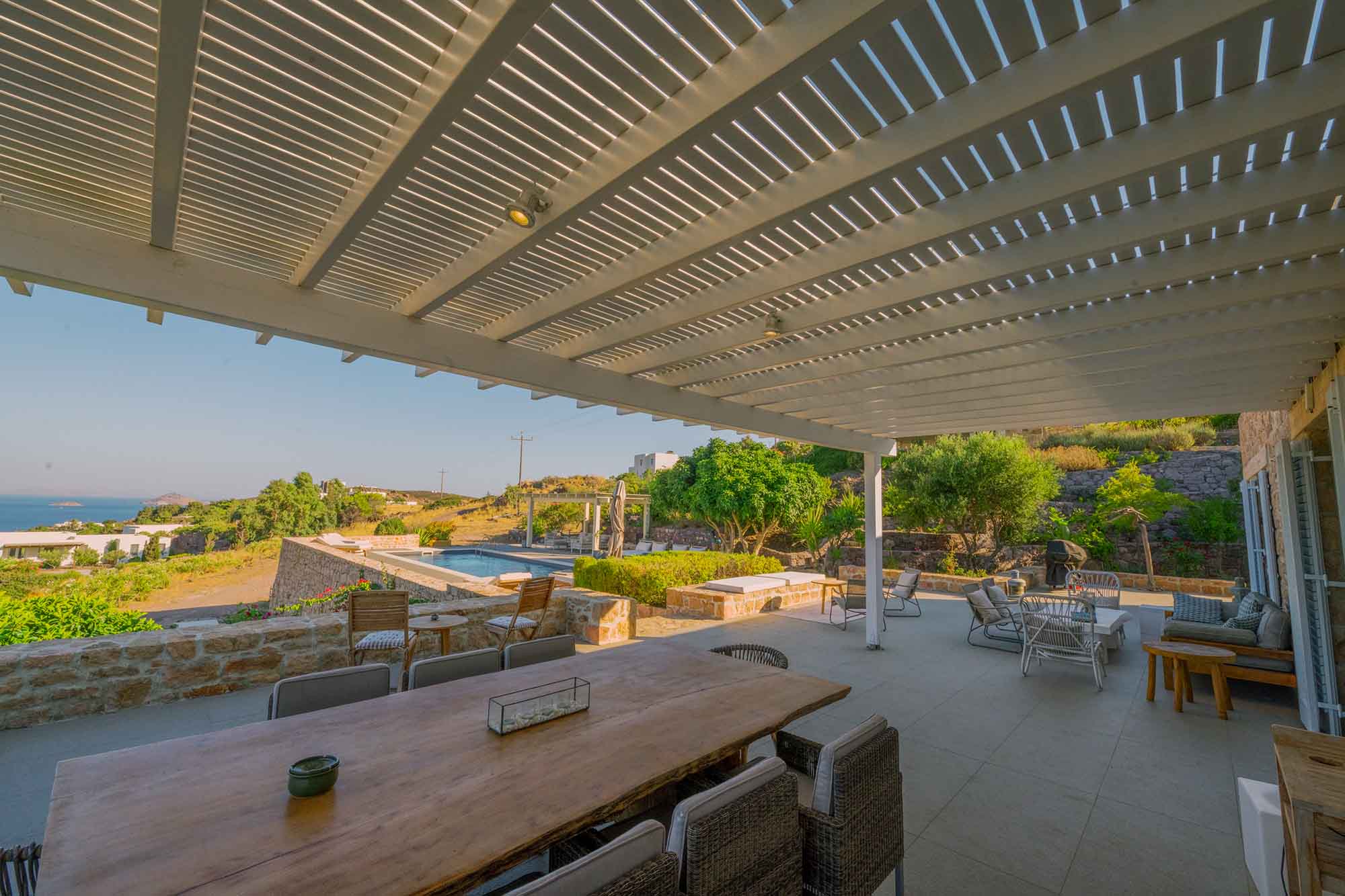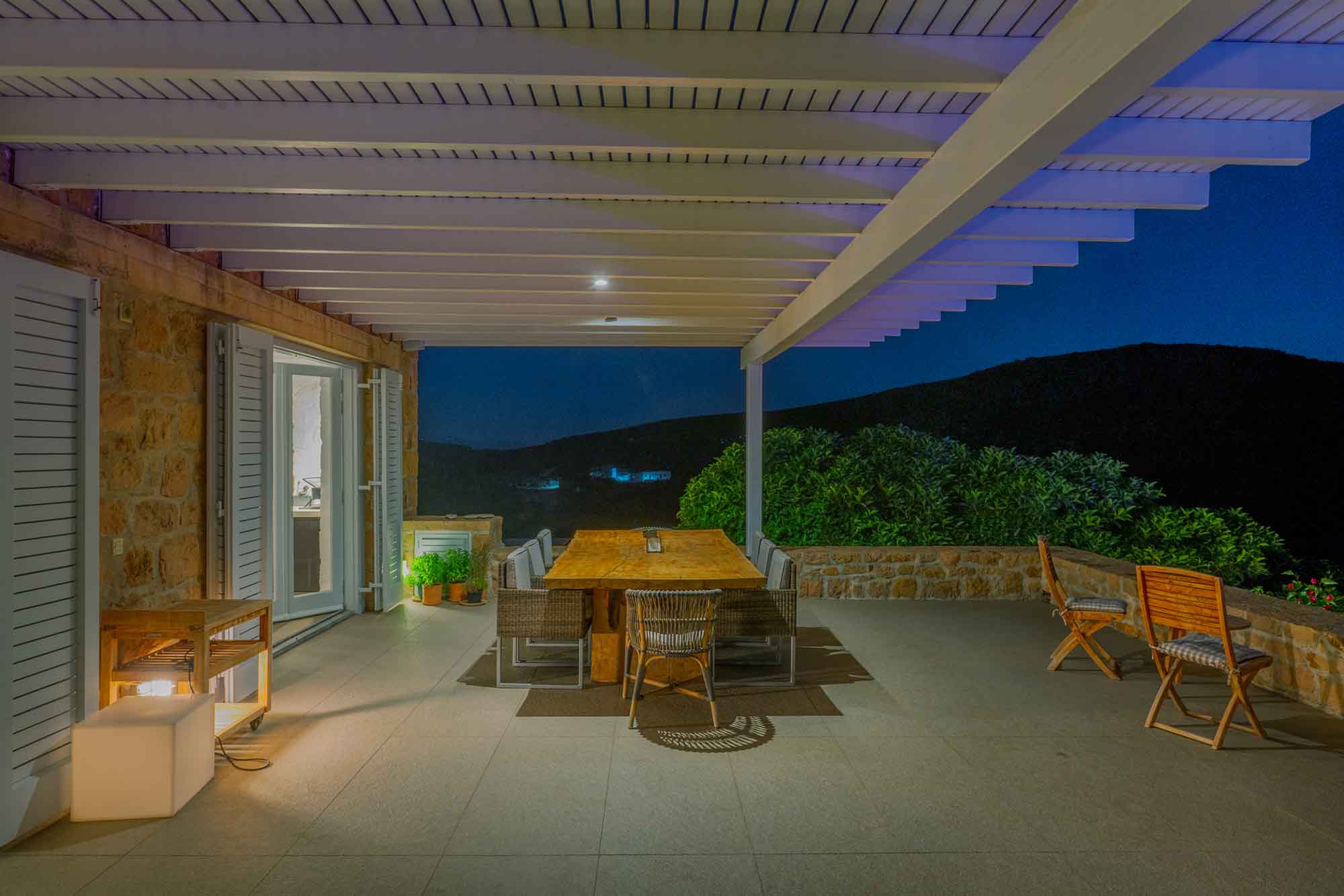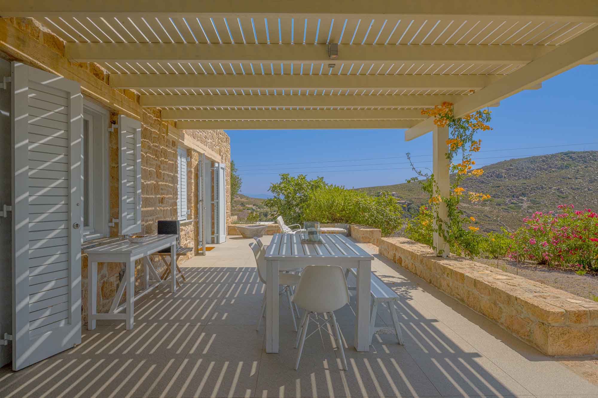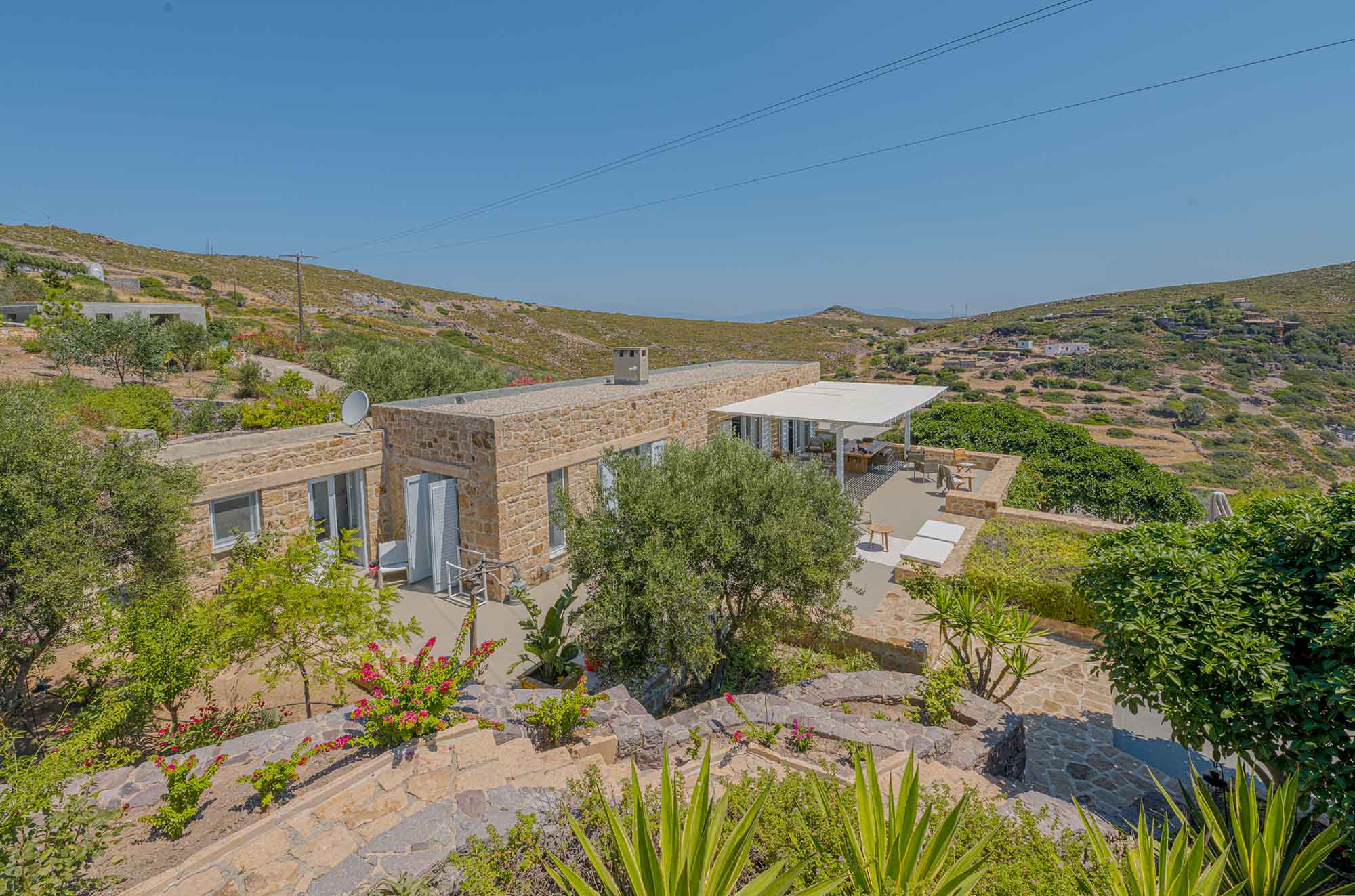 The Villa is built on a private land of 9000 square meters. It is tranquil and yet not isolated. The view to the sea and Kampos beach, is sensational and the orientation of the house is ideal, as far as the wind is concerned. The northern winds of August hit the back side of the house, leaving the verandas that have a magnificent sea view quite protected.