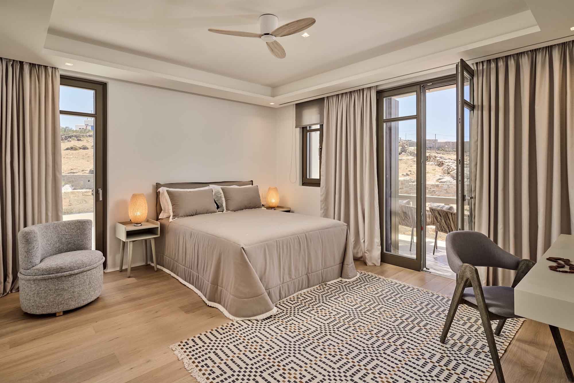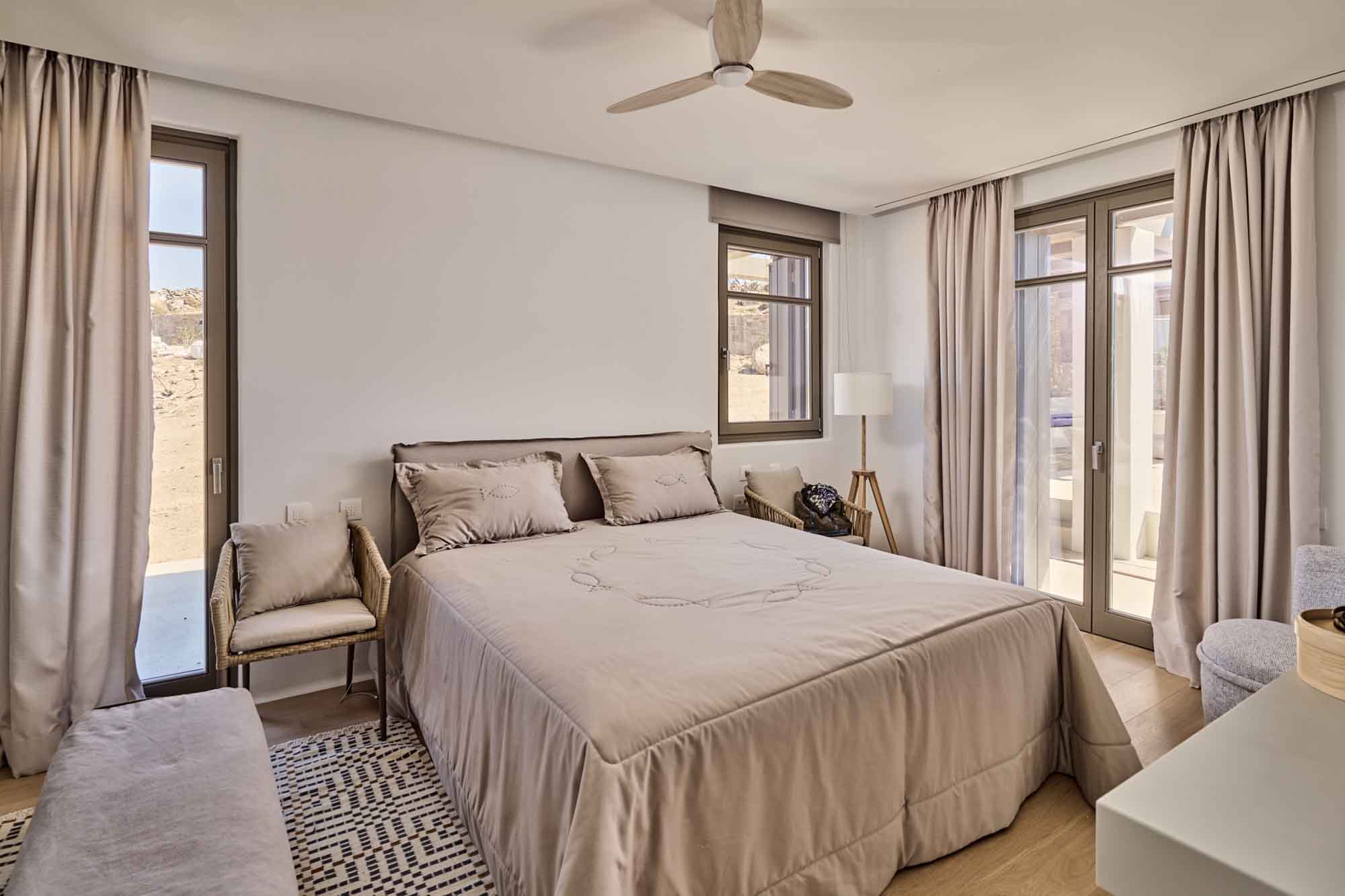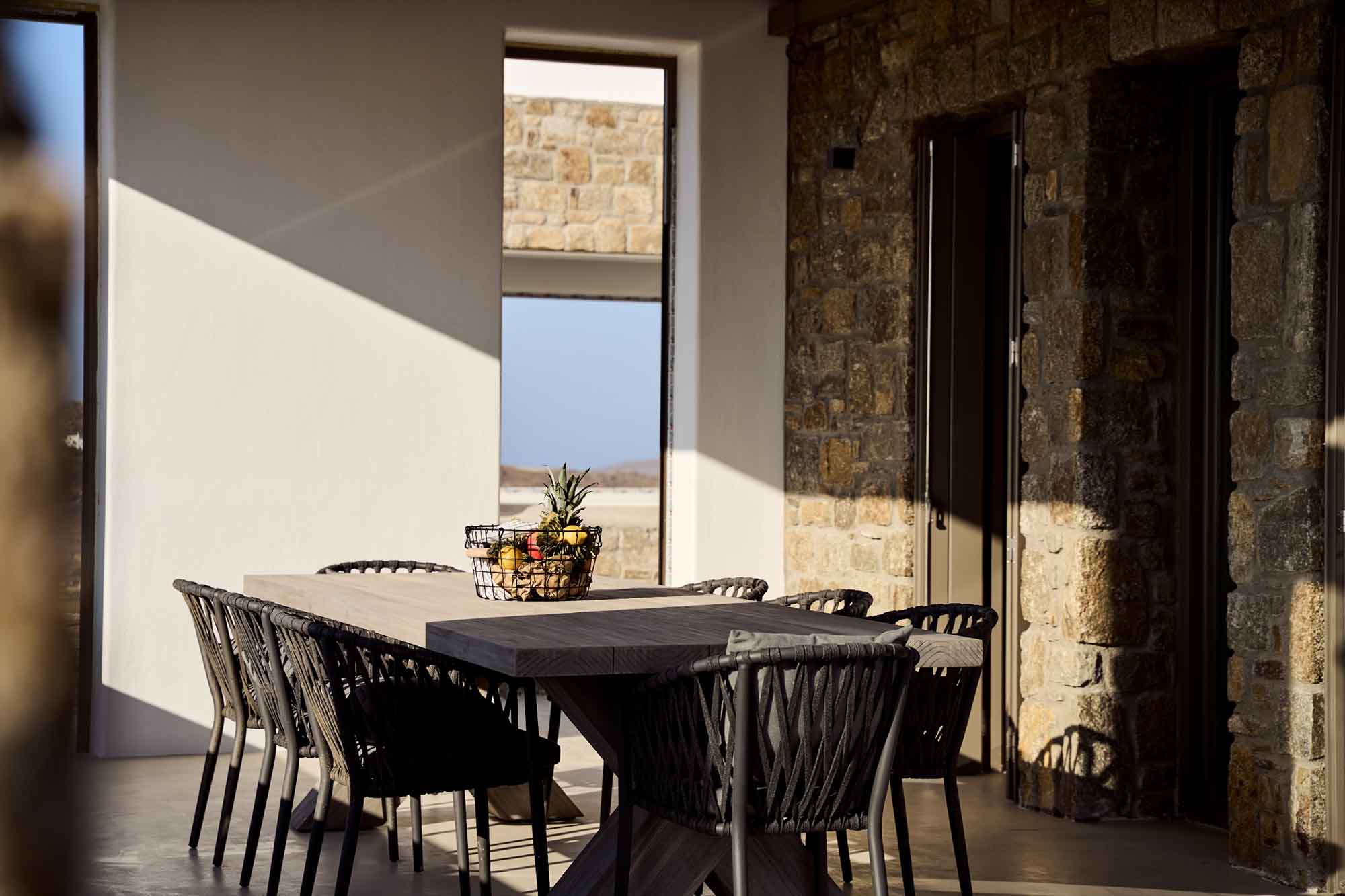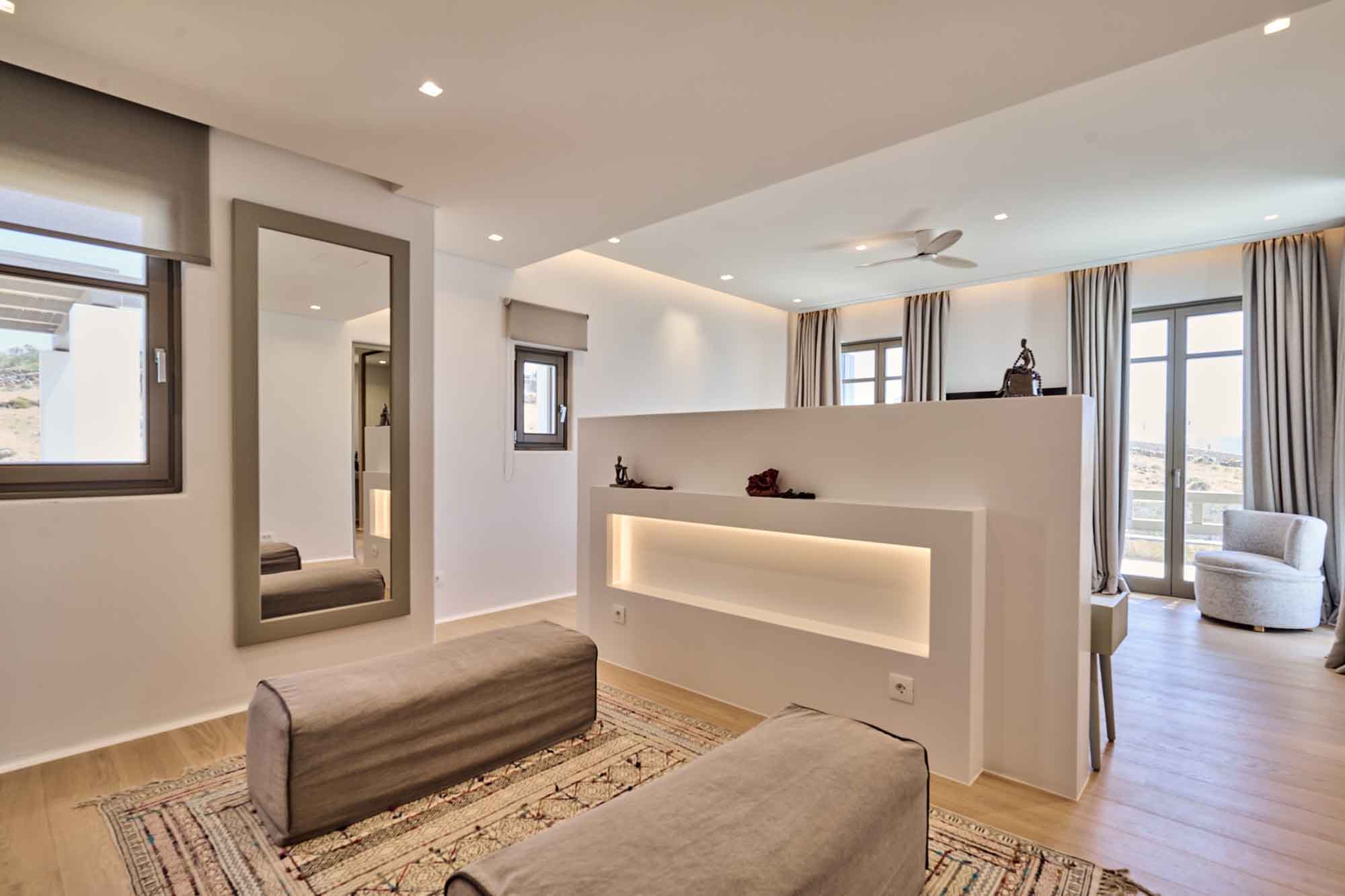 Inside, Villa Kyrrhus captivates with its airy, light-filled interiors, where contemporary design meets Mykonian tradition. Thoughtfully integrated natural stone elements enhance the villa’s cool, insulated environment, creating a harmonious balance between luxury and nature.