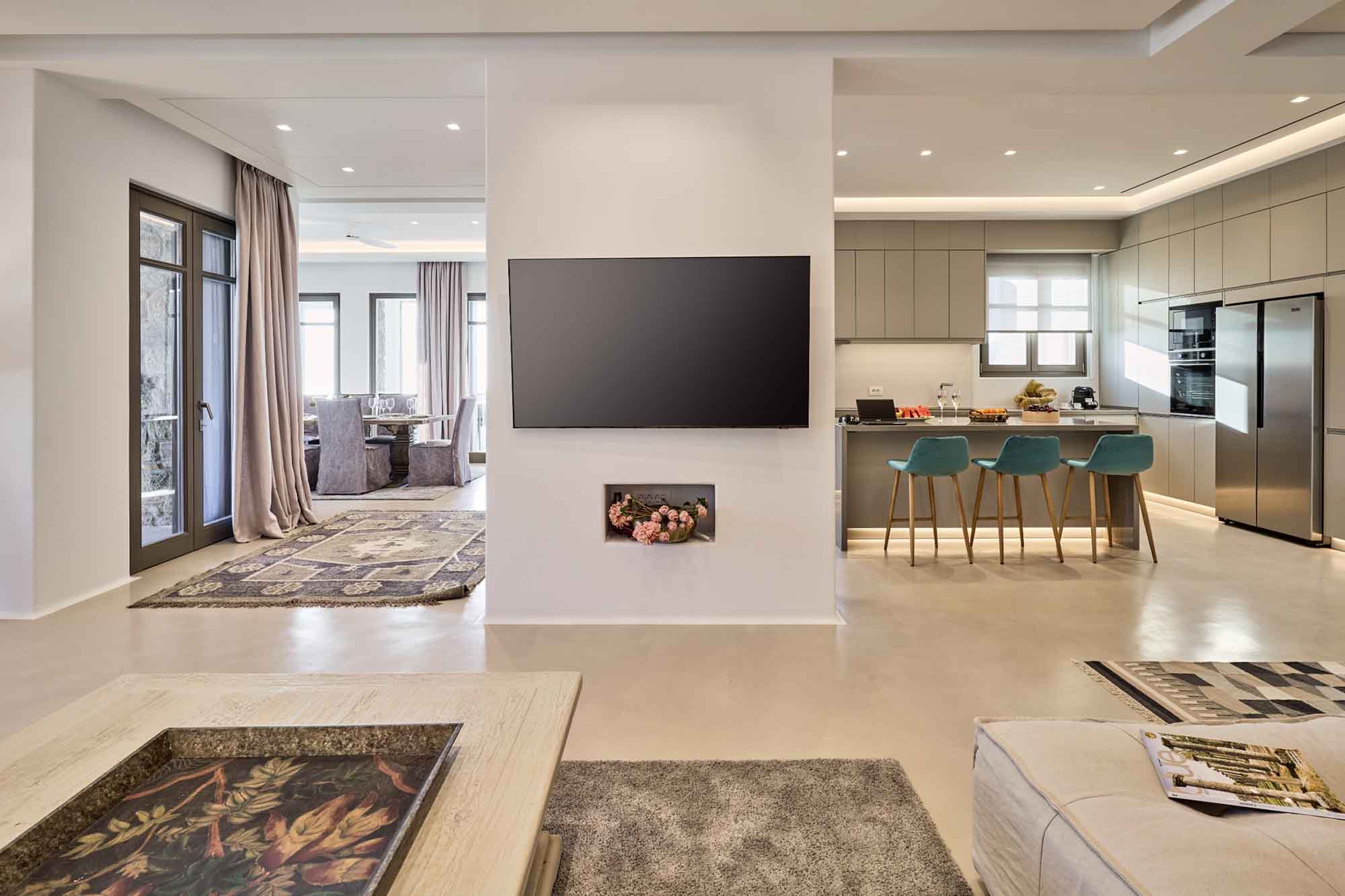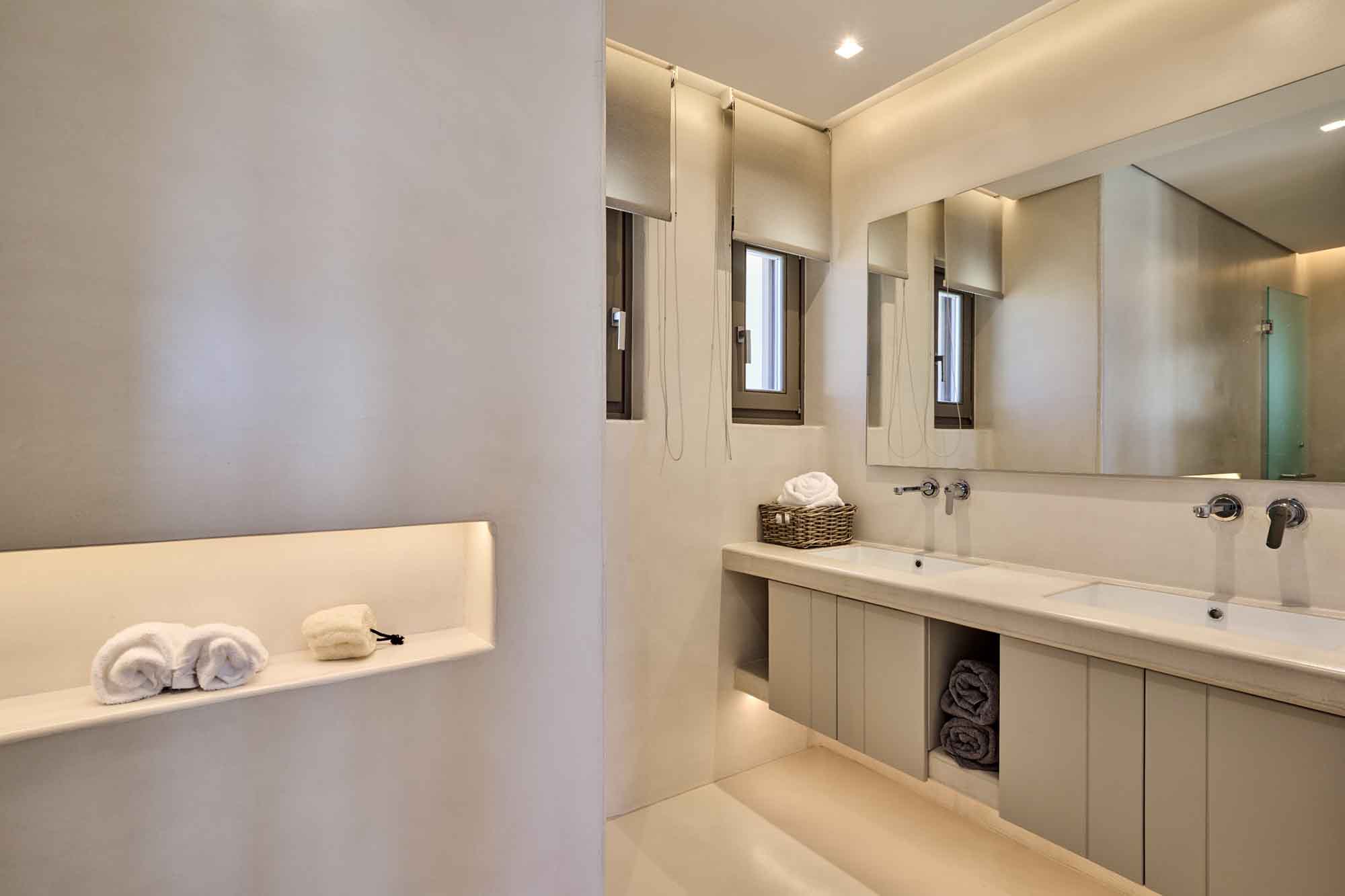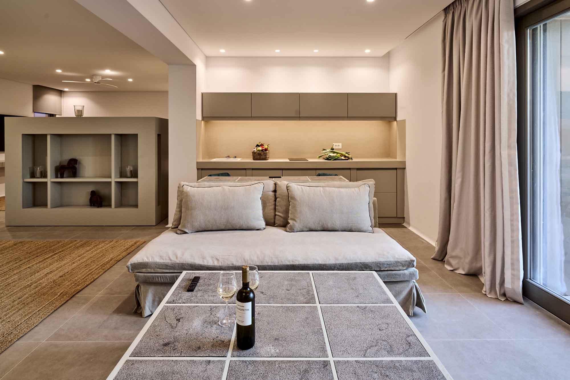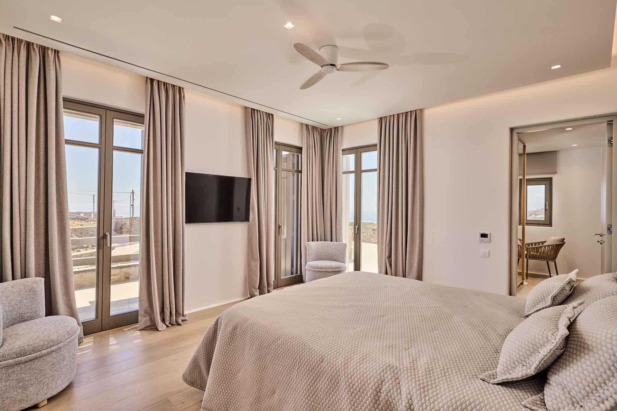 Inside, Villa Kyrrhus captivates with its airy, light-filled interiors, where contemporary design meets Mykonian tradition. Thoughtfully integrated natural stone elements enhance the villa’s cool, insulated environment, creating a harmonious balance between luxury and nature.