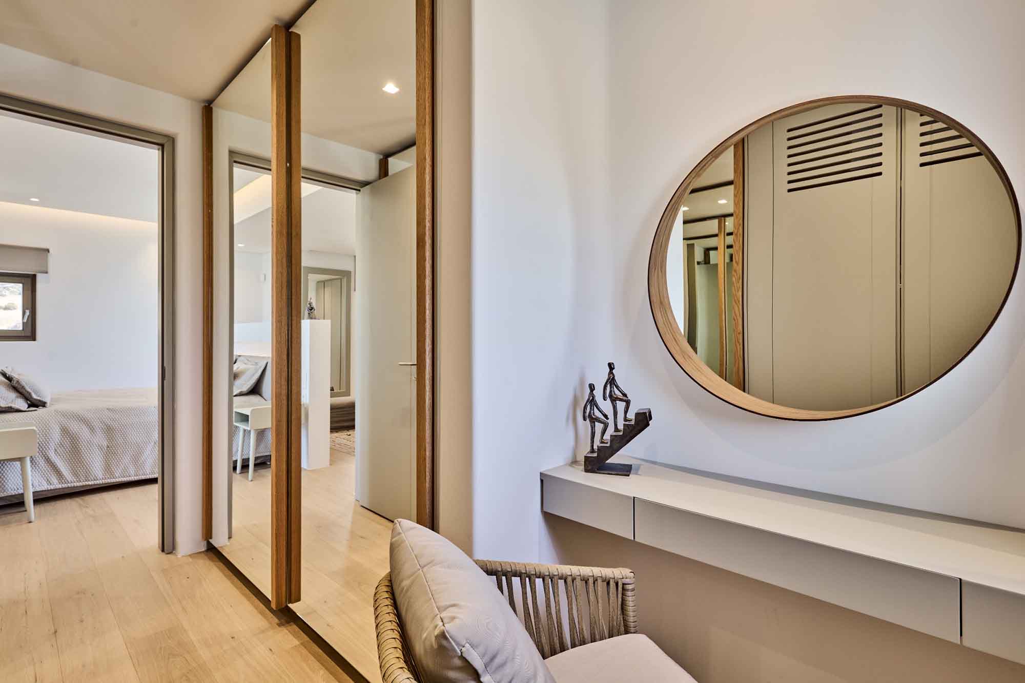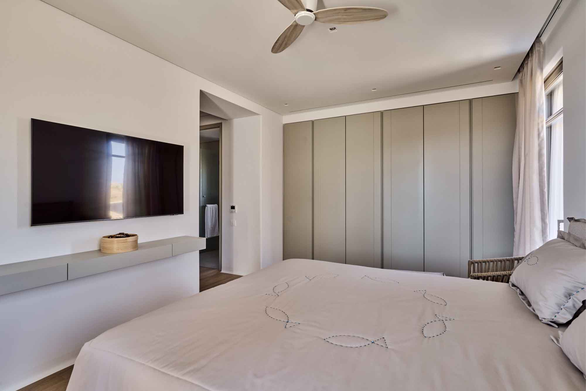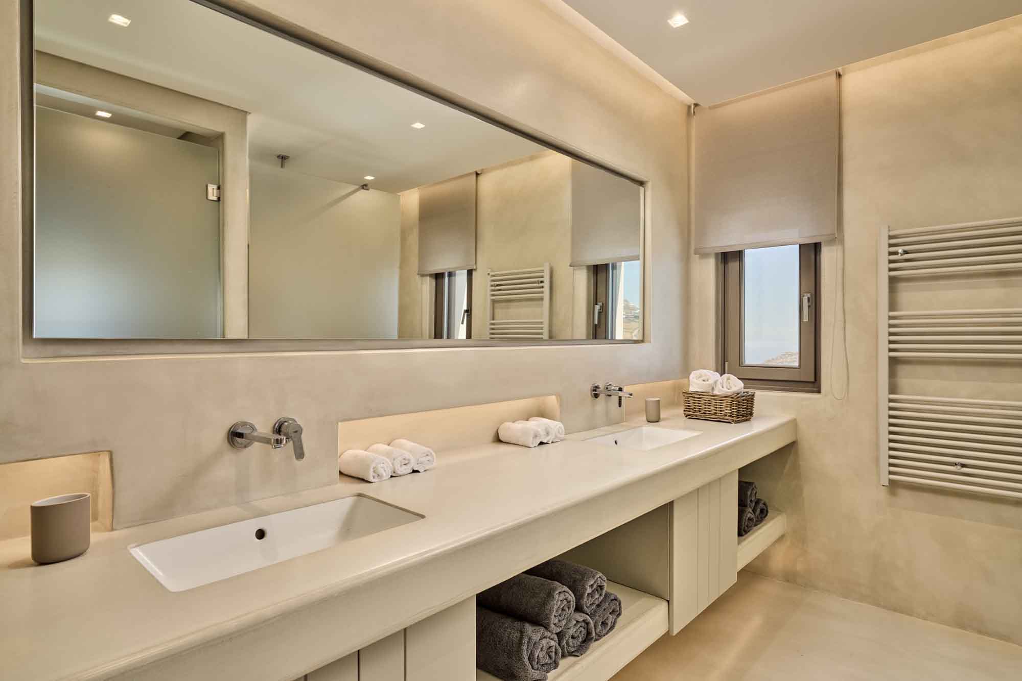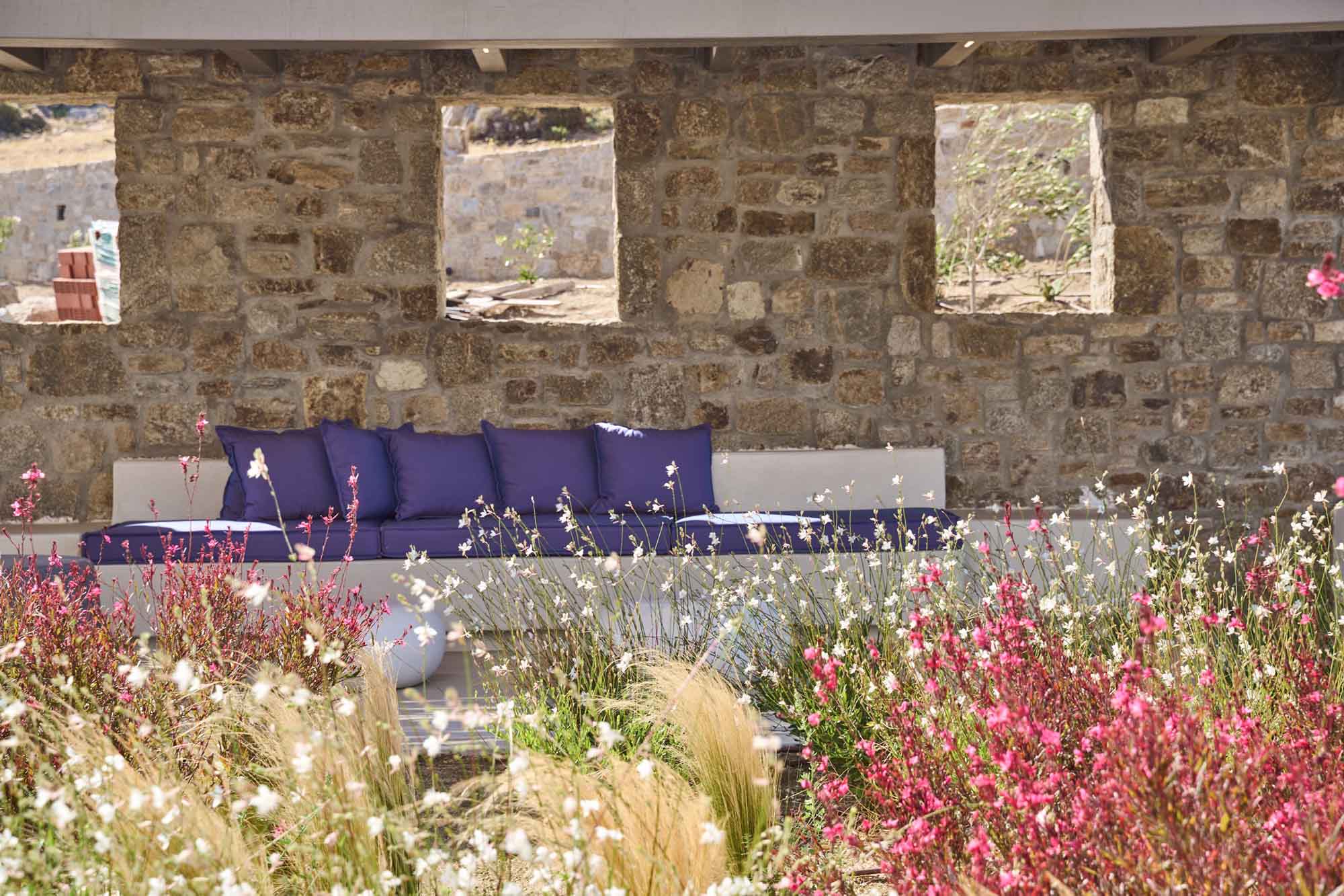 Inside, Villa Kyrrhus captivates with its airy, light-filled interiors, where contemporary design meets Mykonian tradition. Thoughtfully integrated natural stone elements enhance the villa’s cool, insulated environment, creating a harmonious balance between luxury and nature.