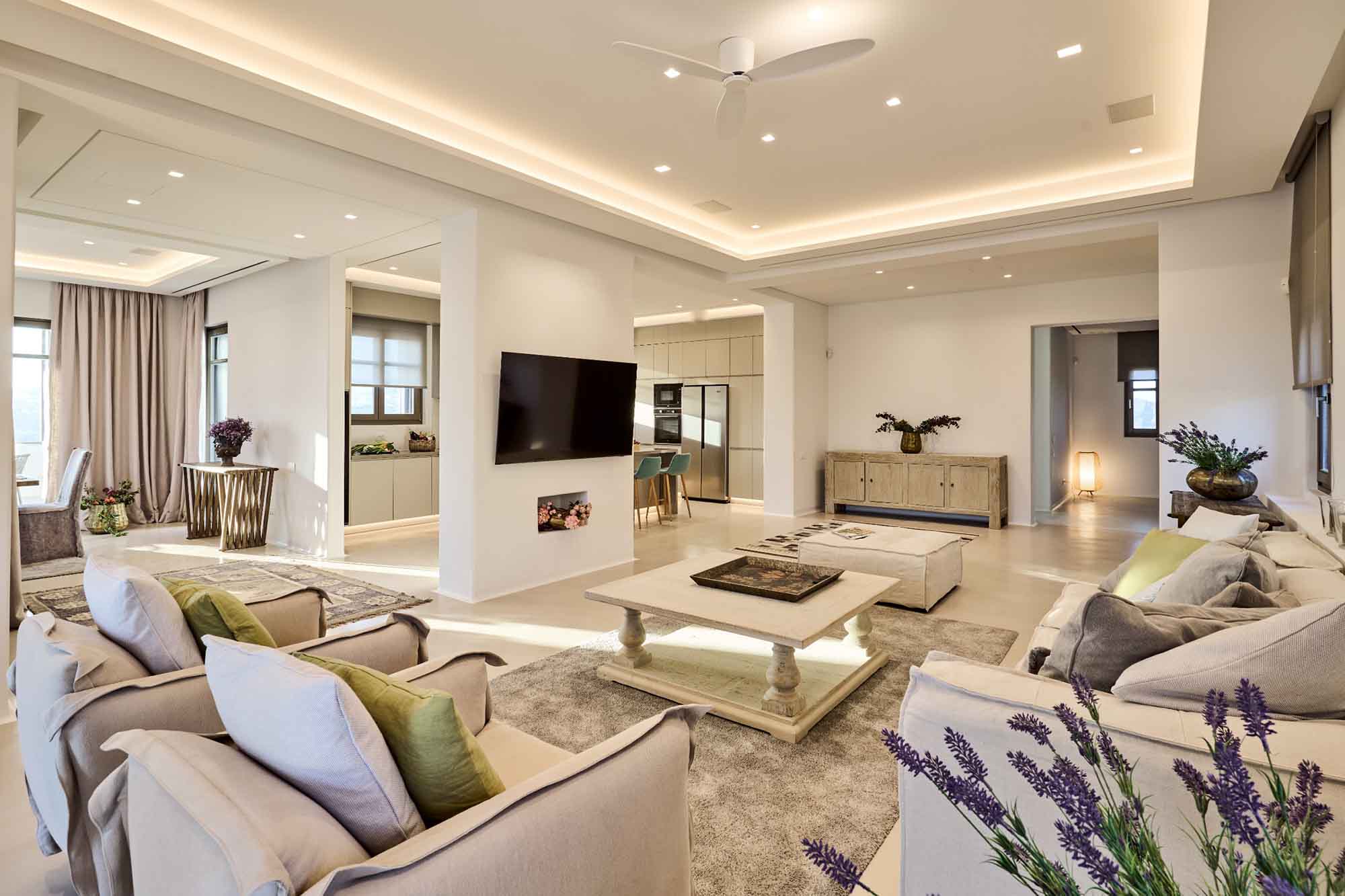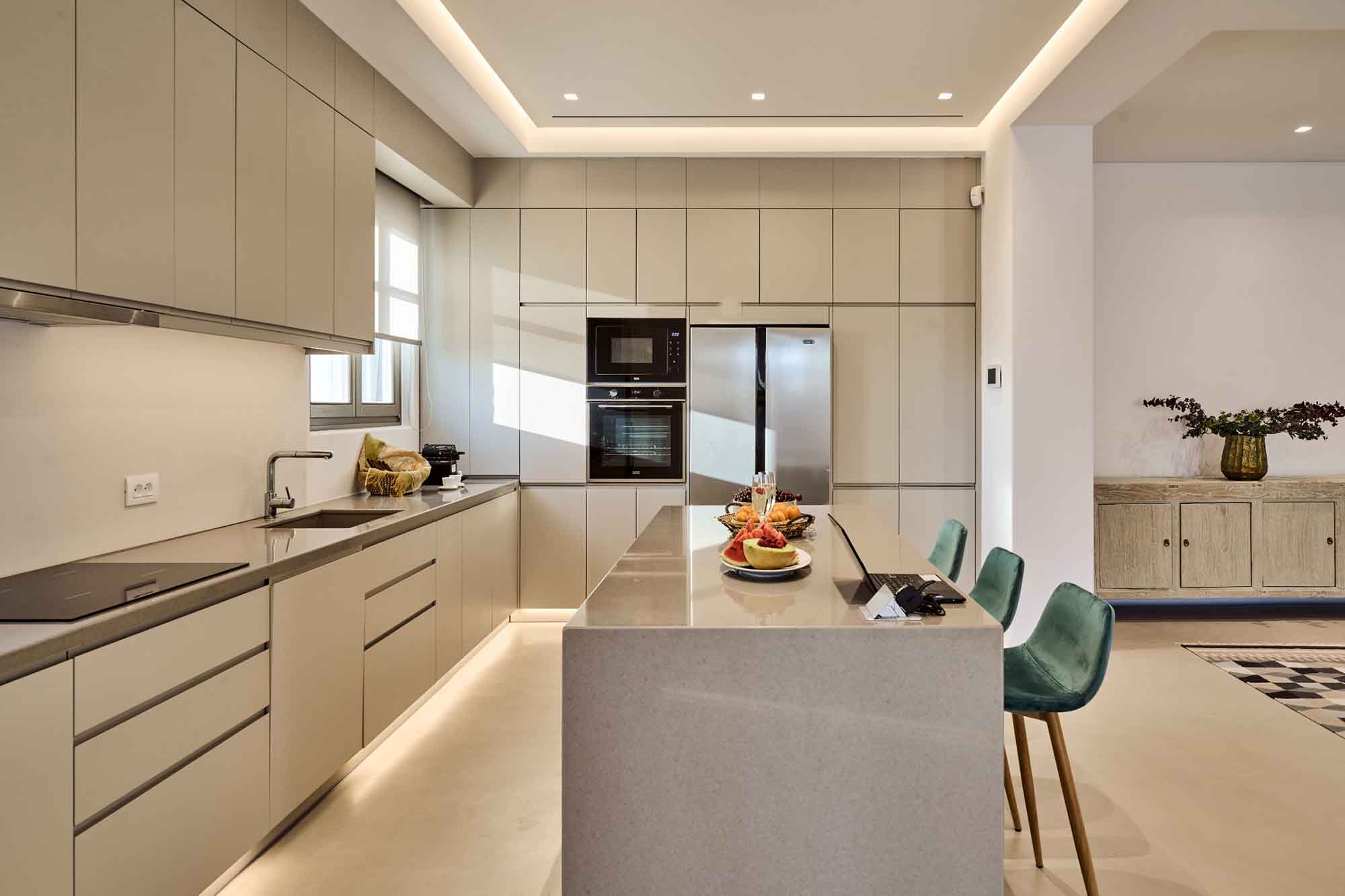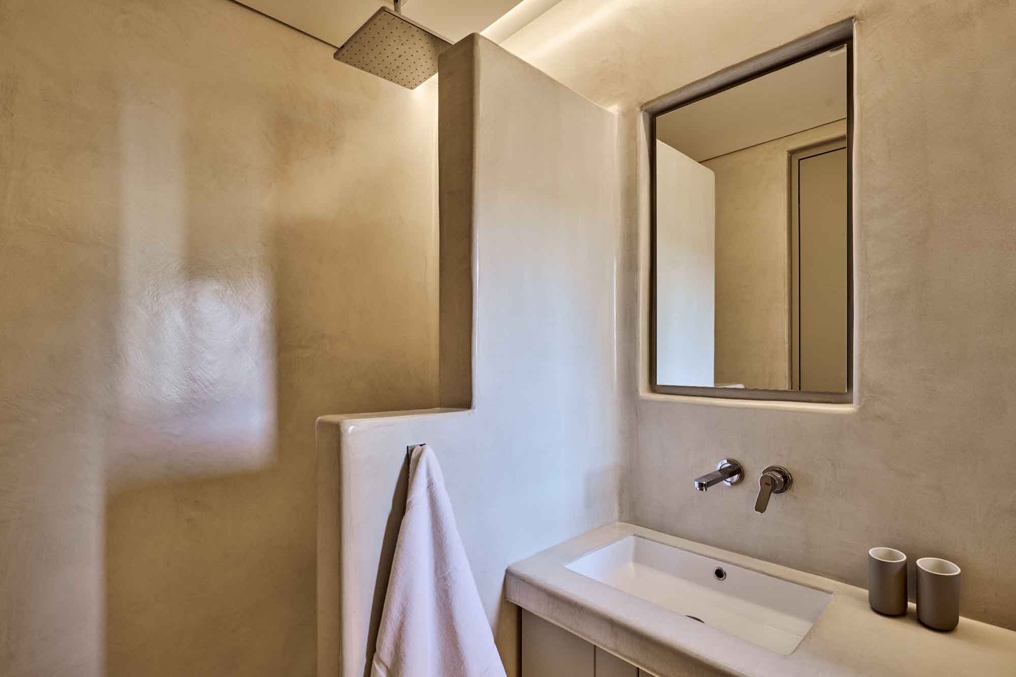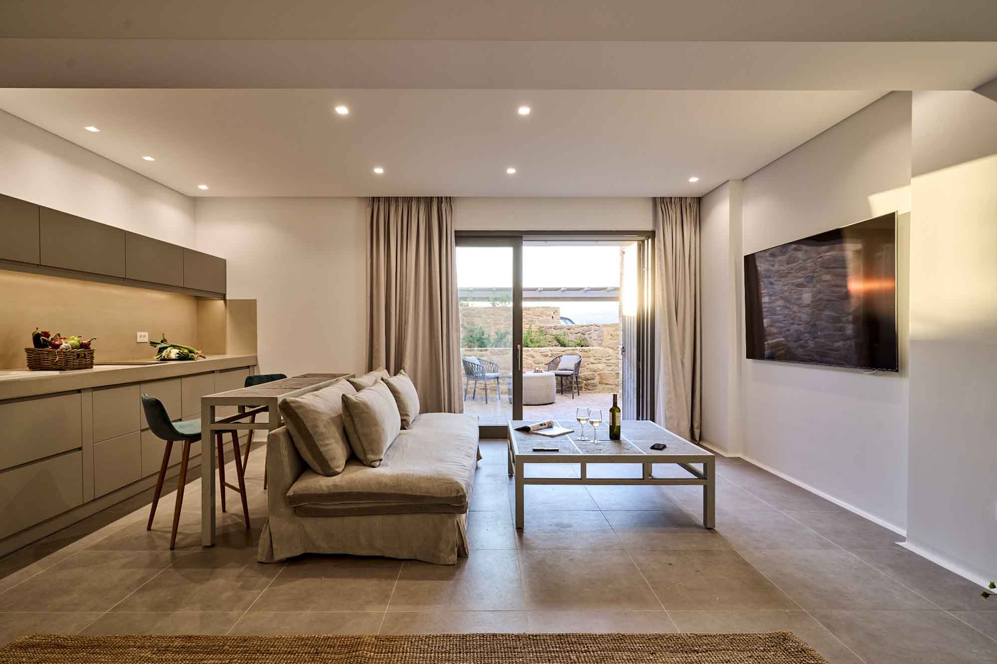 Inside, Villa Kyrrhus captivates with its airy, light-filled interiors, where contemporary design meets Mykonian tradition. Thoughtfully integrated natural stone elements enhance the villa’s cool, insulated environment, creating a harmonious balance between luxury and nature.
