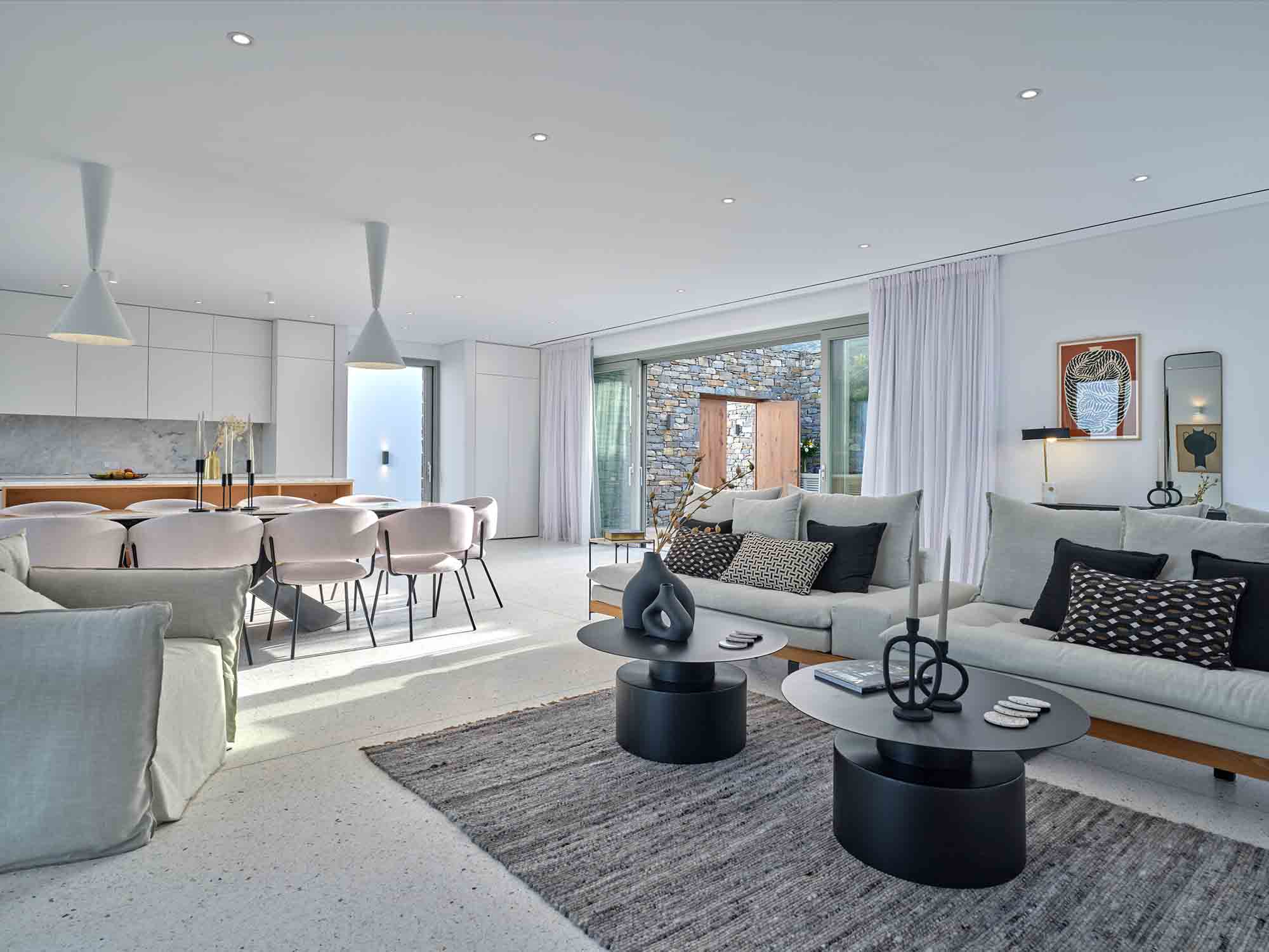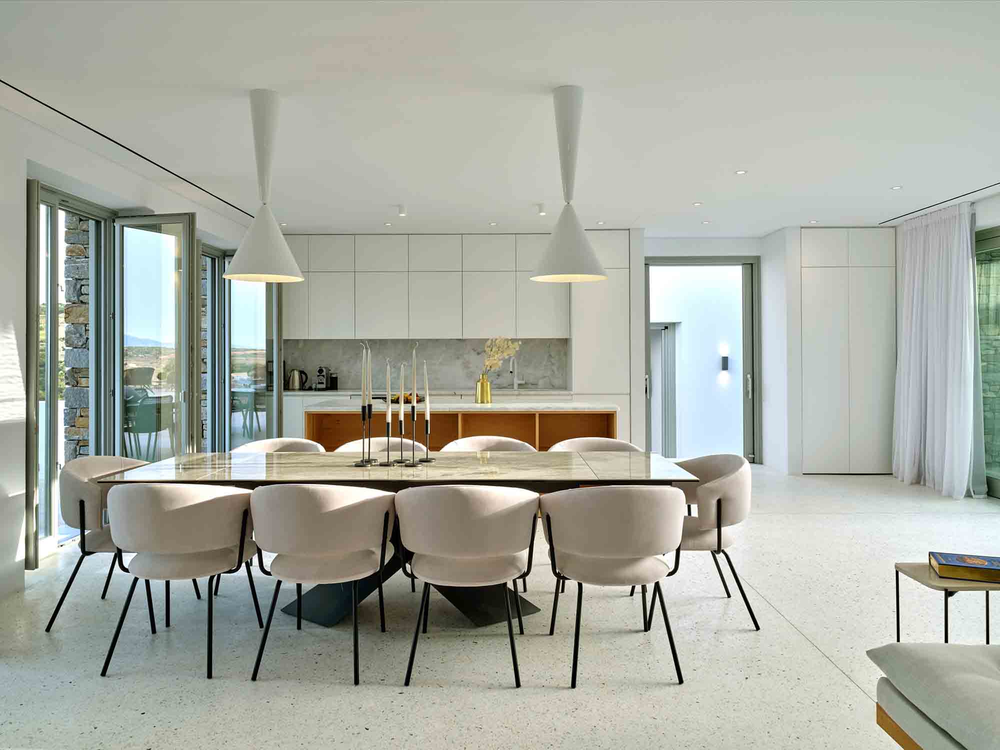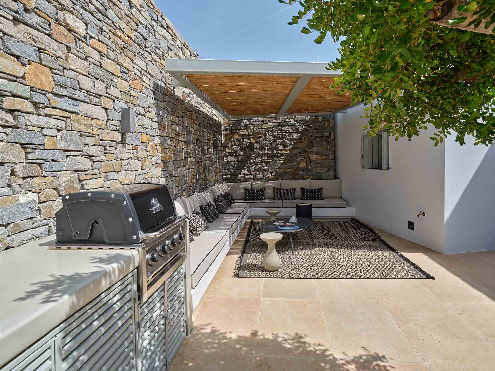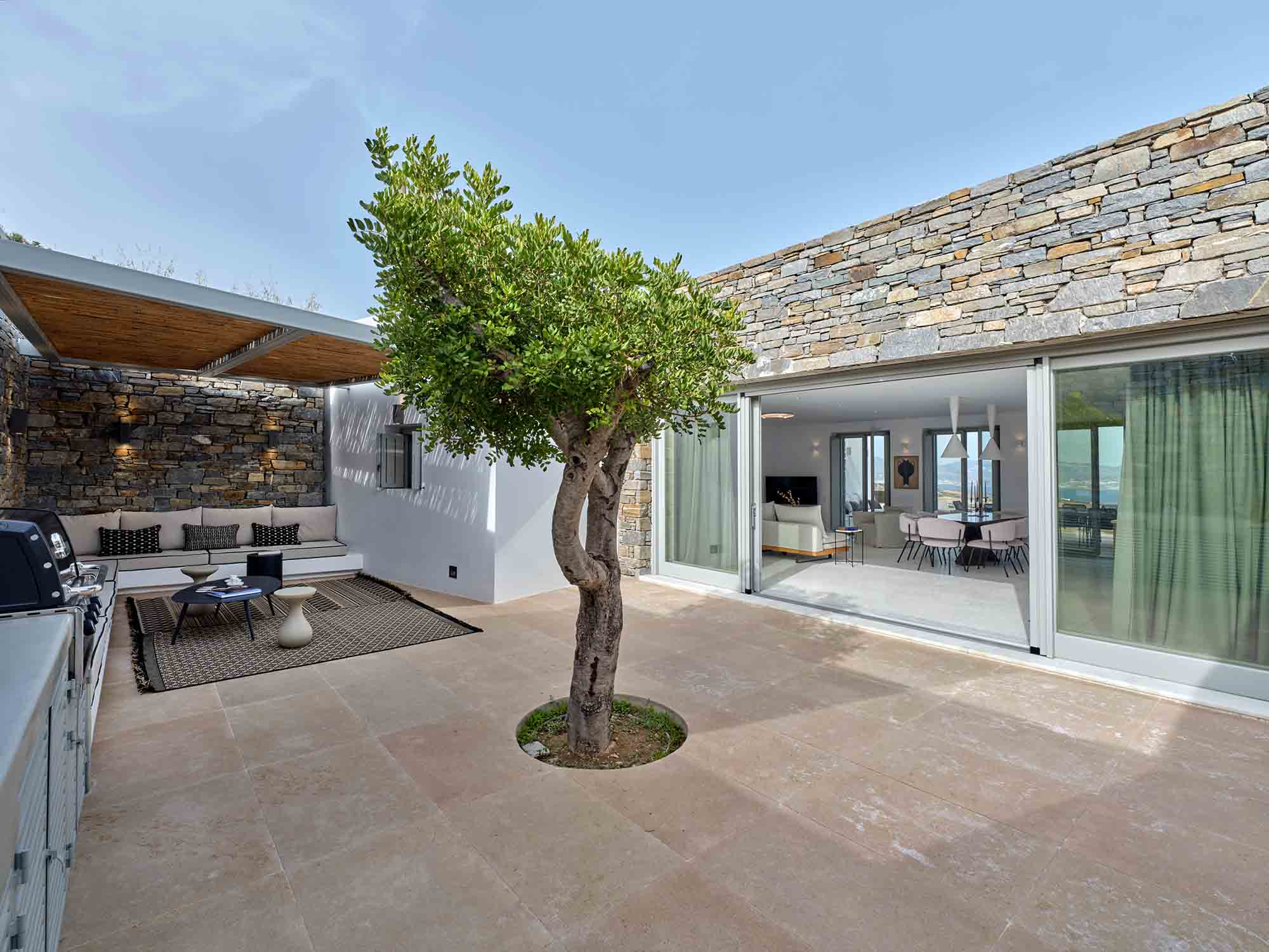 Upon arrival, guests are welcomed by striking stone walls and bespoke glazed doors that open into a bright, spacious living area. The open-plan design includes a sleek, modern kitchen with marble surfaces and high-end appliances, seamlessly connecting to refined indoor and outdoor dining areas. Whether it’s a relaxed daytime meal or dinner under the stars, every moment feels special.
