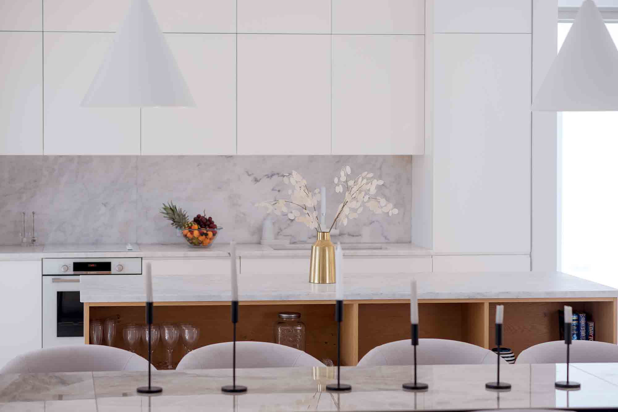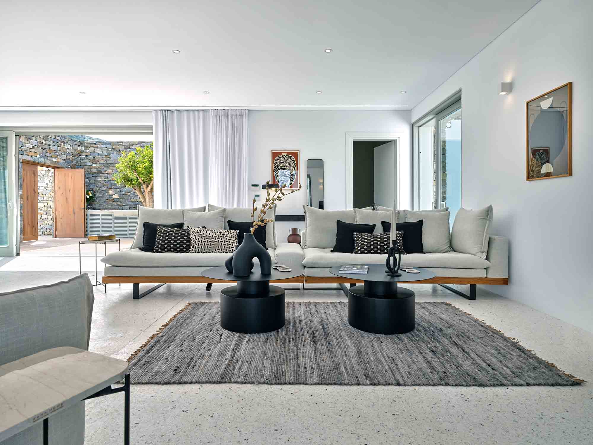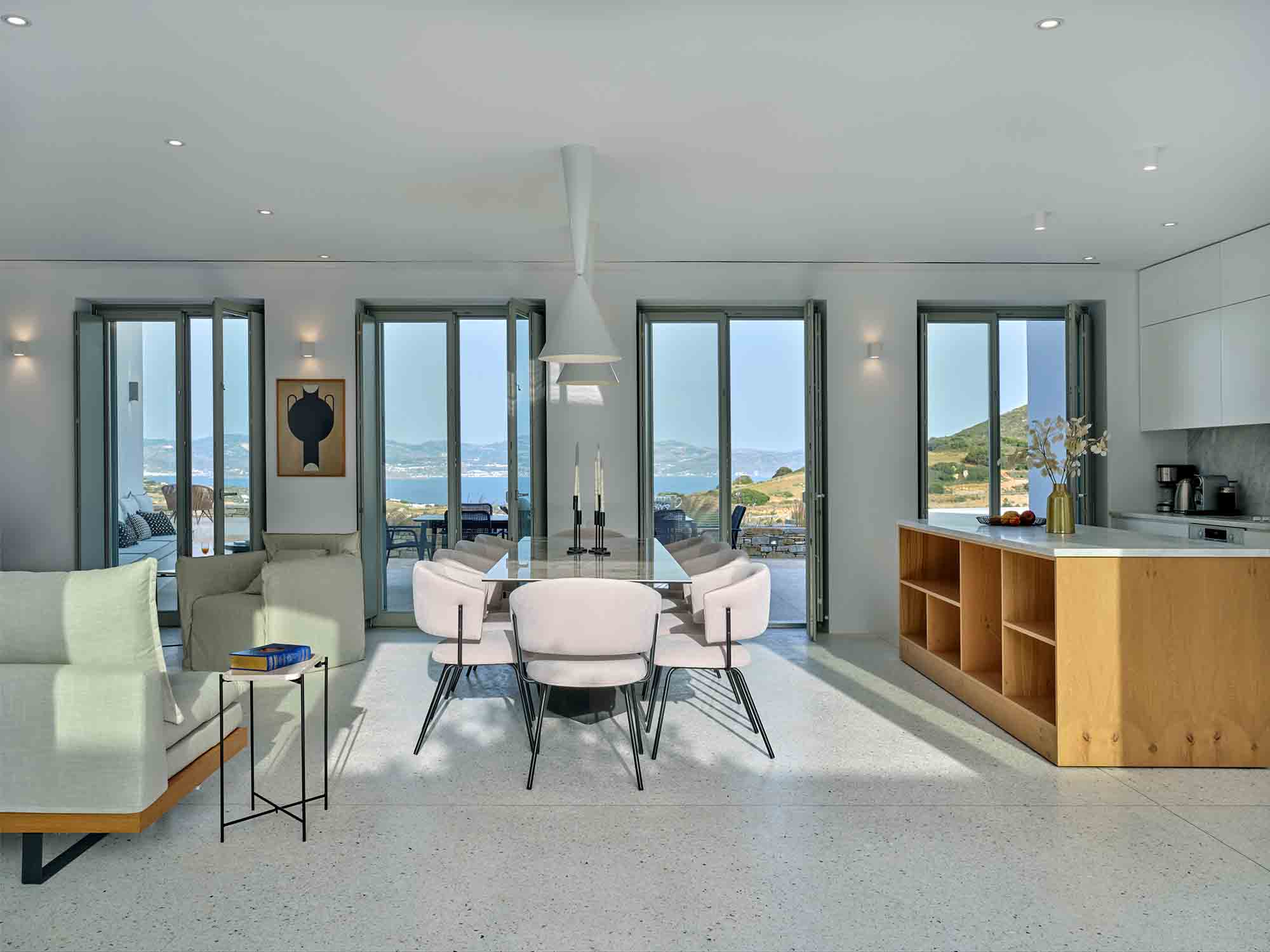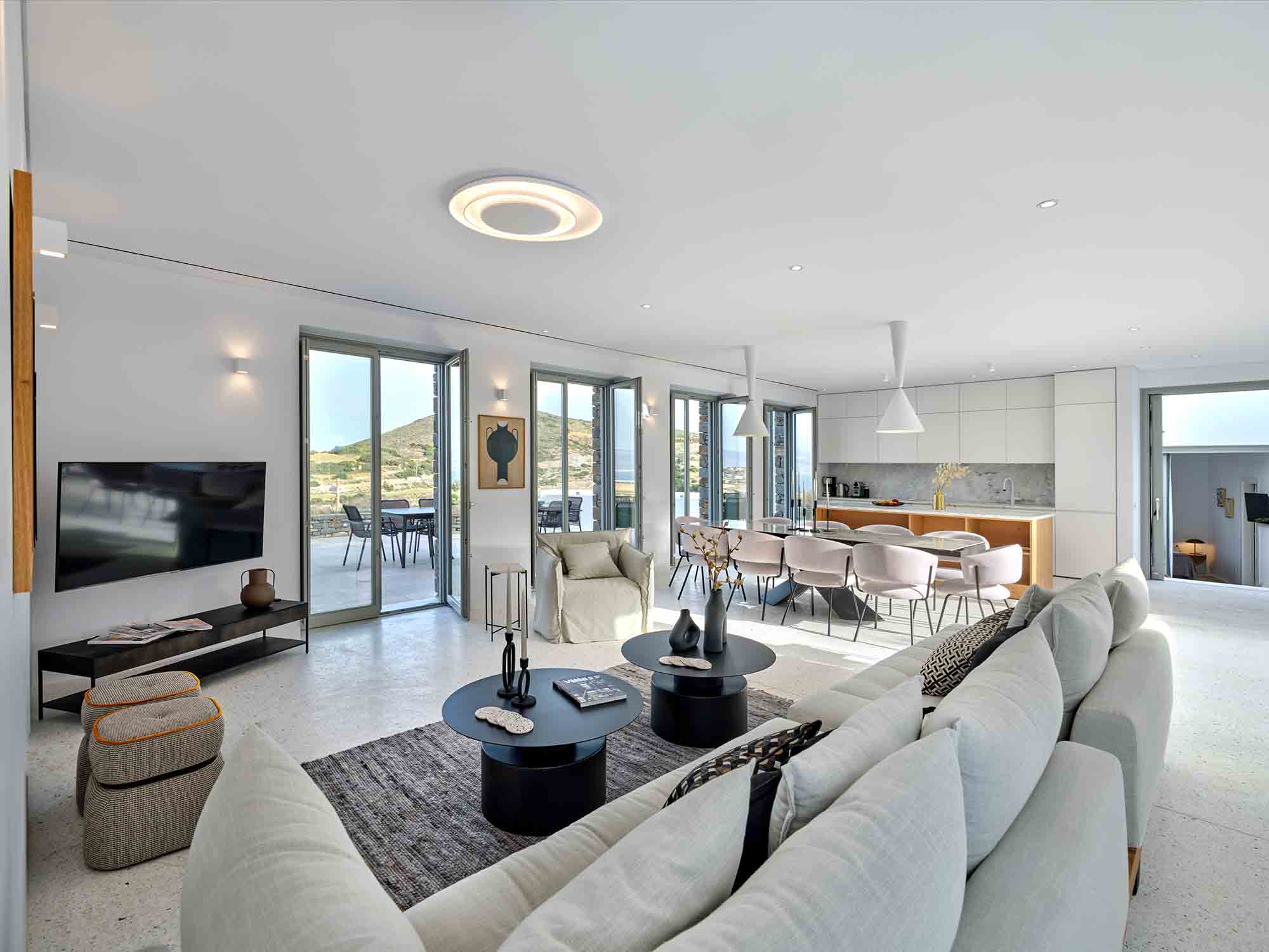 Upon arrival, guests are welcomed by striking stone walls and bespoke glazed doors that open into a bright, spacious living area. The open-plan design includes a sleek, modern kitchen with marble surfaces and high-end appliances, seamlessly connecting to refined indoor and outdoor dining areas. Whether it’s a relaxed daytime meal or dinner under the stars, every moment feels special.