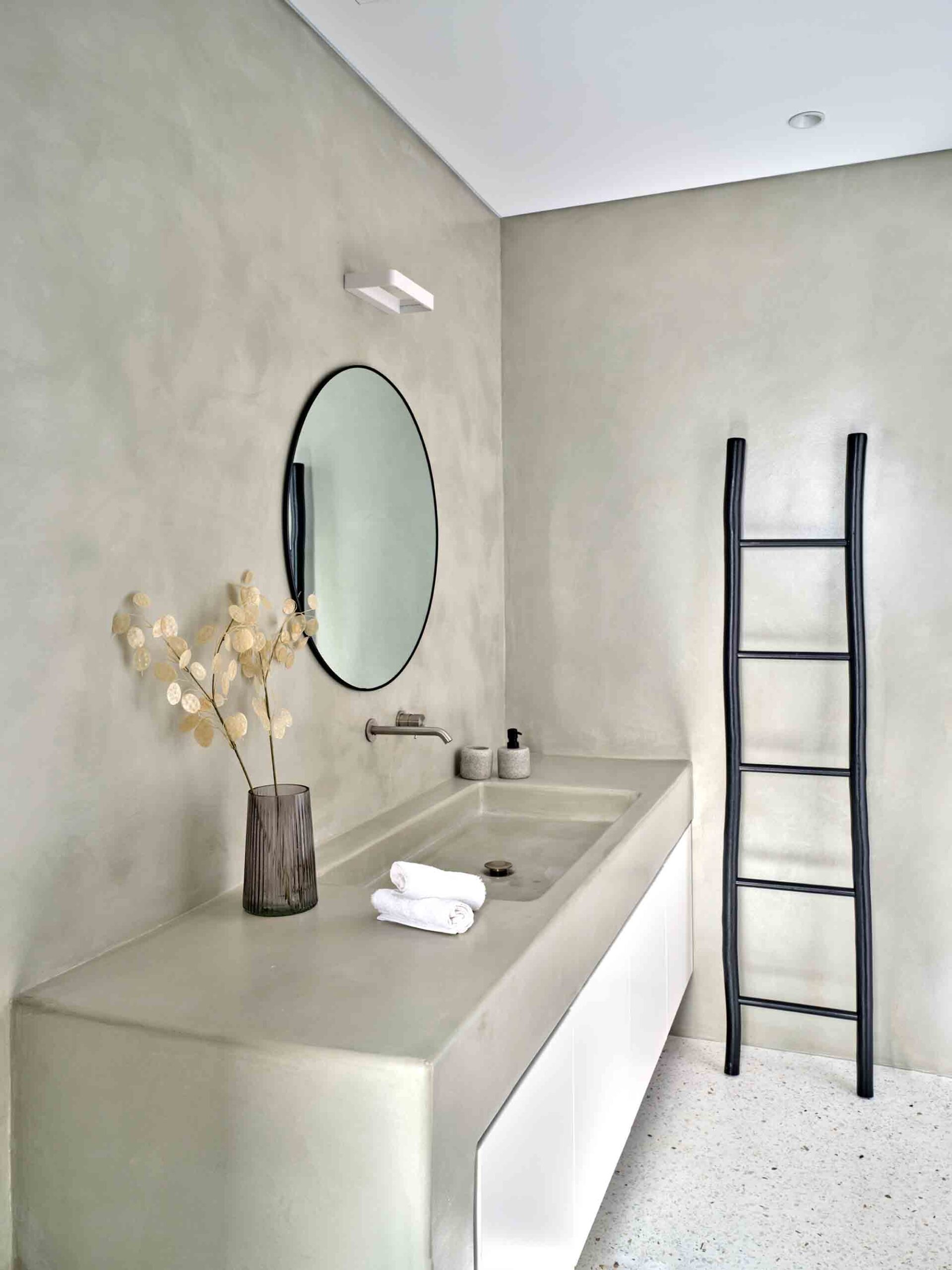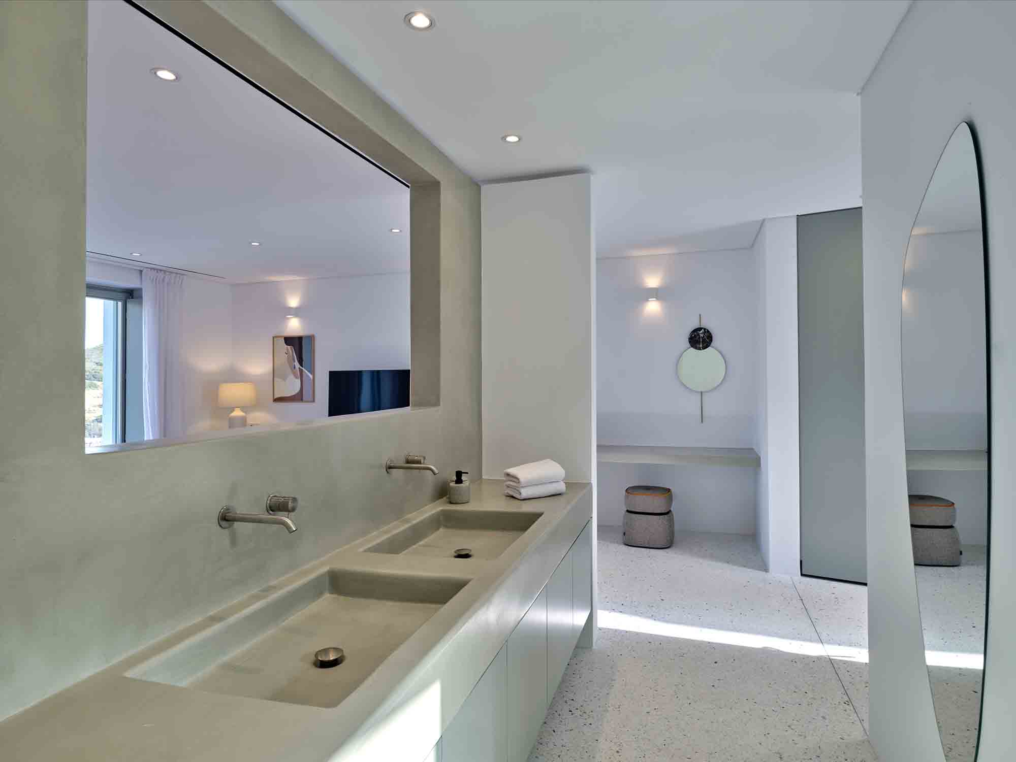 The master suite offers a luxurious retreat, filled with natural light and featuring a spacious bathroom with triple vanities, along with direct access to the main terrace. Two additional en-suite bedrooms, including one with twin beds, are located near the living space, each opening onto the same terrace with serene sea views.
