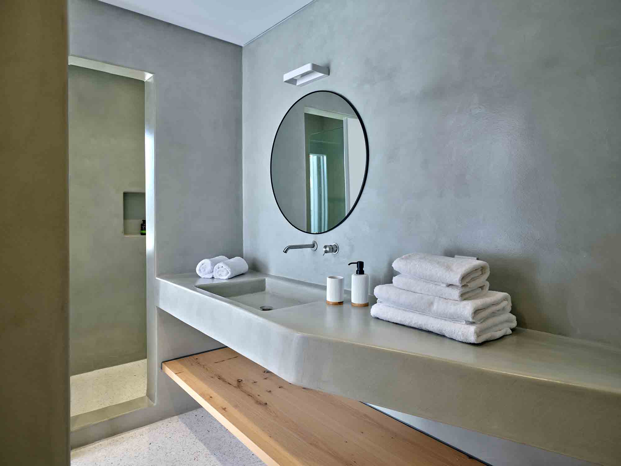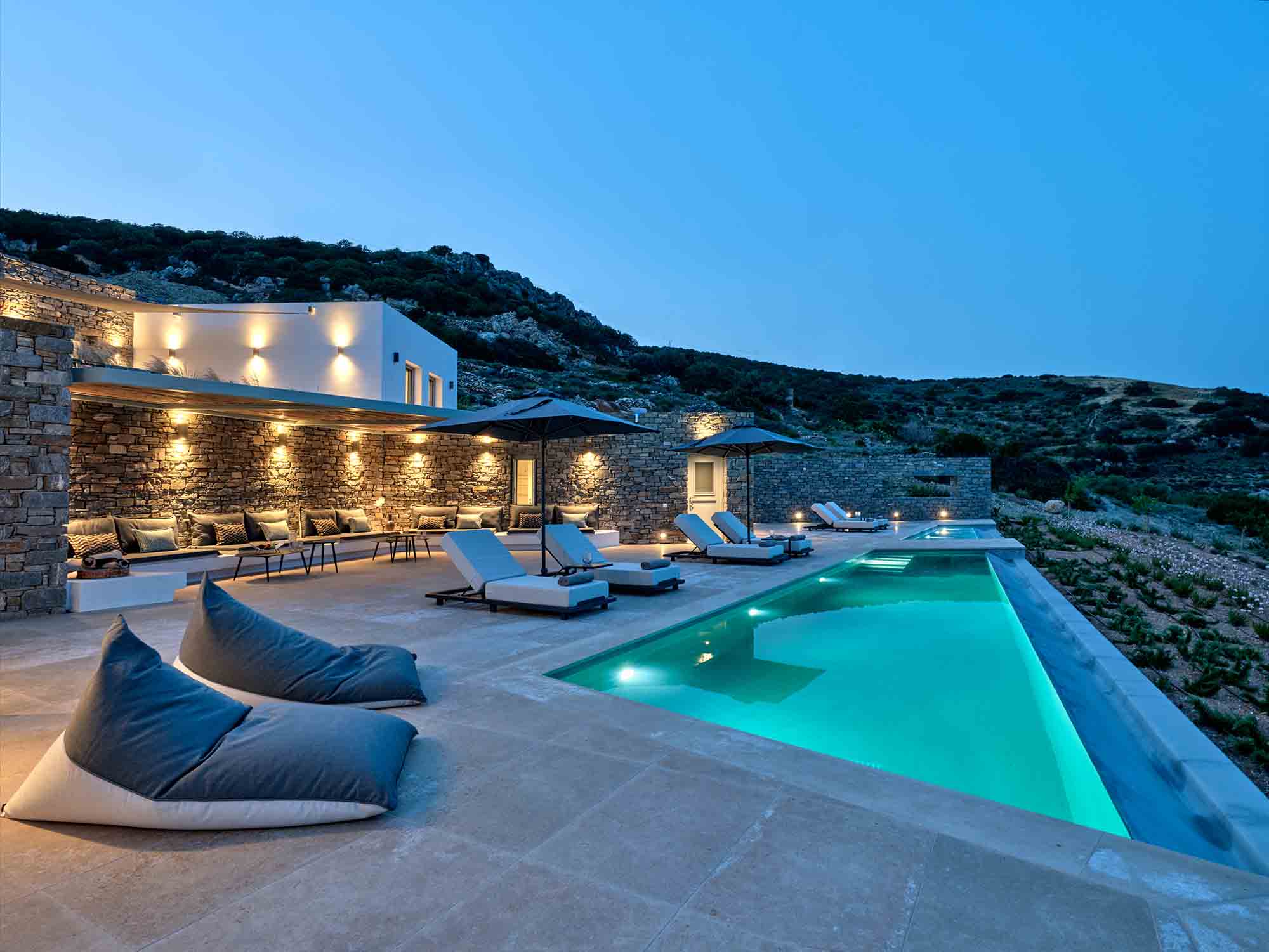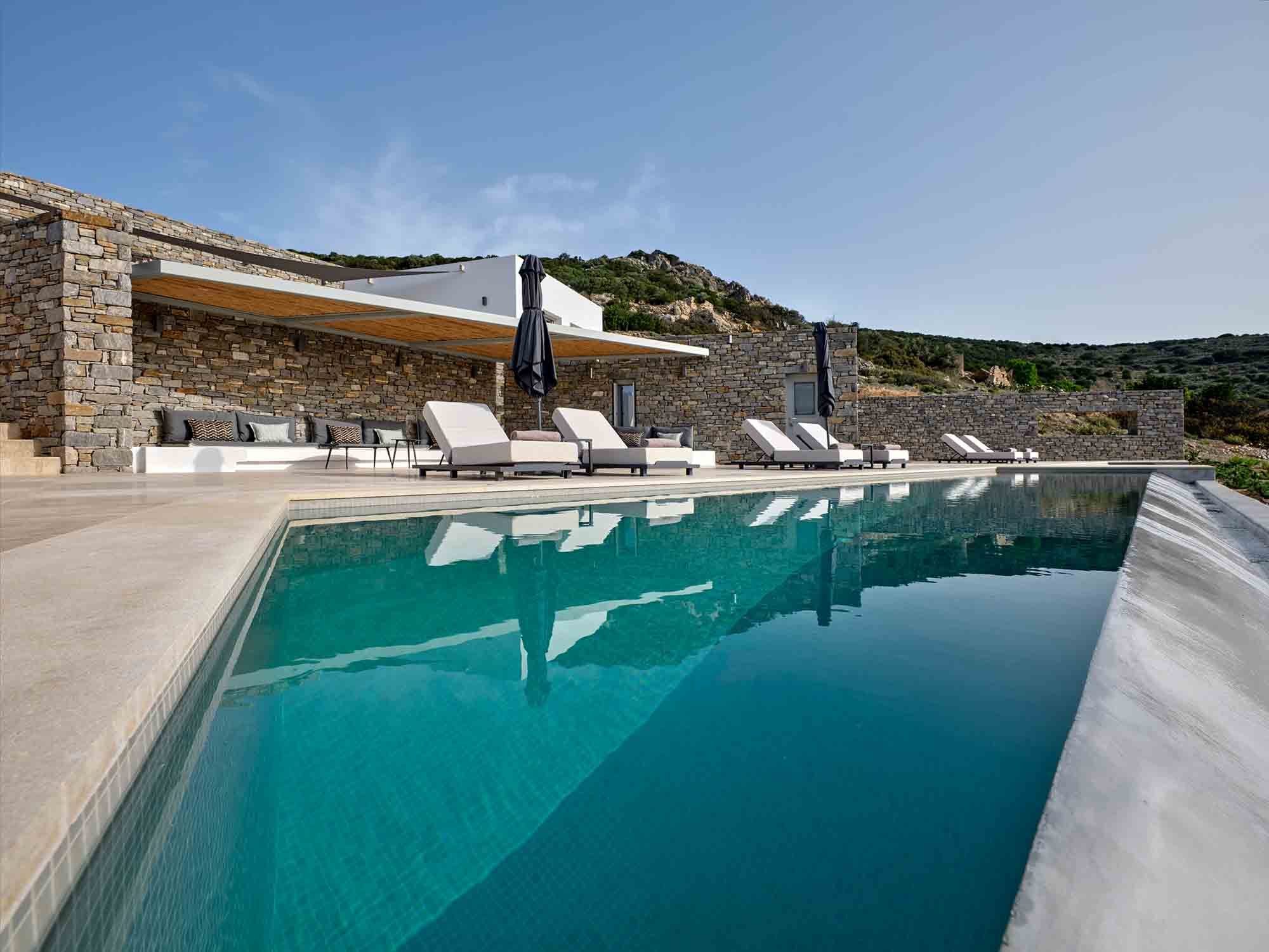 With its distinctive architectural design, Villa Marina captures the essence of Cycladic beauty through warm earthy tones, clean geometric lines, and calming water elements. Every detail has been thoughtfully chosen to create a tranquil atmosphere, making it an ideal setting for a truly memorable holiday.