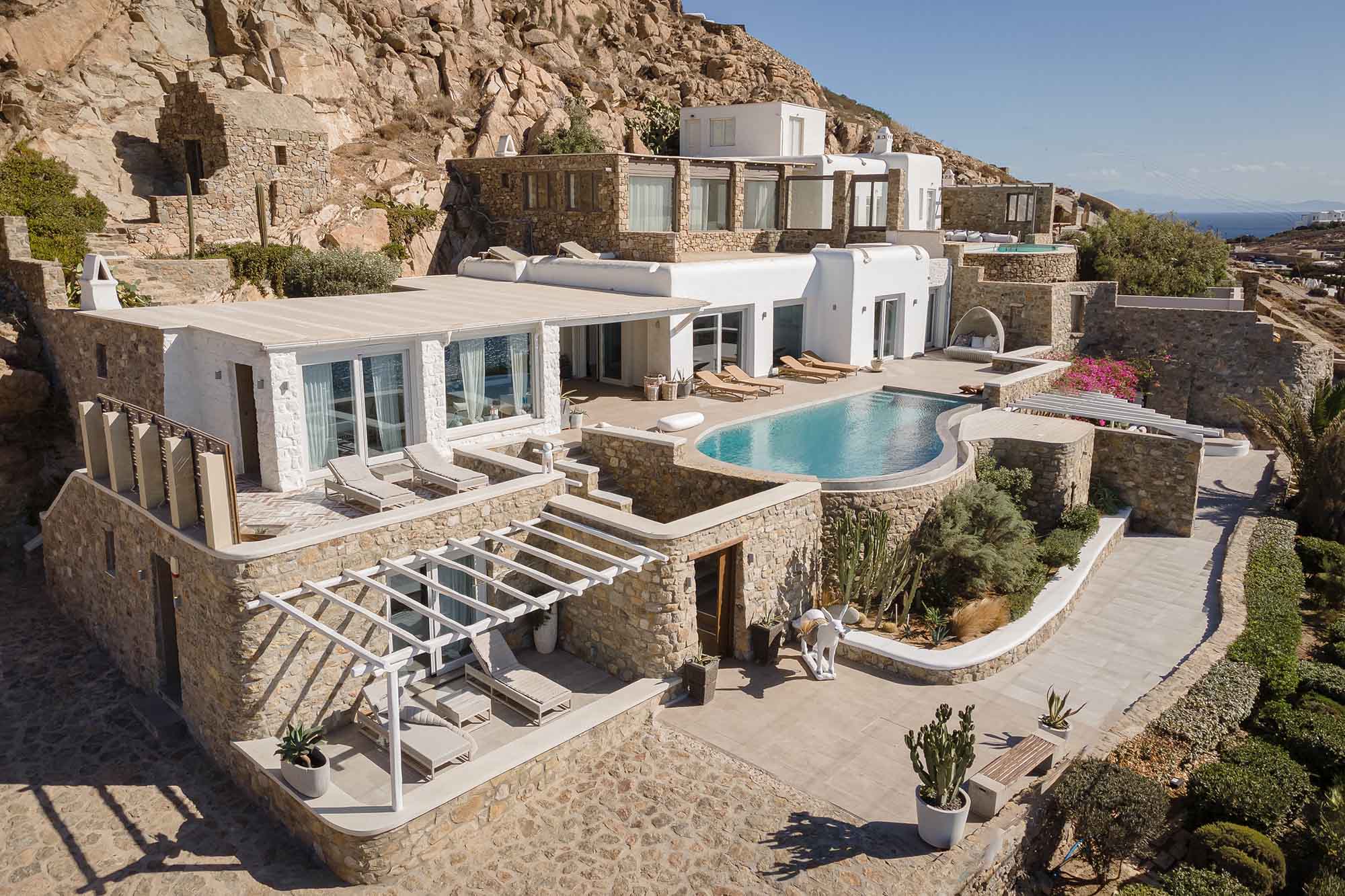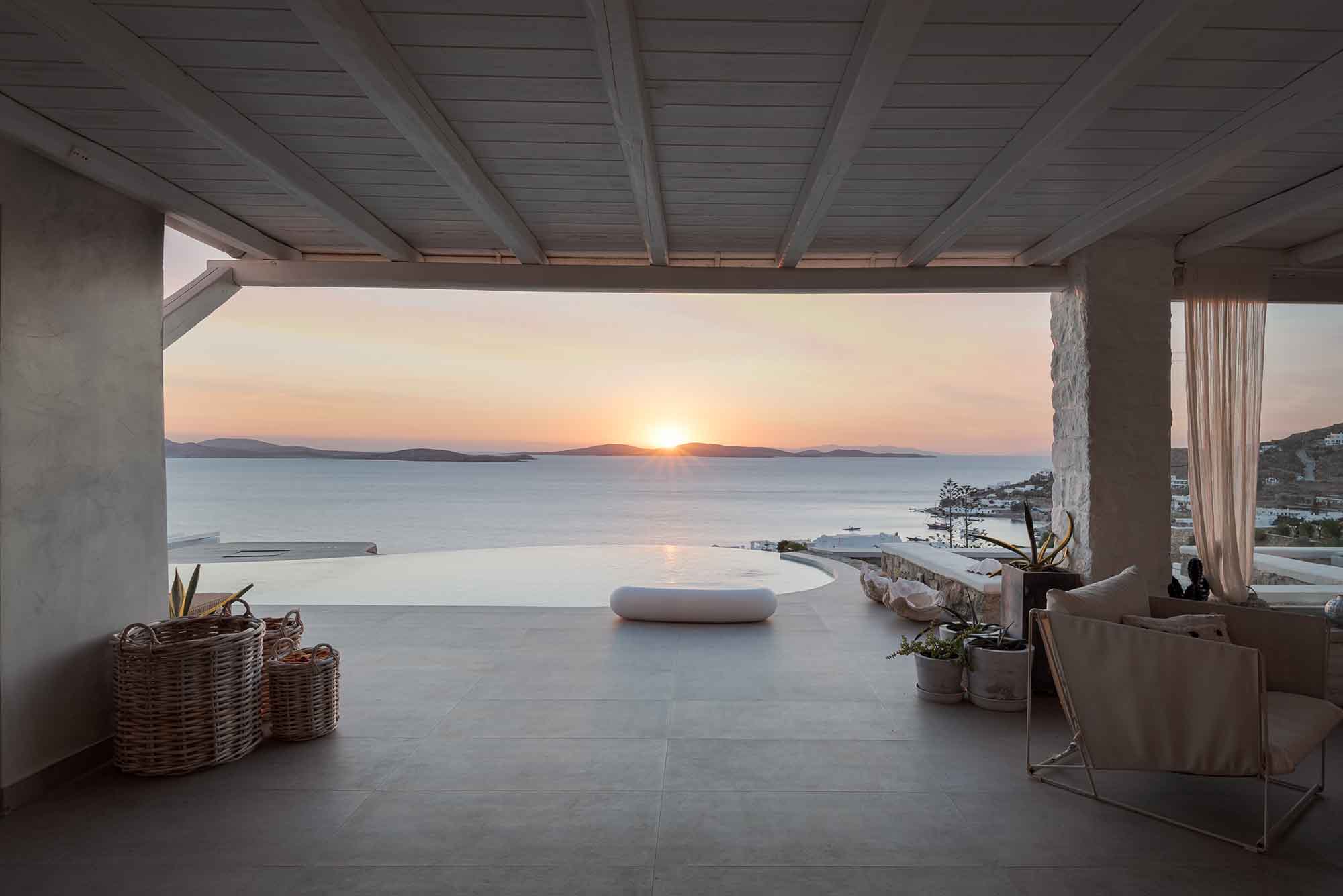 Villa Martina is a spacious villa of exceptional character, ideally located in Agios Ioannis area, with stunning sea and sunset views over the bay, and a private pool surrounded by shaded dining & sitting areas.