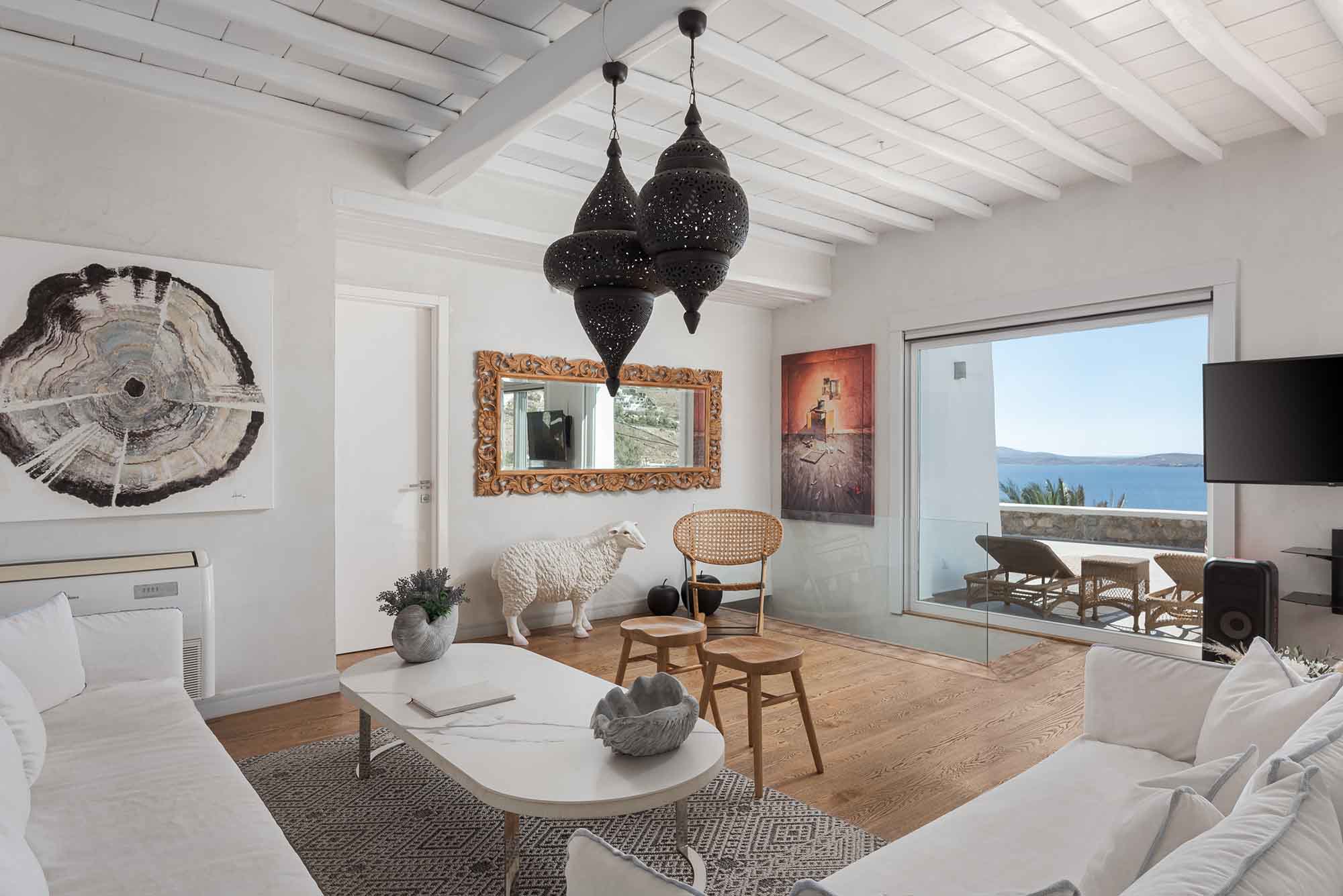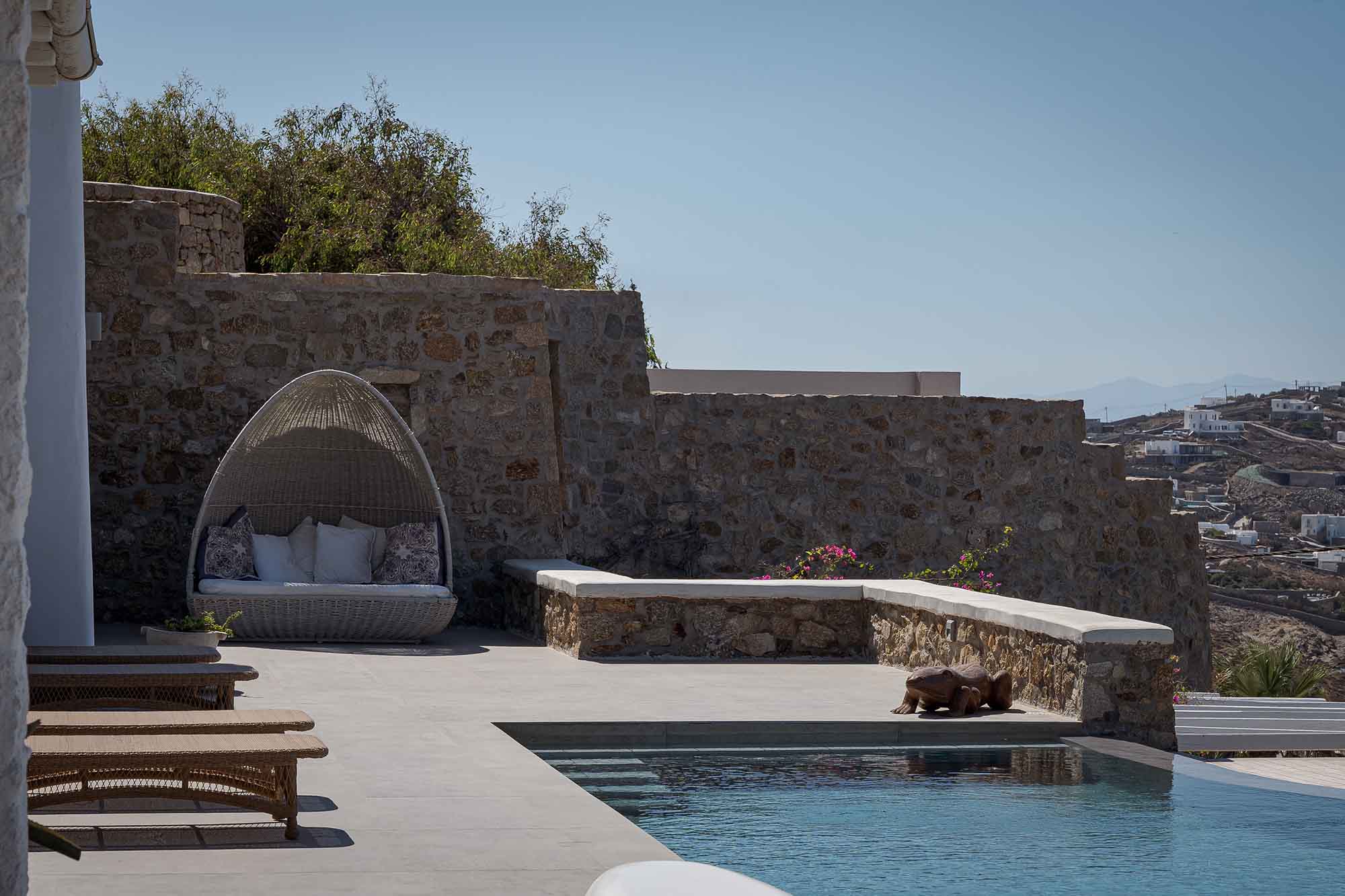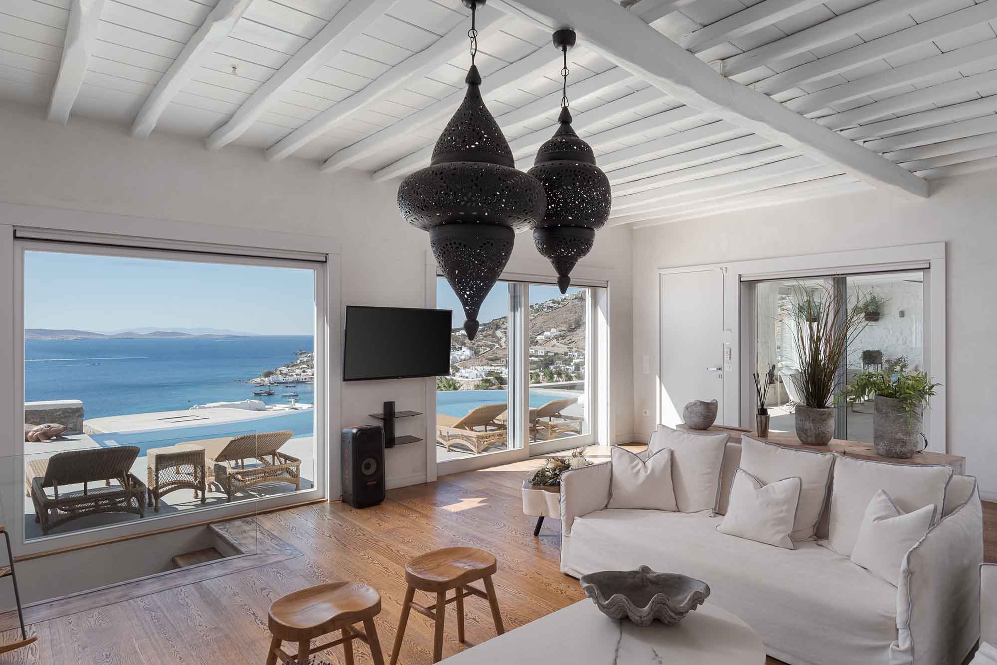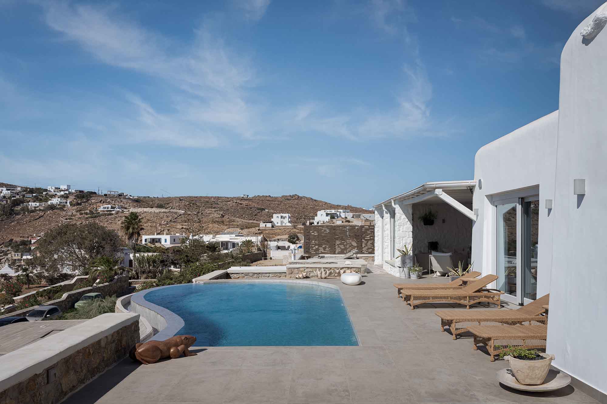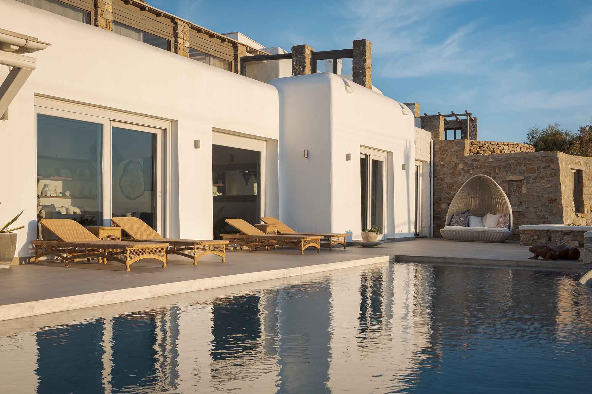 The villa is within walking distance from the beach of Agios Ioannis. The pool area is well equipped with sun beds and a lounge area for relaxation and entertaining. The bright, traditionally designed living room and dining area have also access to the pool area, and overlook the swimming pool, the sea and Delos island, while they offer amazing sunset views during the evening.