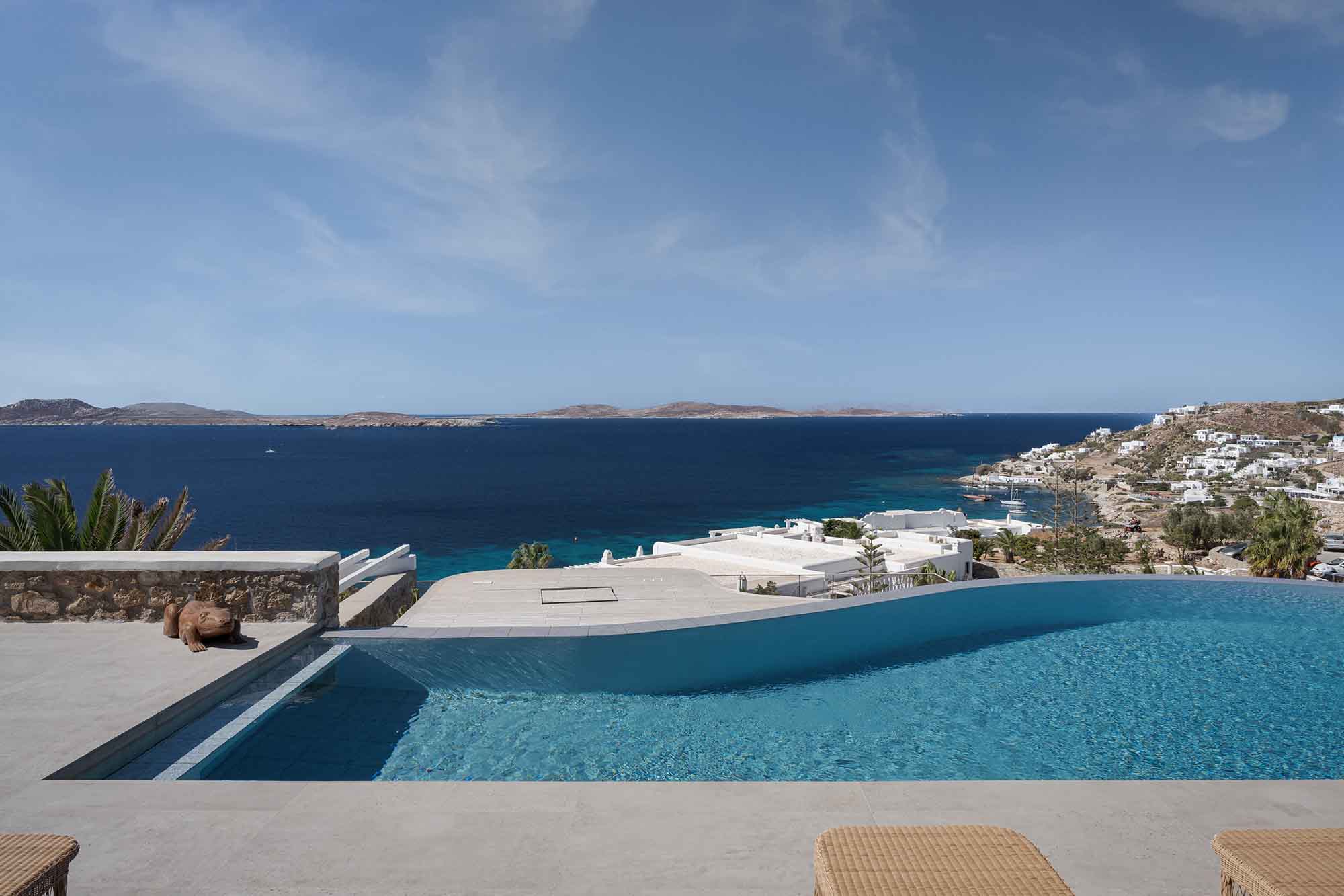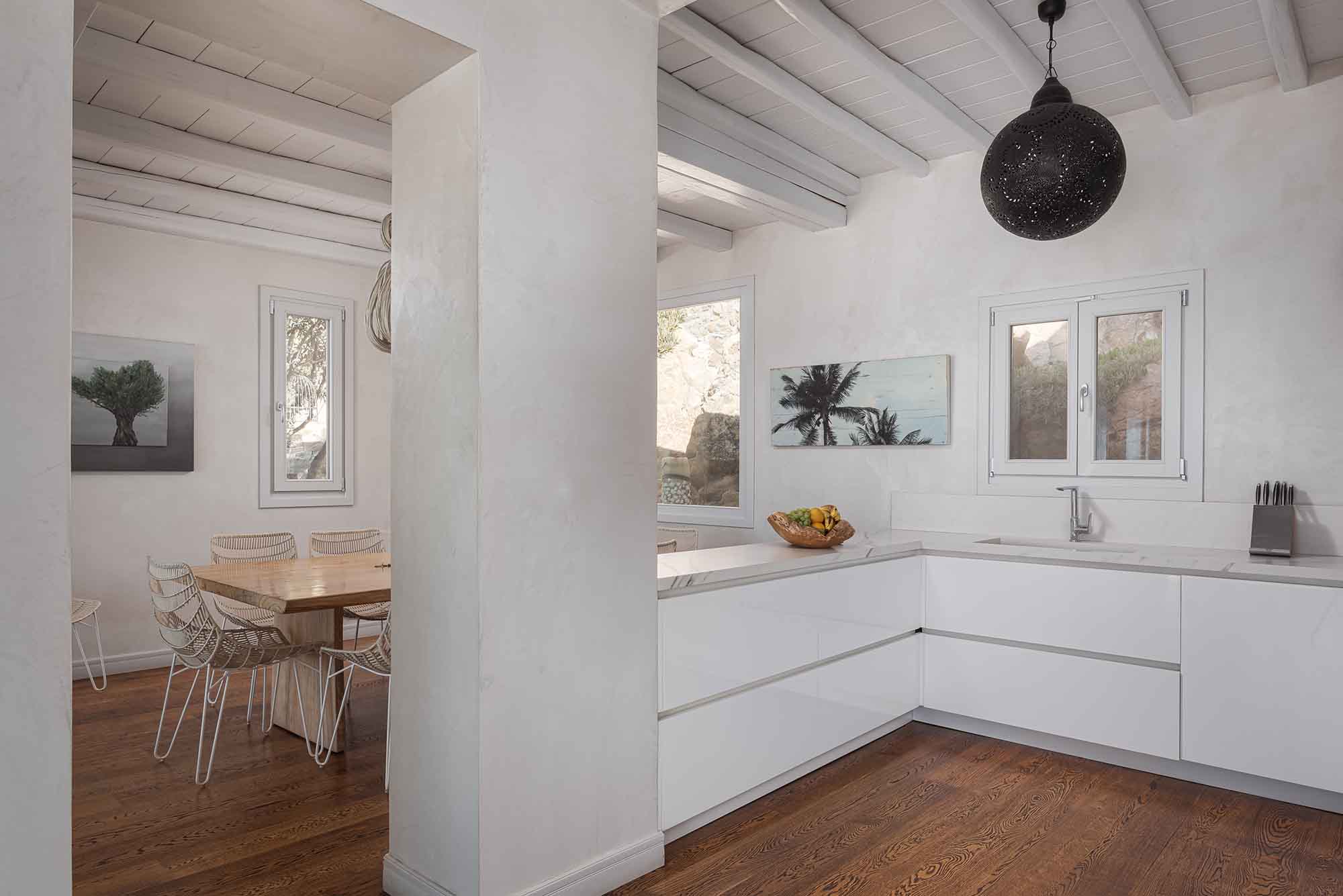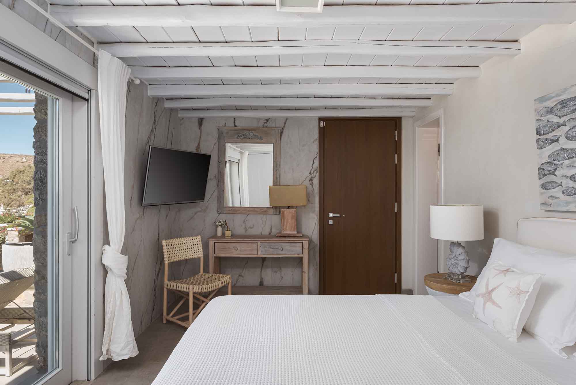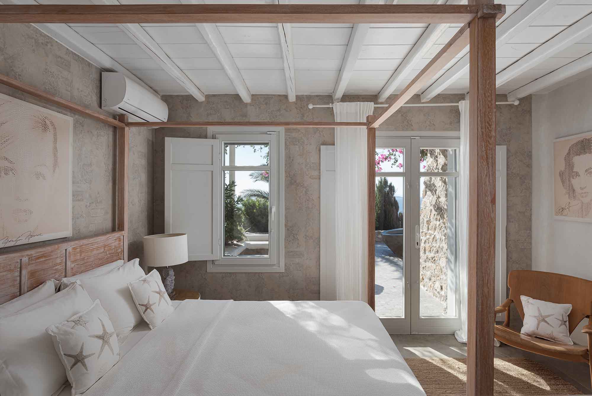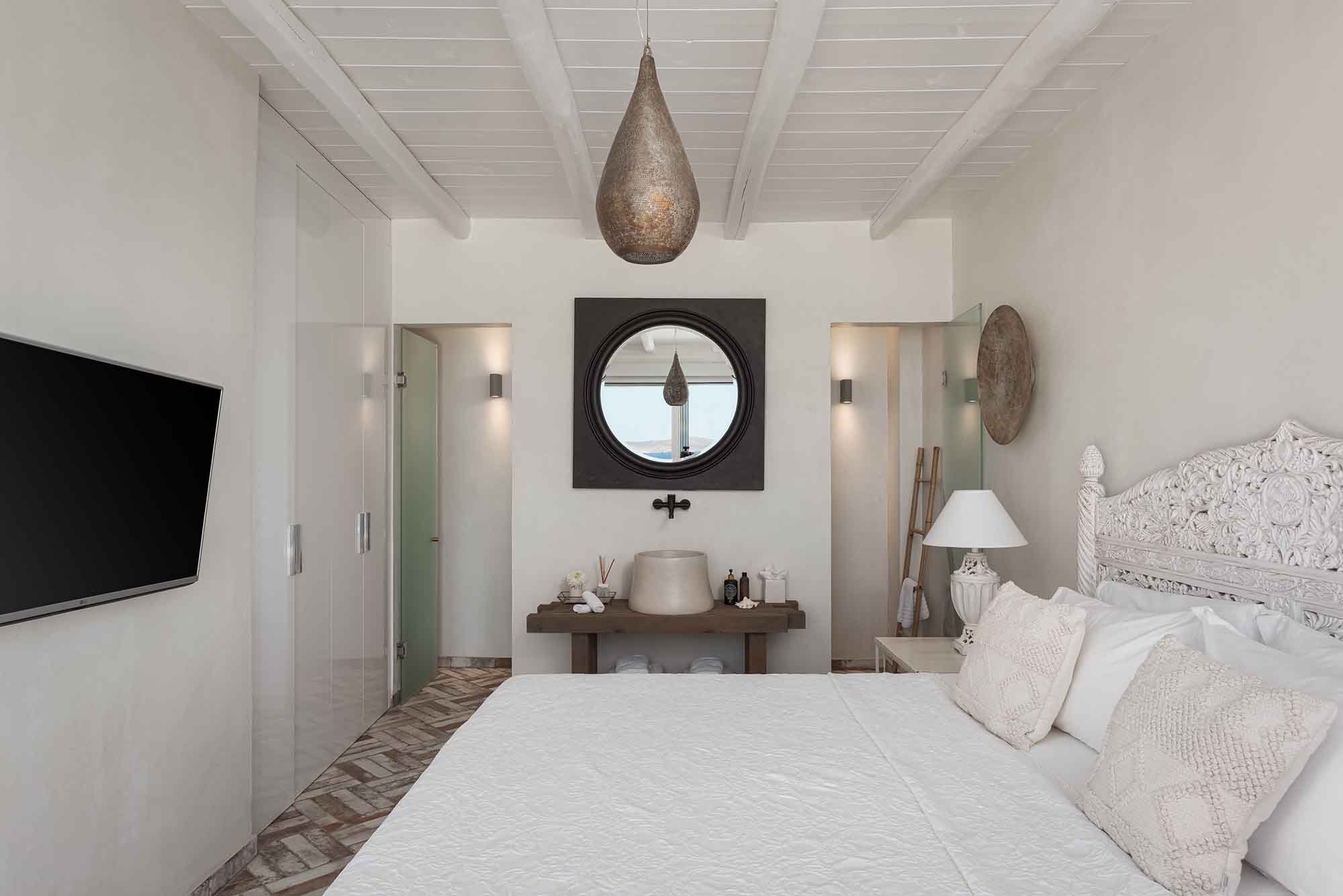 The villa is within walking distance from the beach of Agios Ioannis. The pool area is well equipped with sun beds and a lounge area for relaxation and entertaining. The bright, traditionally designed living room and dining area have also access to the pool area, and overlook the swimming pool, the sea and Delos island, while they offer amazing sunset views during the evening.