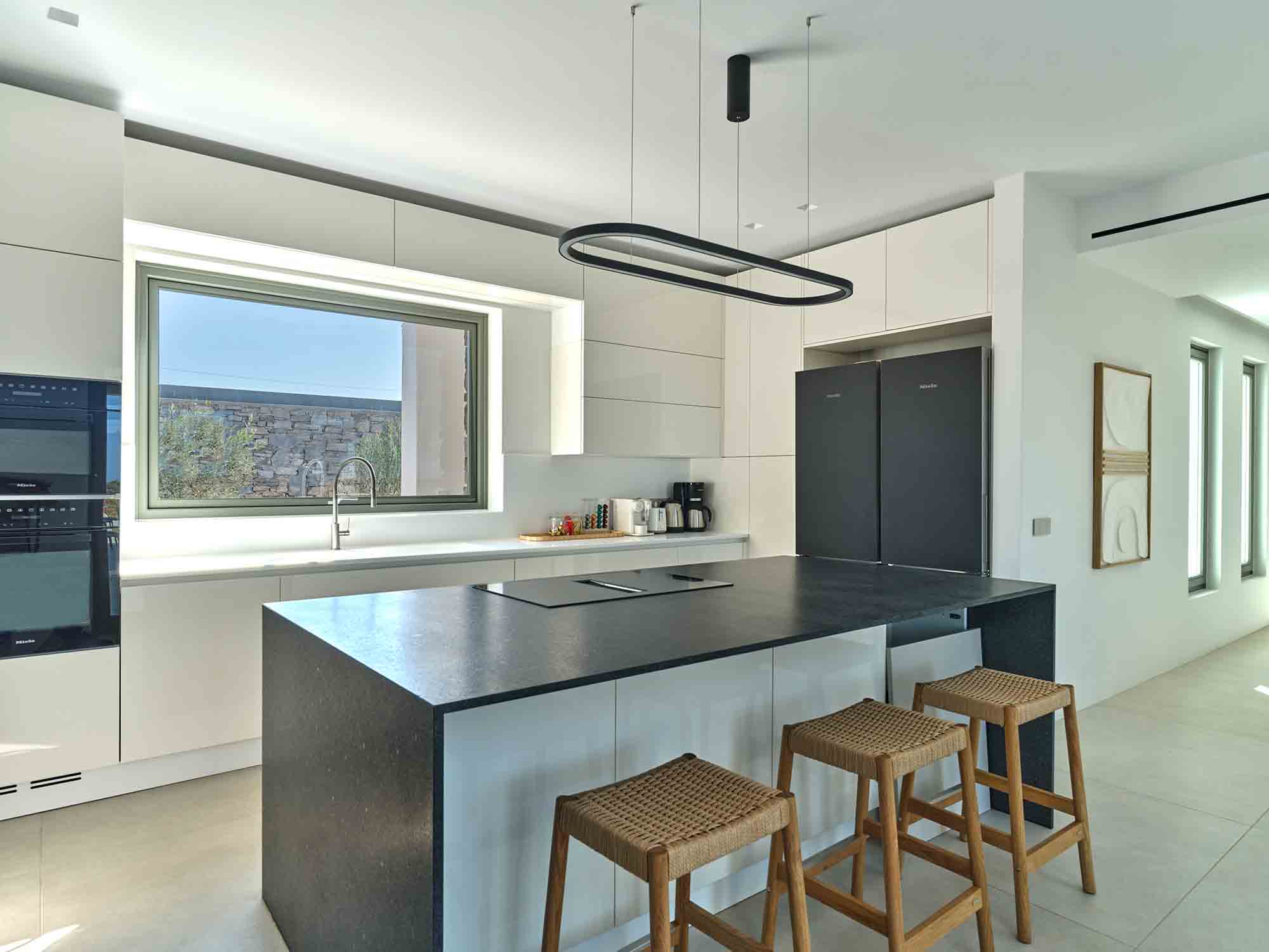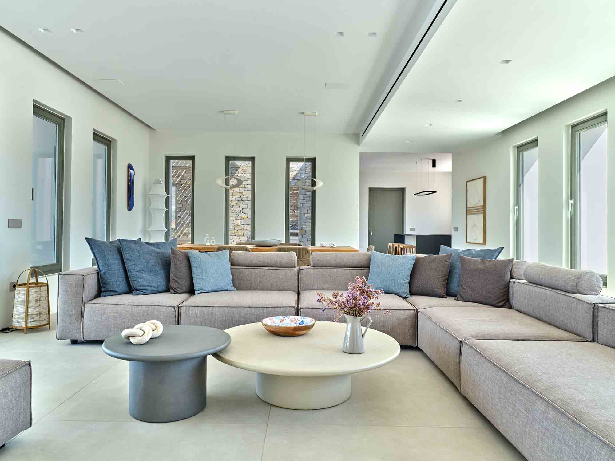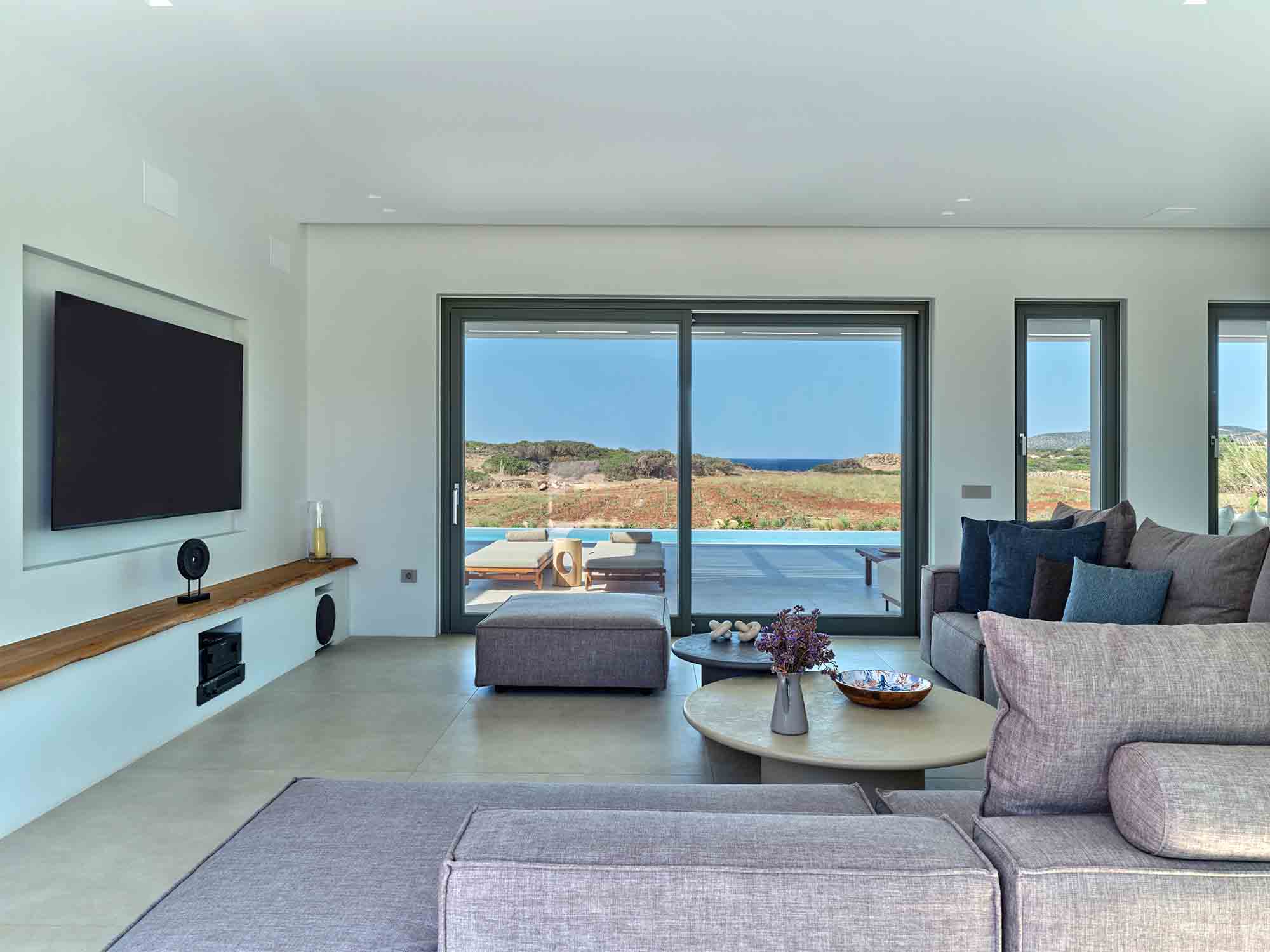 At the heart of the estate lies the Main House, a single-level residence spanning 267 sqm of refined living space. A statement entrance door reveals a breathtaking view through a large picture window, framing an ancient olive tree, the infinity pool, and the endless blue of the Aegean Sea. Inside, the open-plan kitchen and living area is flooded with natural light, enhanced by expansive sliding glass doors that fully open to the outdoors, creating a fluid and airy living environment.