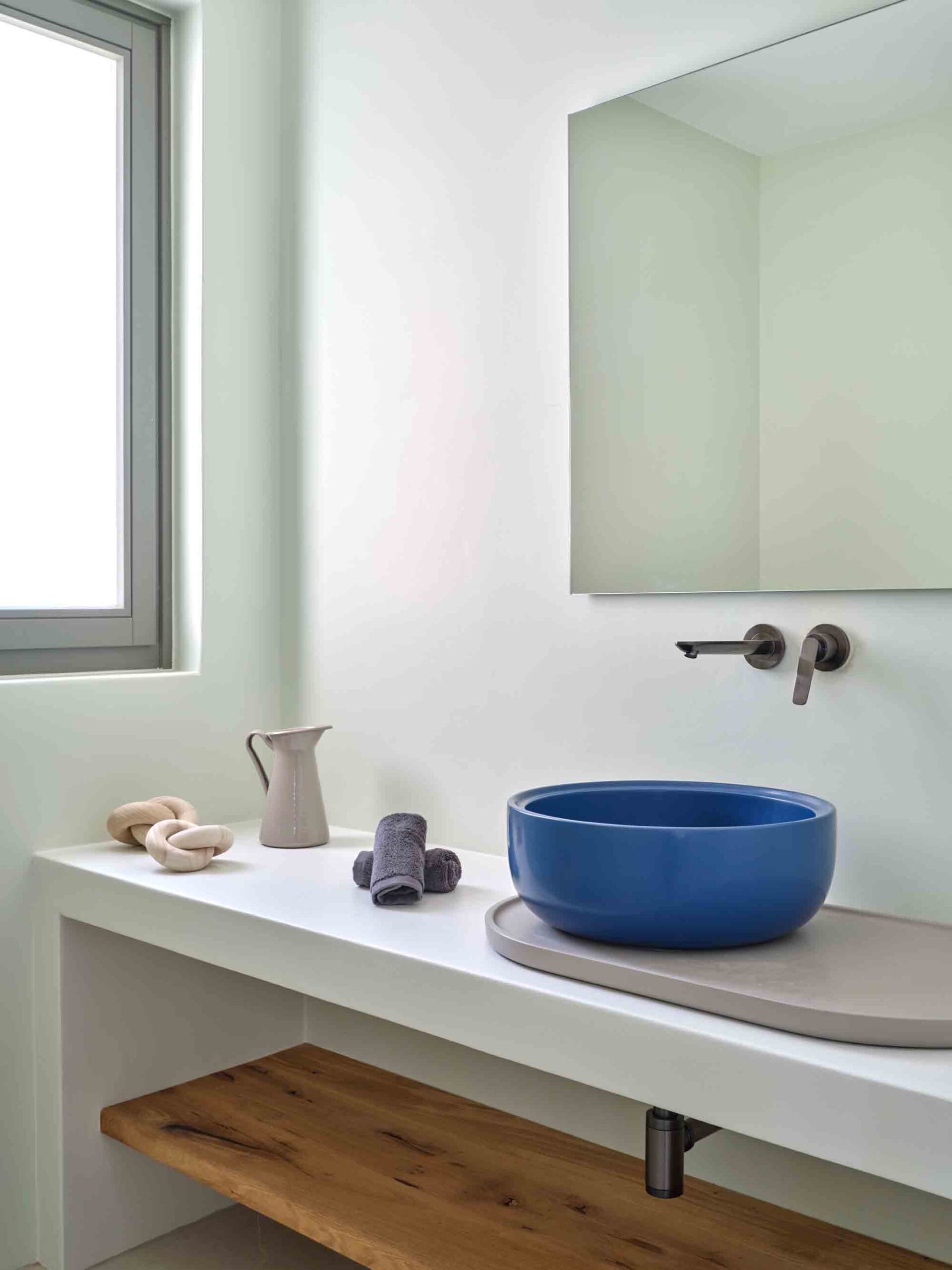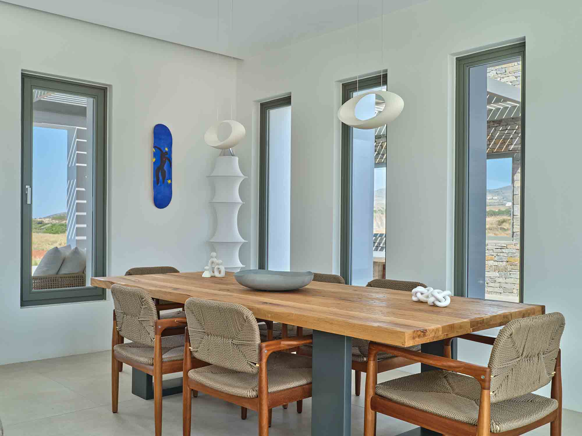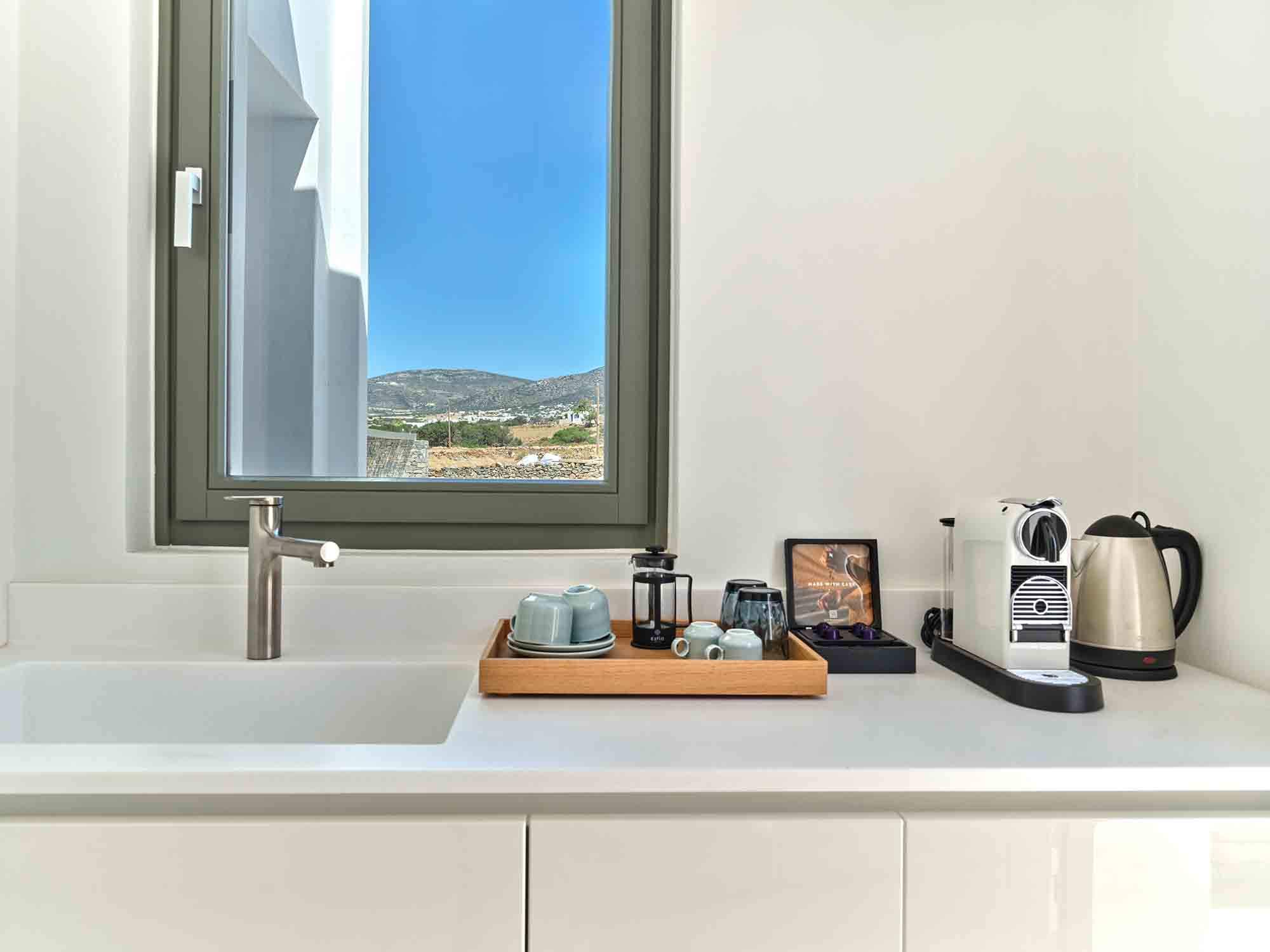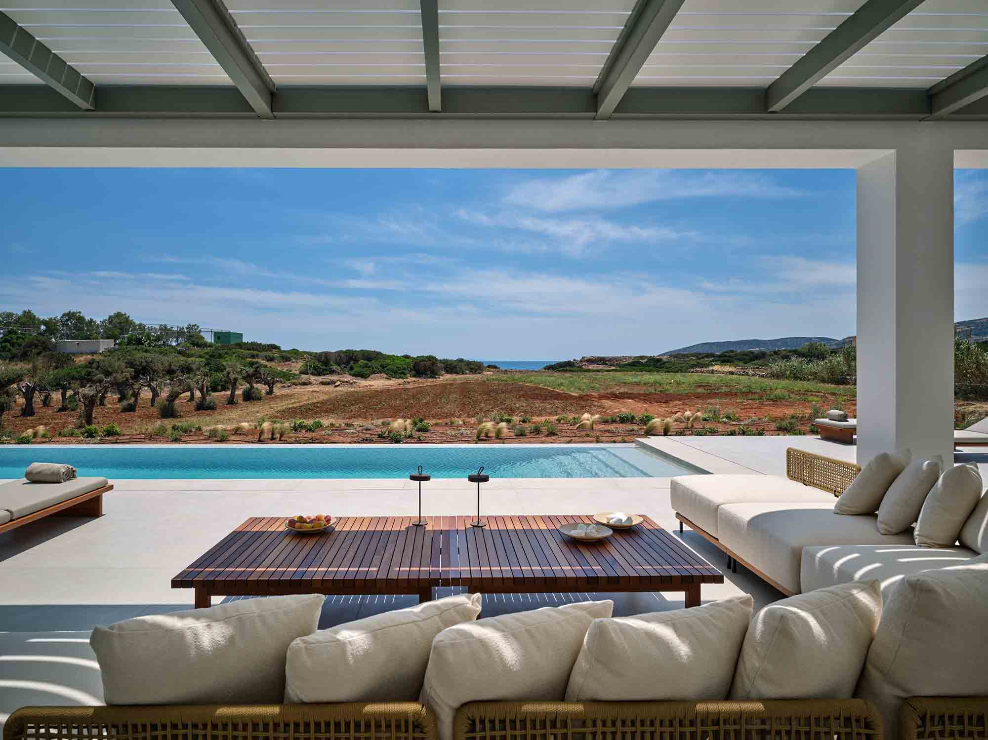 At the heart of the estate lies the Main House, a single-level residence spanning 267 sqm of refined living space. A statement entrance door reveals a breathtaking view through a large picture window, framing an ancient olive tree, the infinity pool, and the endless blue of the Aegean Sea. Inside, the open-plan kitchen and living area is flooded with natural light, enhanced by expansive sliding glass doors that fully open to the outdoors, creating a fluid and airy living environment.
