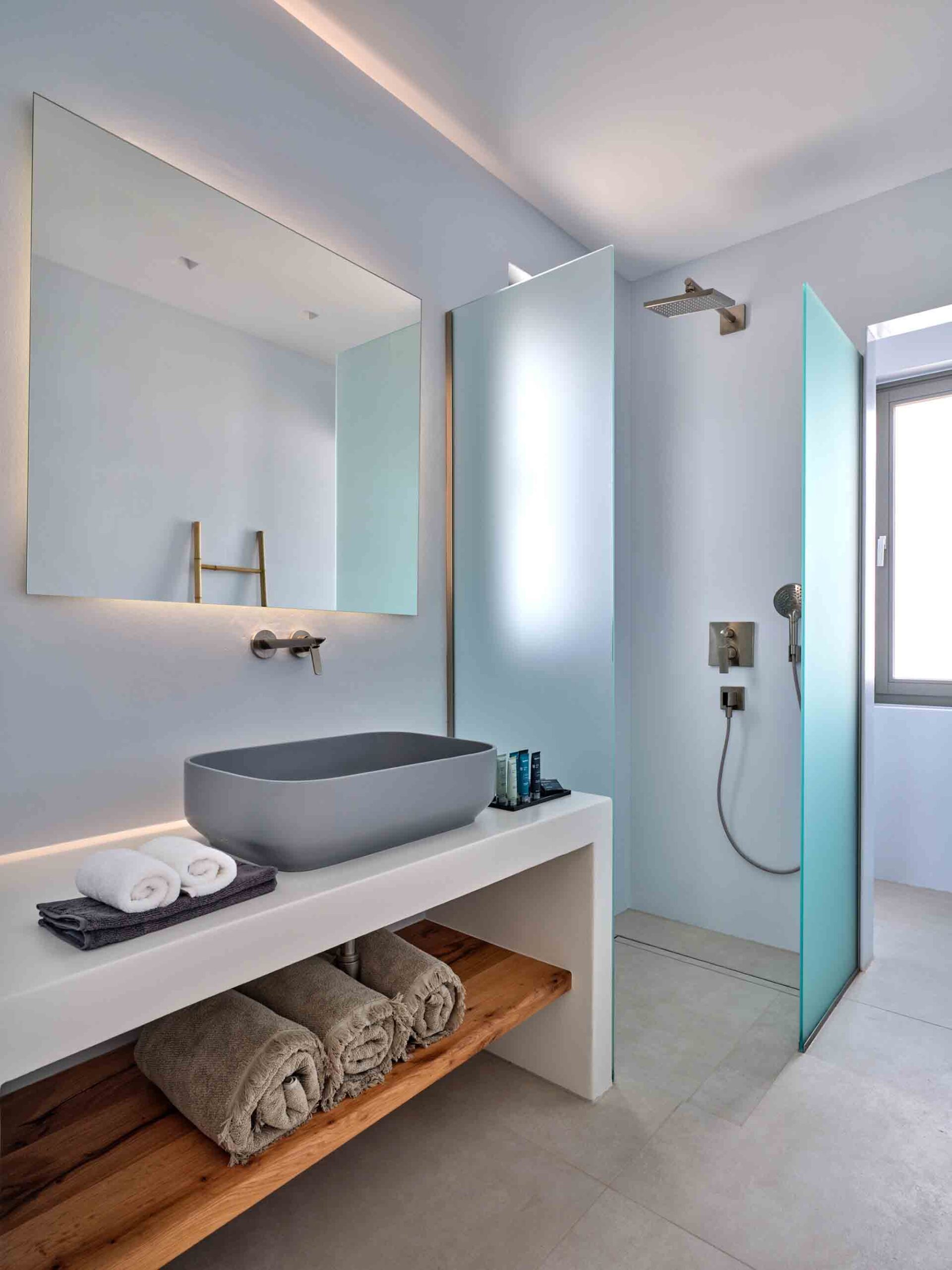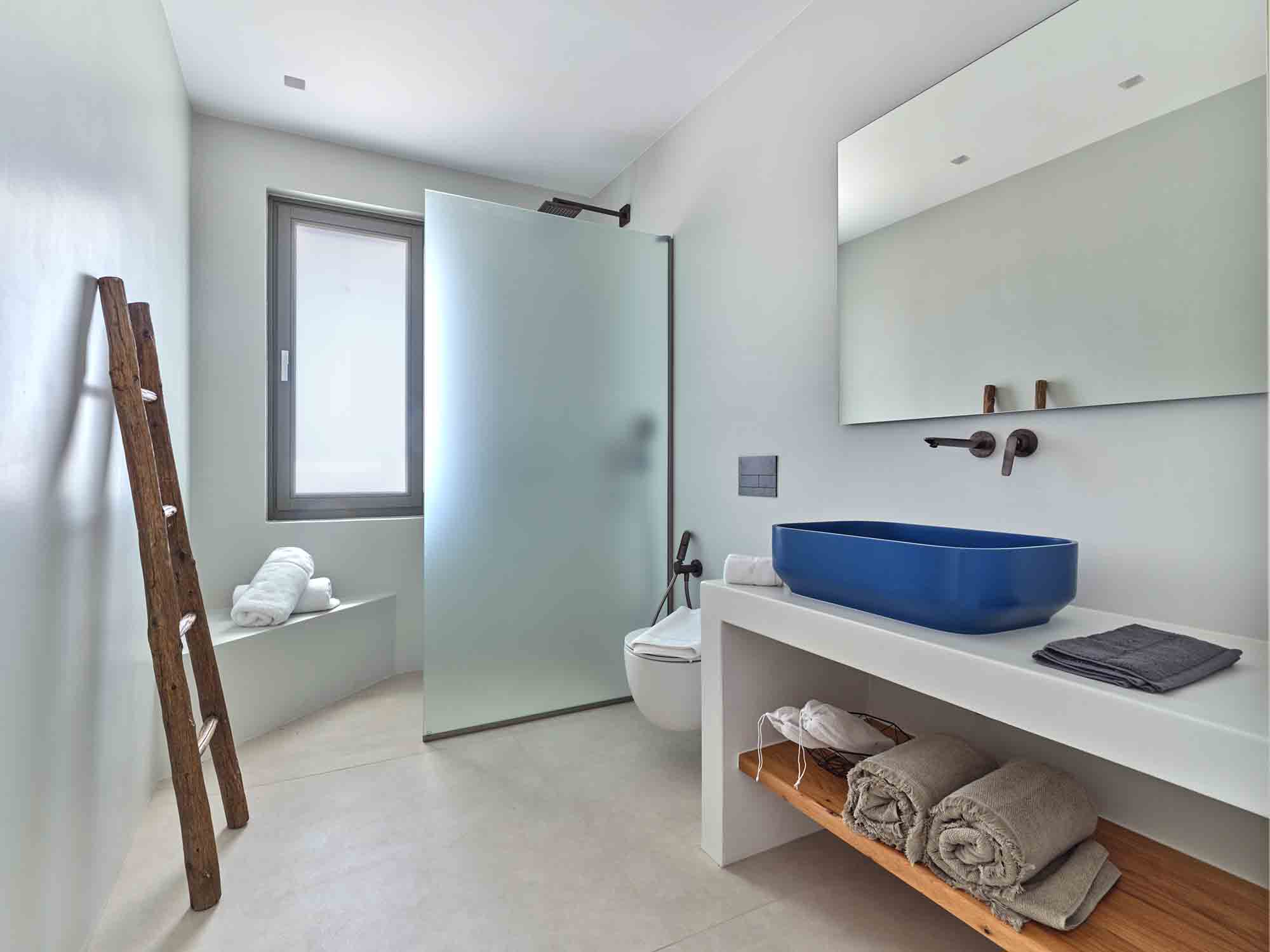 - Bedroom 3 – Double bed, En-suite bathroom, A/C, TV, Sea View, Access to private terrace, Main House