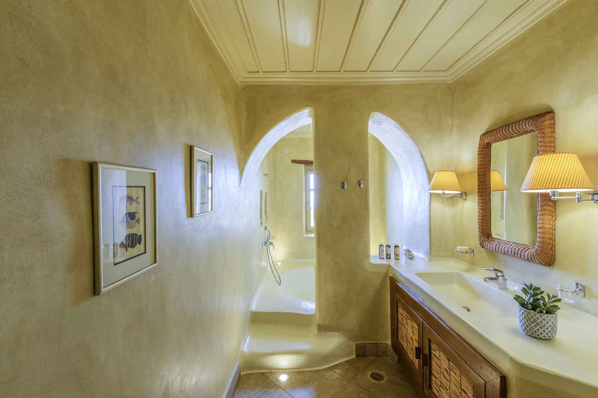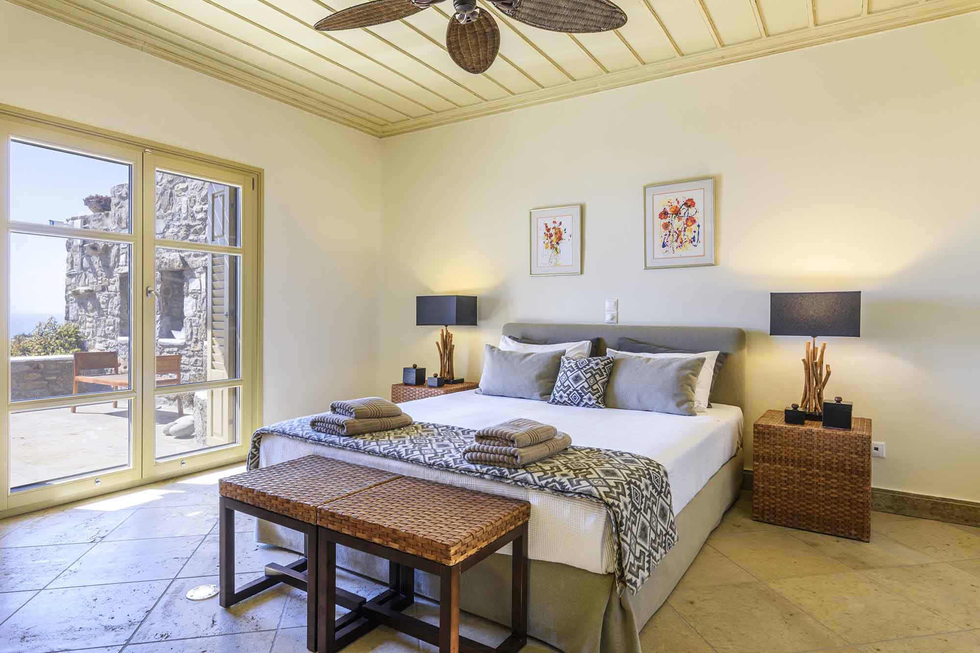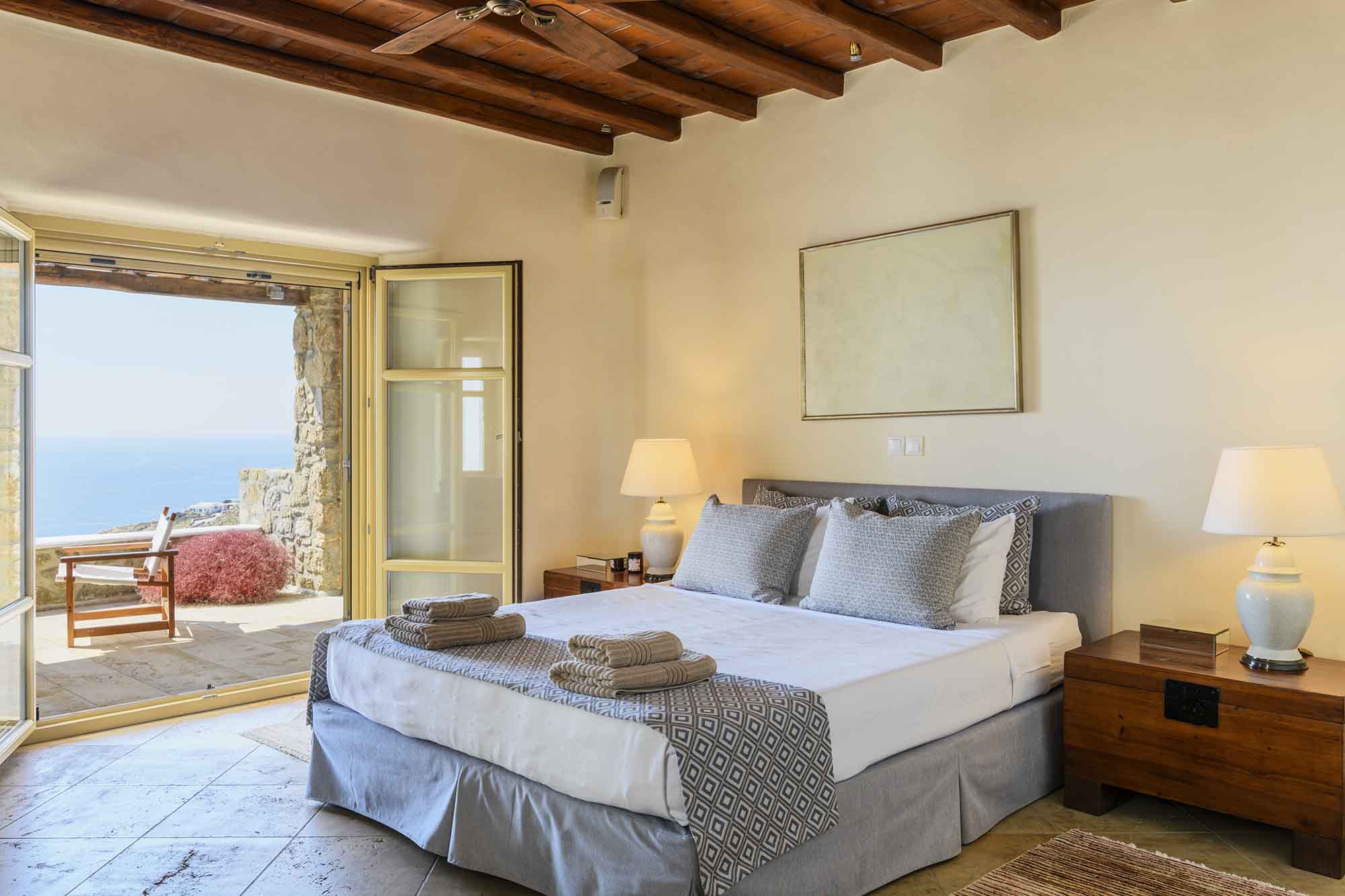 The villa's spacious design and six lavishly appointed bedrooms offer a tranquil haven for families and groups of friends seeking a dreamy escape. The villa's interiors are a harmonious blend of modern amenities and traditional Cycladic architecture, with gleaming white walls and rustic wooden beams.