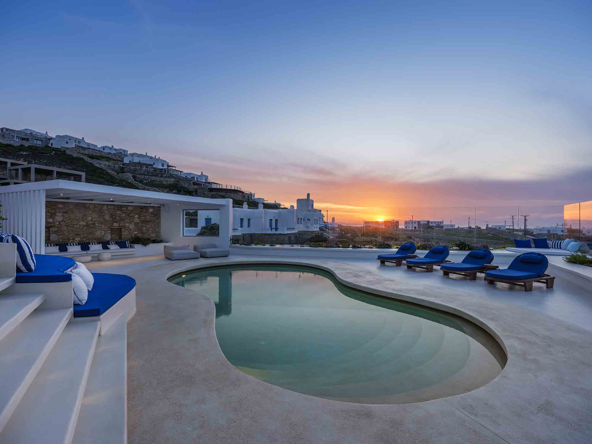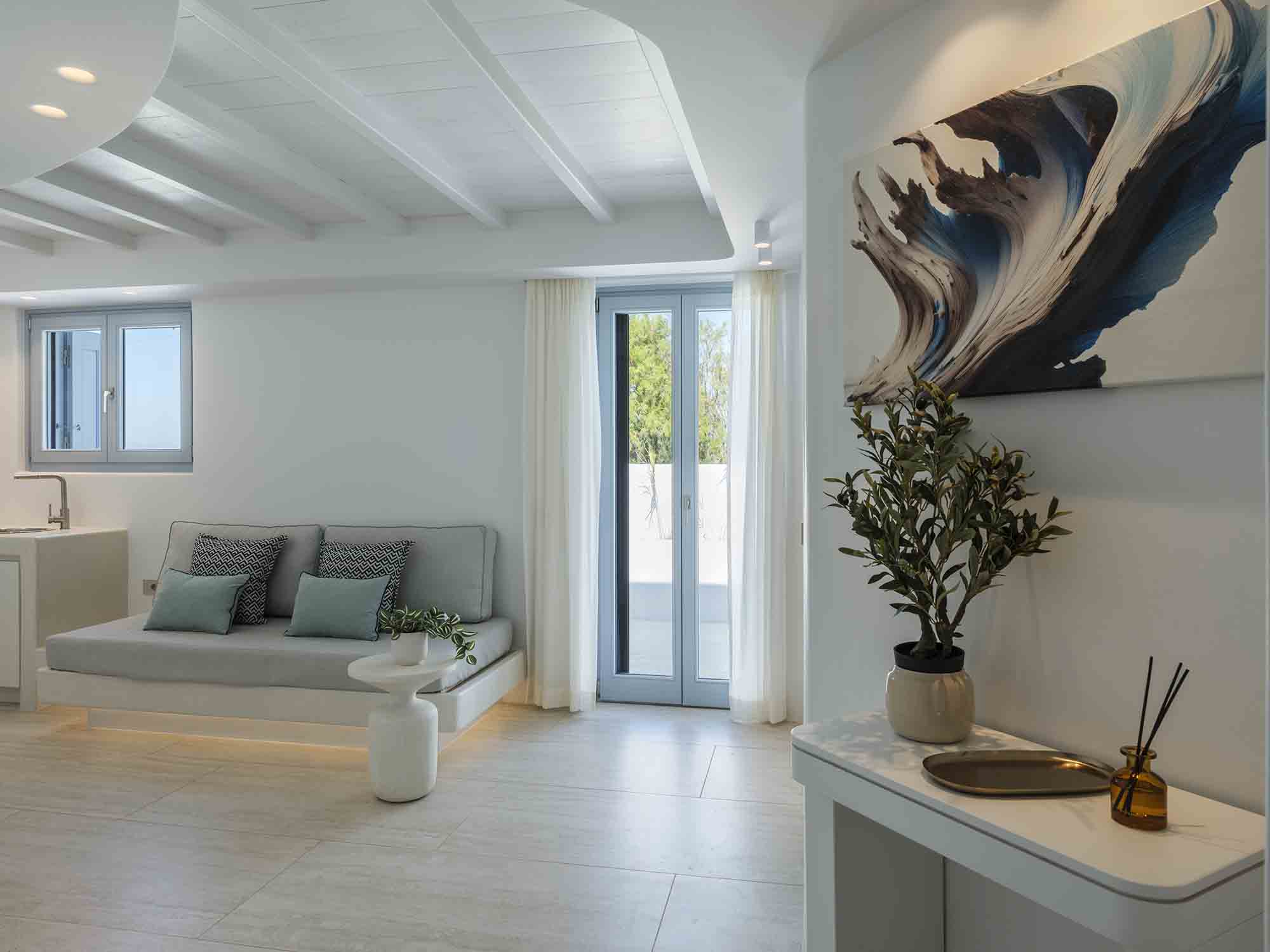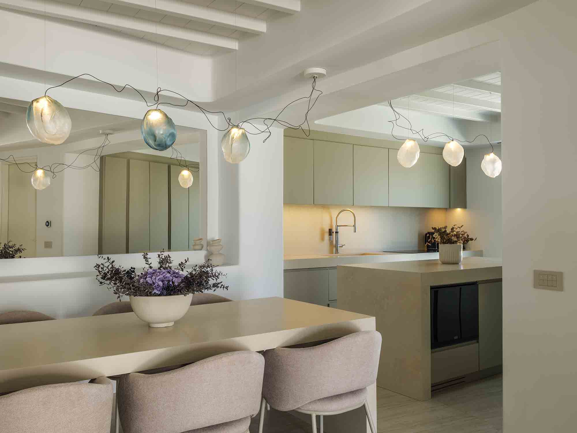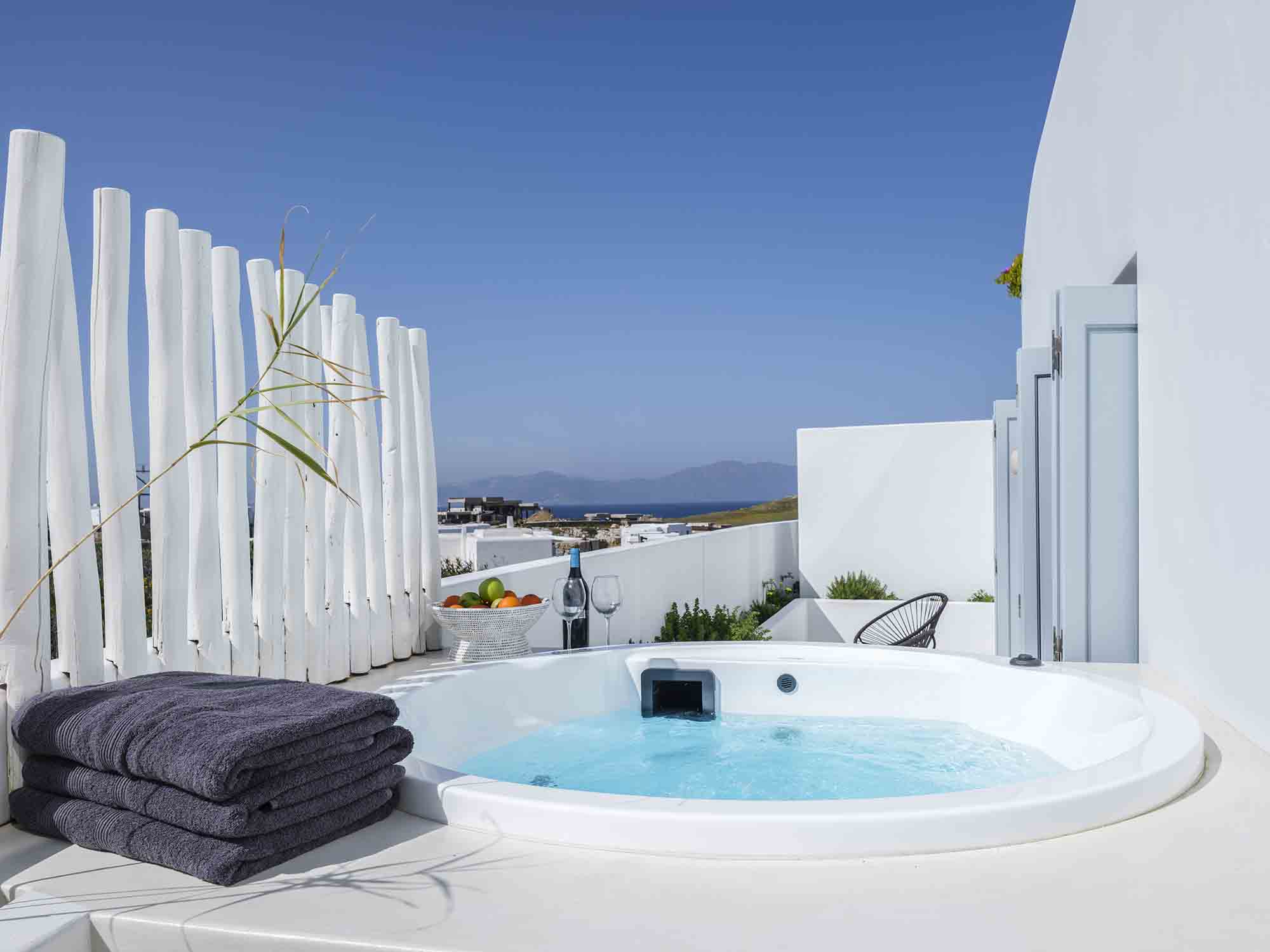 The main villa houses an elegant open-plan living room, a fully equipped designer kitchen with Bocci lighting, and an ensuite bedroom on the ground floor. Upstairs, two elegant ensuite bedrooms open onto private balconies with dazzling sea views, perfect for morning coffee or evening cocktails with the glowing lights of Mykonos Town in the distance. The three detached suites, each with a private entrance, boast their own outdoor patios and private Jacuzzis with uninterrupted views of the Aegean—perfect for romantic evenings or serene solo moments.