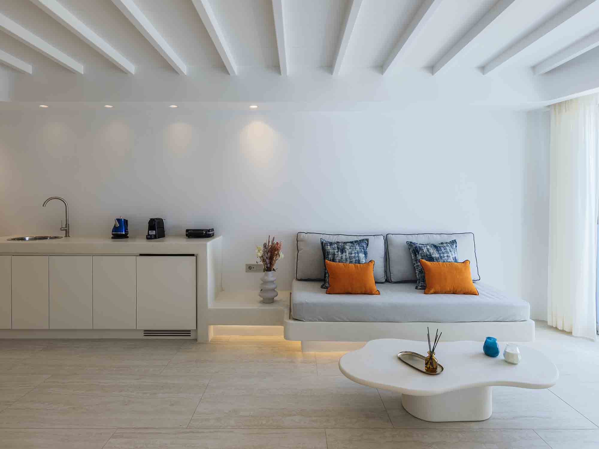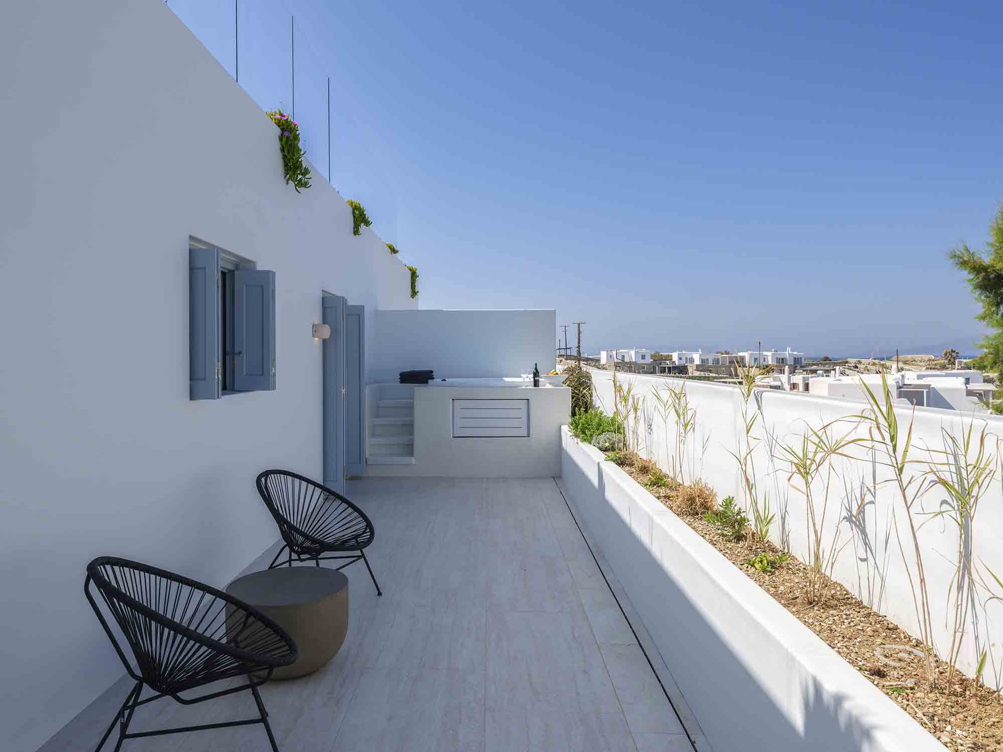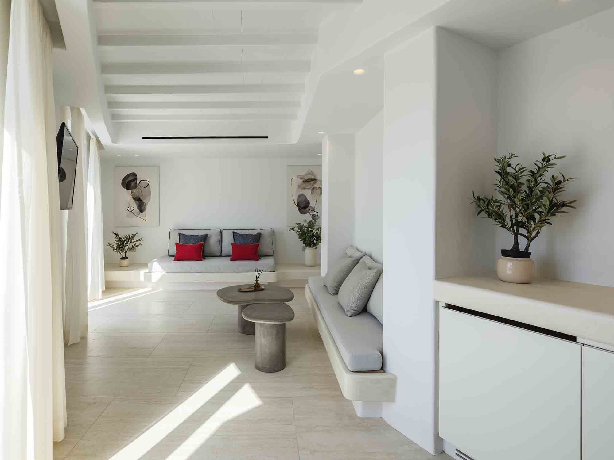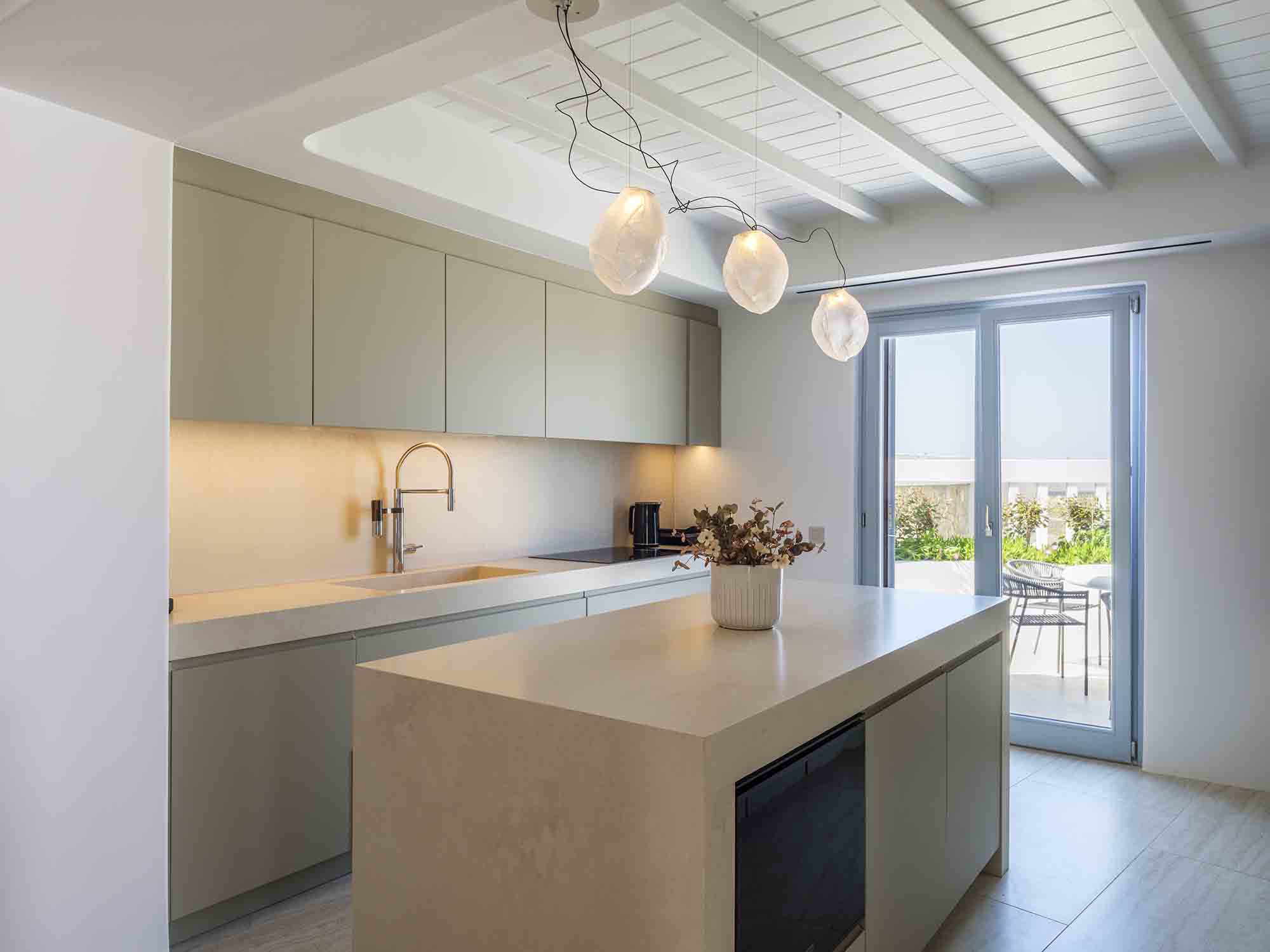 The main villa houses an elegant open-plan living room, a fully equipped designer kitchen with Bocci lighting, and an ensuite bedroom on the ground floor. Upstairs, two elegant ensuite bedrooms open onto private balconies with dazzling sea views, perfect for morning coffee or evening cocktails with the glowing lights of Mykonos Town in the distance. The three detached suites, each with a private entrance, boast their own outdoor patios and private Jacuzzis with uninterrupted views of the Aegean—perfect for romantic evenings or serene solo moments.