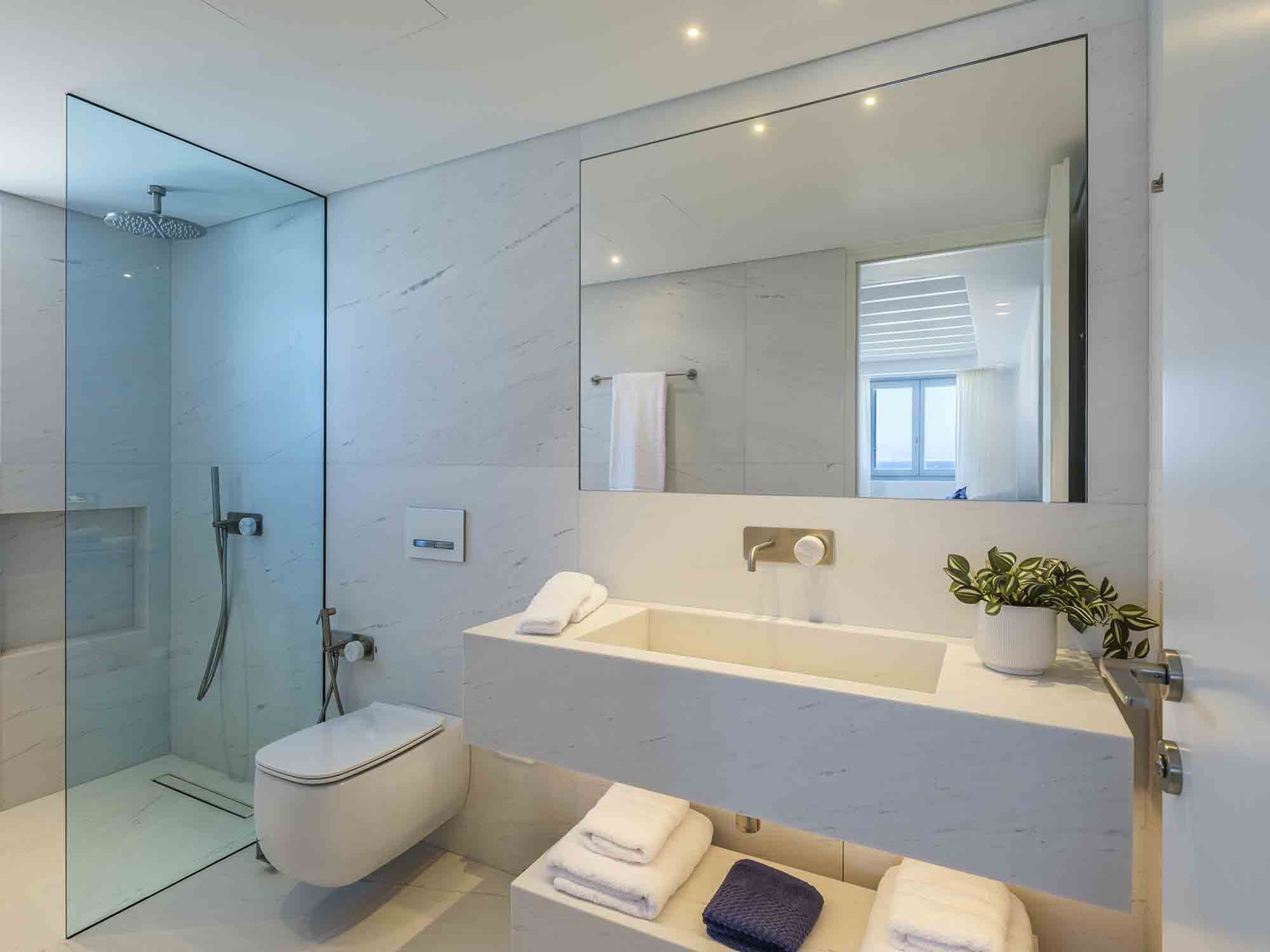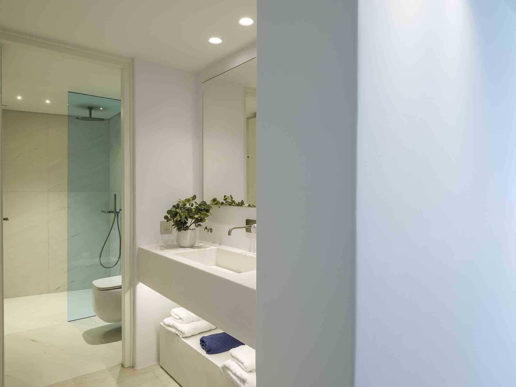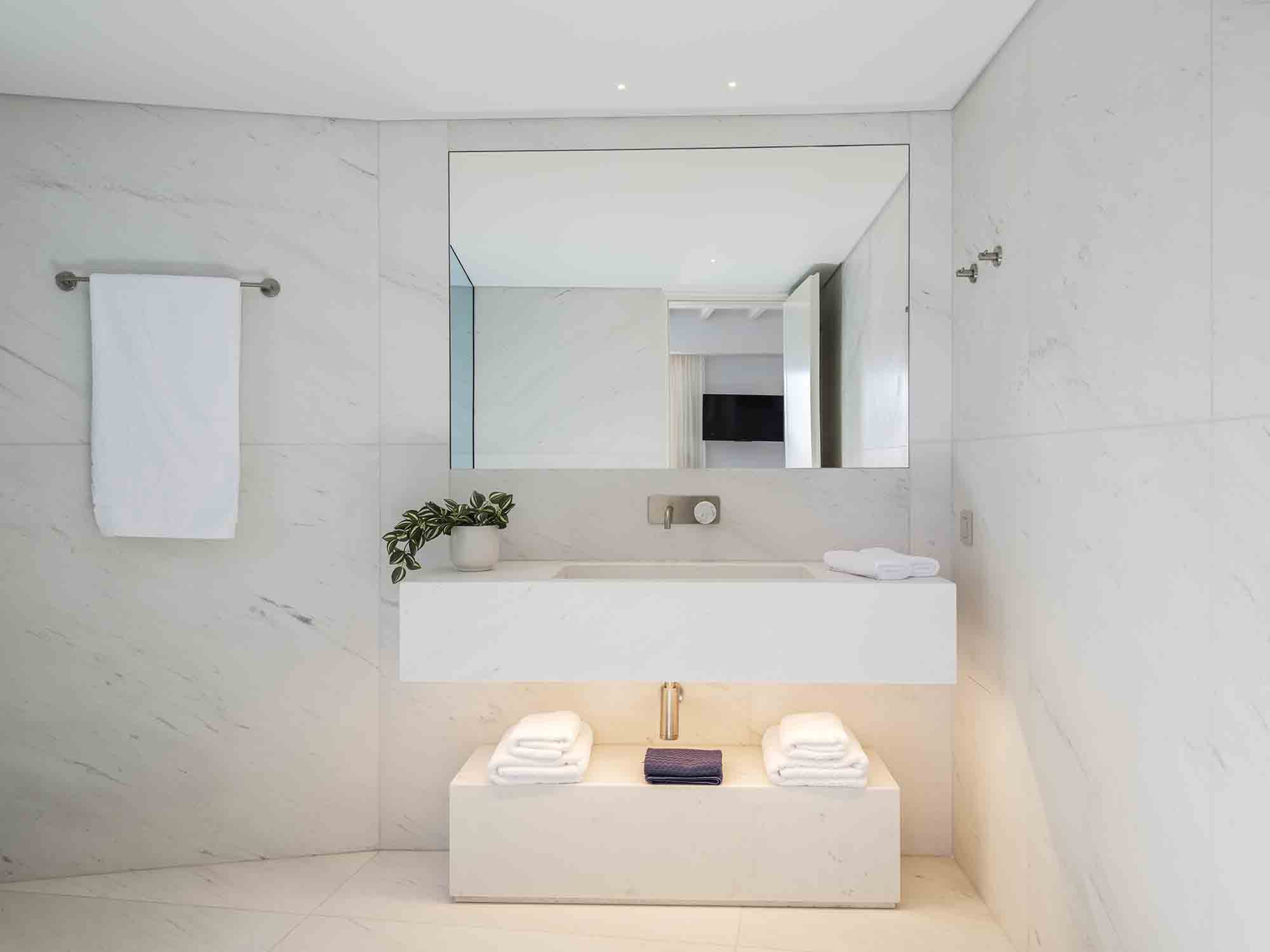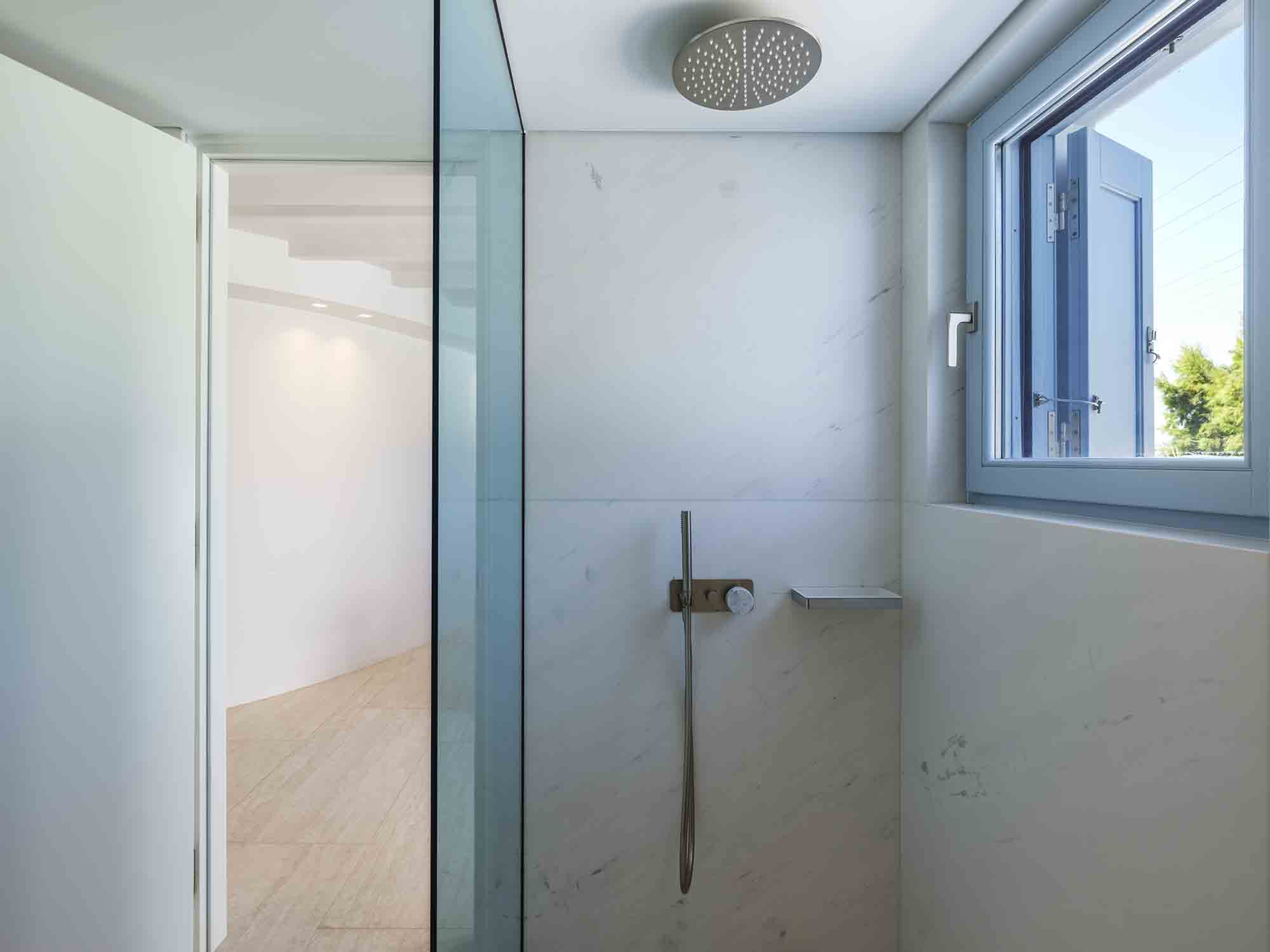 Villa Nandia features 6 ensuite bedrooms with marble bathrooms across two levels and three independent guest suites, comfortably accommodating up to 15 guests (6 beds + 3 single sofa beds, all Coco-Mat).