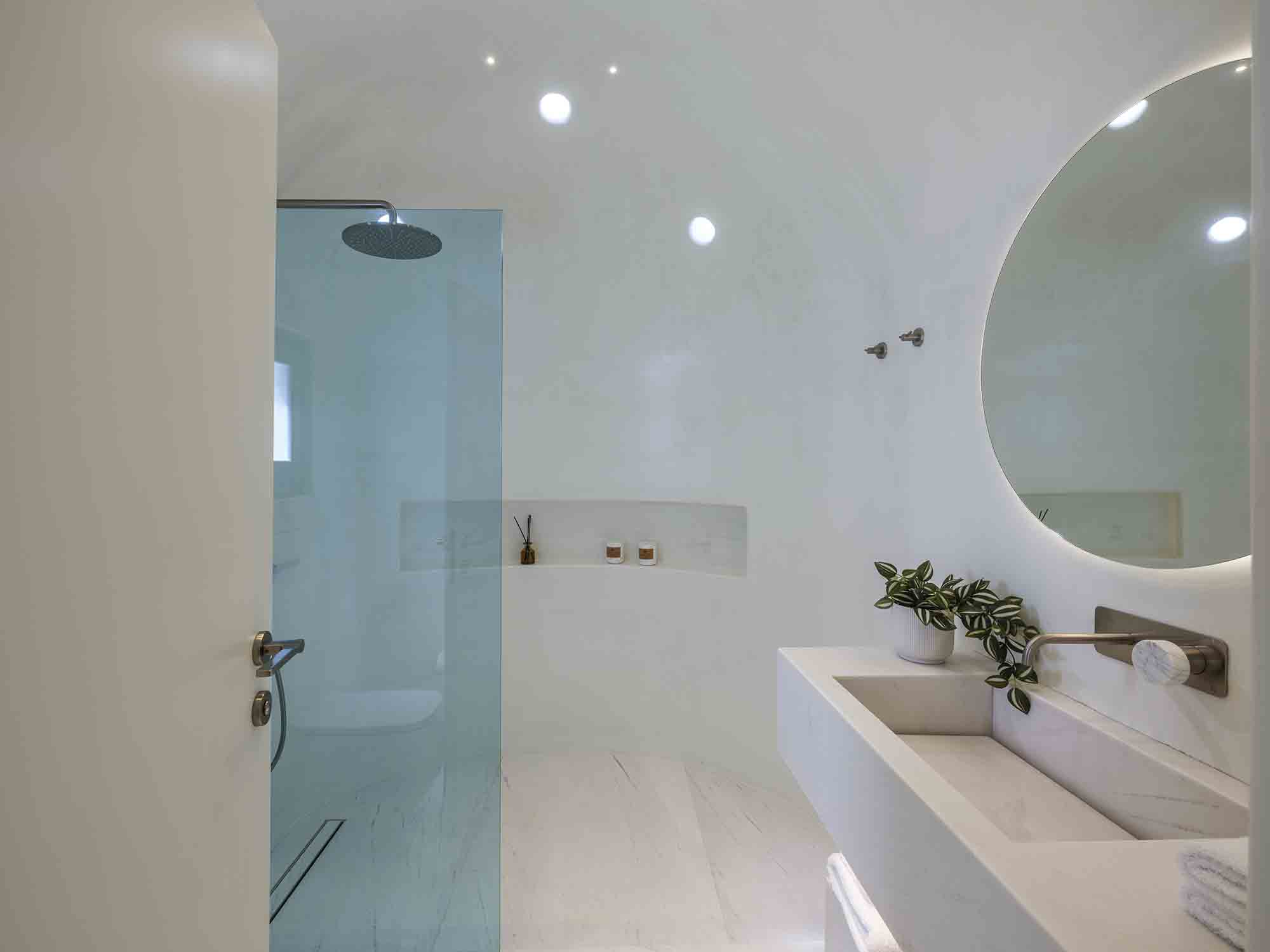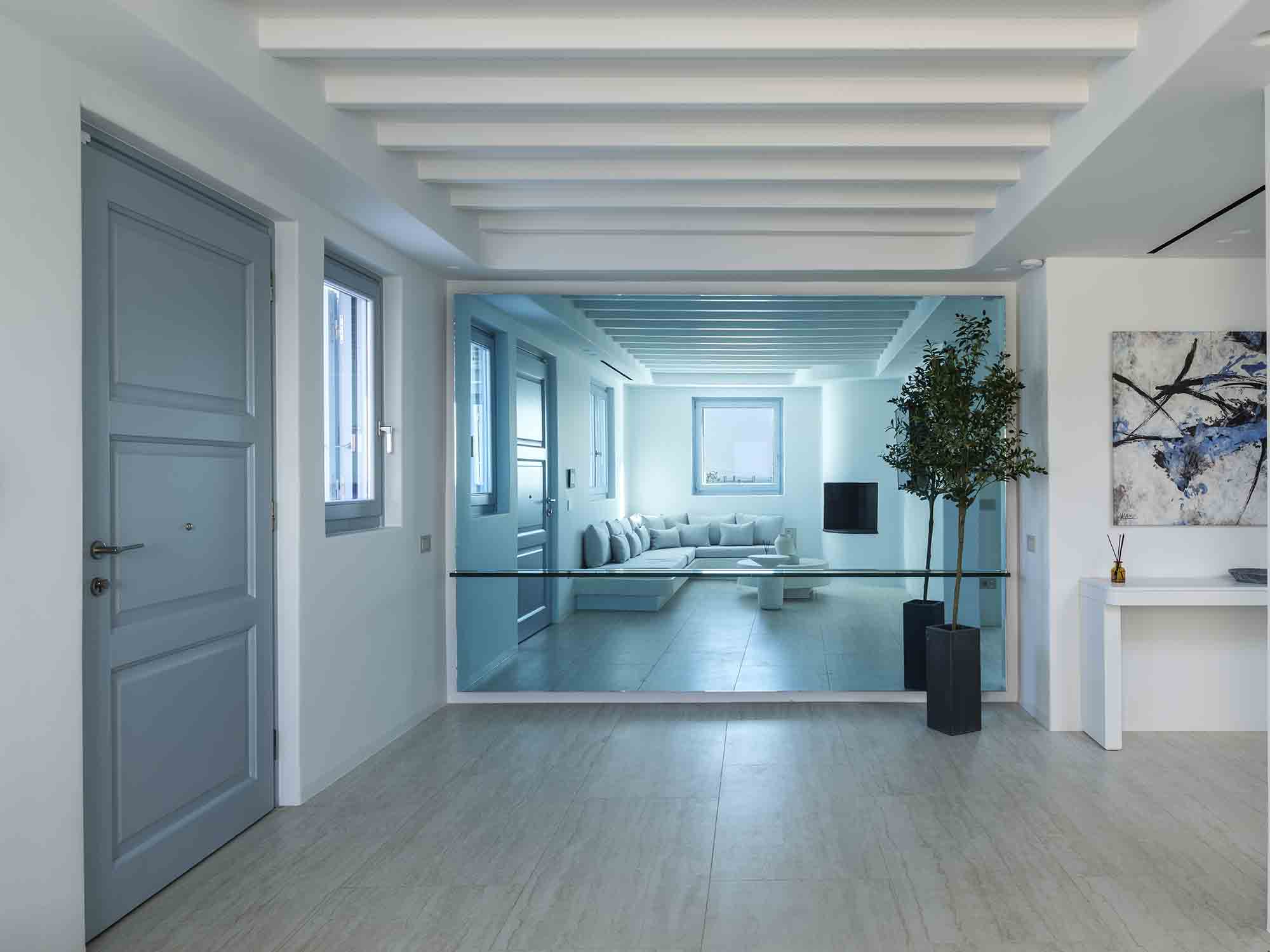 - Open plan fully equipped kitchen with kitchen island and direct access to the outdoor pool area, indoor dining area (6 seats), living room with built-in sofas, smart TV & fireplace, and sea view, guest WC, large mirrors