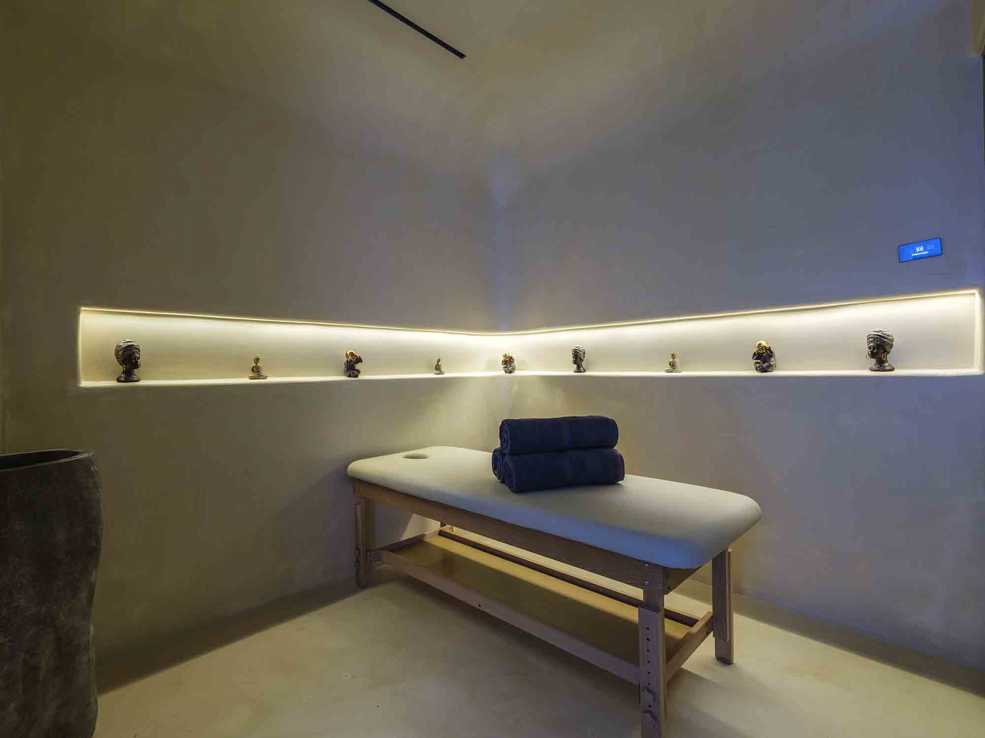 - Dedicated spa area with a massage table and chromotherapy setup to recharge body and mind